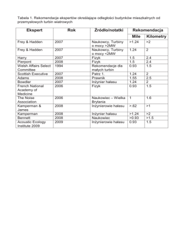 Tabela 1. Rekomendacje ekspertów okreĞlające odległoĞci budynków mieszkalnych od przemysłowych turbin wiatrowych Ekspert Rok ħródło/notatki Rekomendacja Mile Frey & Hadden 2007 Frey & Hadden 2007 Harry Pierpont Welsh Affairs Select Committee Scottish Executive Adams Bowdler French National Academy of Medicine The Noise Association Kamperman & James Kamperman Bennett Acoustic Ecology Institute 2009 2007 2008 1994 Kilometry Naukowcy, Turbiny o mocy >2MW Naukowcy, Turbiny o mocy <2MW Fizyk Fizyk Rekomendacje dla małych turbin Patrz 1. Prawnik InĪynier hałasu Fizyk >1.24 >2 1.24 2 1.5 1.5 0.93 2.4 2.4 1.5 1.24 1.55 1.24 0.93 2 2.5 2 1.5 1 1.6 2008 Naukowiec – Wielka Brytania InĪynierowie hałasu >.62 >1 2008 2008 2009 InĪynier hałasu Naukowiec InĪynierowie hałasu >1.24 >0.93 0.93 >2 >1.5 1.5 2007 2008 2007 2006 2006