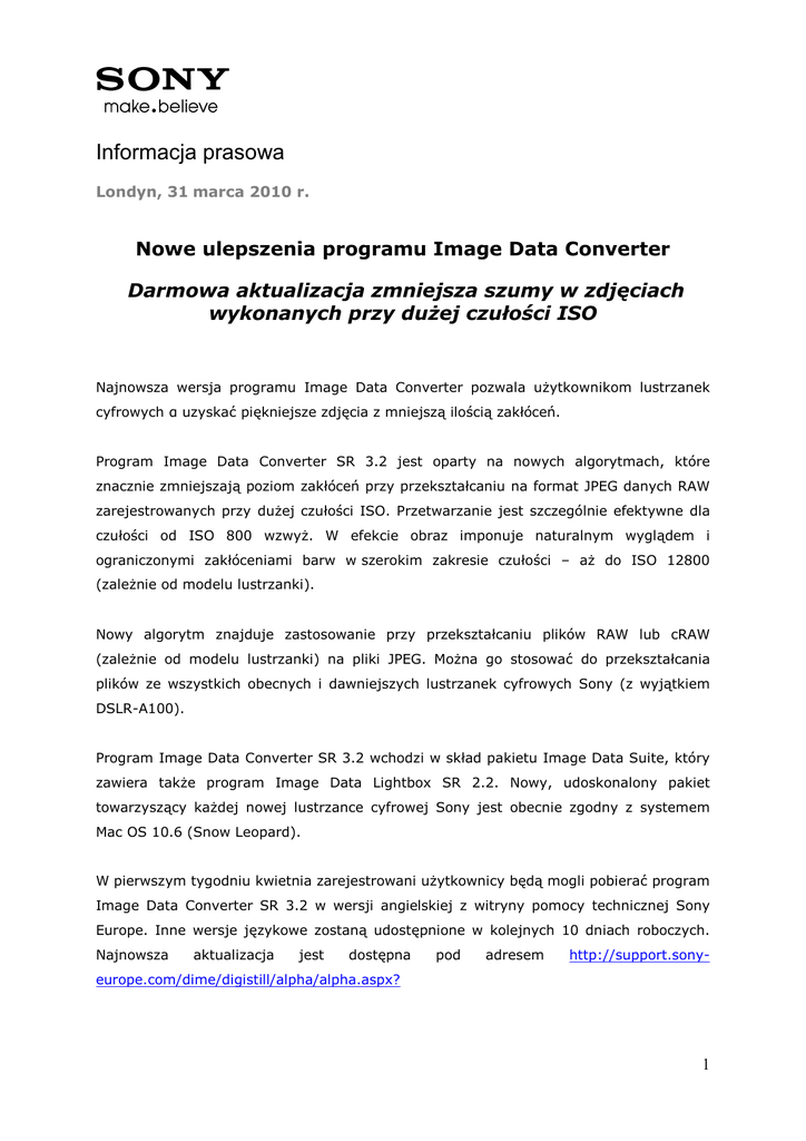 Informacja prasowa Londyn, 31 marca 2010 r. Nowe ulepszenia programu Image Data Converter Darmowa aktualizacja zmniejsza szumy w zdjęciach wykonanych przy dużej czułości ISO Najnowsza wersja programu Image Data Converter pozwala użytkownikom lustrzanek cyfrowych α uzyskać piękniejsze zdjęcia z mniejszą ilością zakłóceń. Program Image Data Converter SR 3.2 jest oparty na nowych algorytmach, które znacznie zmniejszają poziom zakłóceń przy przekształcaniu na format JPEG danych RAW zarejestrowanych przy dużej czułości ISO. Przetwarzanie jest szczególnie efektywne dla czułości od ISO 800 wzwyż. W efekcie obraz imponuje naturalnym wyglądem i ograniczonymi zakłóceniami barw w szerokim zakresie czułości – aż do ISO 12800 (zależnie od modelu lustrzanki). Nowy algorytm znajduje zastosowanie przy przekształcaniu plików RAW lub cRAW (zależnie od modelu lustrzanki) na pliki JPEG. Można go stosować do przekształcania plików ze wszystkich obecnych i dawniejszych lustrzanek cyfrowych Sony (z wyjątkiem DSLR-A100). Program Image Data Converter SR 3.2 wchodzi w skład pakietu Image Data Suite, który zawiera także program Image Data Lightbox SR 2.2. Nowy, udoskonalony pakiet towarzyszący każdej nowej lustrzance cyfrowej Sony jest obecnie zgodny z systemem Mac OS 10.6 (Snow Leopard). W pierwszym tygodniu kwietnia zarejestrowani użytkownicy będą mogli pobierać program Image Data Converter SR 3.2 w wersji angielskiej z witryny pomocy technicznej Sony Europe. Inne wersje językowe zostaną udostępnione w kolejnych 10 dniach roboczych. Najnowsza aktualizacja jest dostępna pod adresem http://support.sony- europe.com/dime/digistill/alpha/alpha.aspx? 1 Dodatkowe informacje są dostępne w przedstawicielstwie Sony Poland: Anna Horczyczak tel.: (22) 5202581 [email protected] UWAGA: 1) Zdjęcia imagowe Udostępniane zdjęcia imagowe mogą być wykorzystywane do ilustracji artykułu o danej grupie produktowej, w której występuje wzmianka, opis, prezentacja produktu Sony. Zdjęcia imagowe NIE MOGĄ być wykorzystywane do reklamy (i na okładkę magazynu). Jakakolwiek ingerencja (zmiana/dodawanie/wycinanie logo czy innych elementów) w zdjęcie imagowe jest zabroniona, ponieważ narusza prawa autorskie. 2) Zasady pisowni wyrazu Sony Wyraz Sony przy opisie produktu powinien być napisany taką samą czcionką jak całe zdanie, przy czym pierwsza litera powinna być wielka a pozostałe małe. Informacja o Sony: Sony jest producentem innowacyjnego sprzętu audio, wideo, telekomunikacyjnego i informatycznego przeznaczonego na rynek masowy i dla odbiorców profesjonalnych. Sony słynie ze swoich urządzeń audiowizualnych, takich jak telewizory LCD High Definition BRAVIA™, cyfrowe aparaty Cyber-shot™, kamery Handycam®, lustrzanki cyfrowe „α” (wym. alfa) i odtwarzacze MP3 Walkman®, jak również z komputerów osobistych VAIO™ i profesjonalnego sprzętu studyjnego o wysokiej rozdzielczości (HD), w tym systemów XDCAM™ HD. Działalność w branży elektronicznej, muzycznej, kinowej, gier i internetowej umożliwia Sony oferowanie pełnego łańcucha wartości HD i zapewnia firmie miejsce w czołówce światowych marek rozrywki cyfrowej. Obecny stan zatrudnienia na całym świecie wynosi około 170 000 osób. Poprzez długoterminowe umowy z organizacjami piłkarskimi – firma jest oficjalnym sponsorem Ligi Mistrzów UEFA do roku 2012, oficjalnym partnerem FIFA do roku 2014 i globalnym sponsorem rozgrywek FIFA World Cup™ w latach 2010 i 2014 – Sony rozbudza emocje wśród milionów fanów futbolu z całego świata. Więcej informacji o Sony Europe można http://www.sony-europe.com i http://www.sony-europe.com/presscenter znaleźć pod adresami „Sony”, „WALKMAN”, „VAIO”, „Cyber-shot”, „Handycam”, „α”, „BRAVIA” i „XDCAM” są zastrzeżonymi znakami handlowymi lub znakami handlowymi Sony Corporation. Wszystkie inne znaki handlowe lub zastrzeżone znaki handlowe stanowią własność odpowiednich właścicieli 2