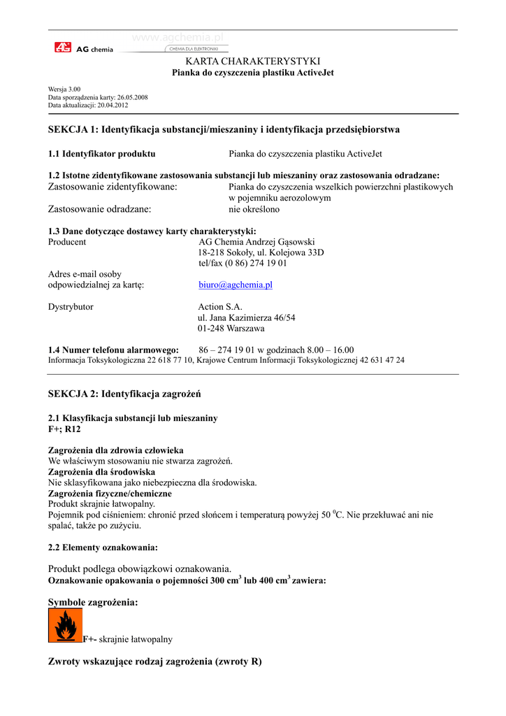 KARTA CHARAKTERYSTYKI Pianka do czyszczenia plastiku ActiveJet Wersja 3.00 Data sporządzenia karty: 26.05.2008 Data aktualizacji: 20.04.2012 SEKCJA 1: Identyfikacja substancji/mieszaniny i identyfikacja przedsiębiorstwa 1.1 Identyfikator produktu Pianka do czyszczenia plastiku ActiveJet 1.2 Istotne zidentyfikowane zastosowania substancji lub mieszaniny oraz zastosowania odradzane: Zastosowanie zidentyfikowane: Pianka do czyszczenia wszelkich powierzchni plastikowych w pojemniku aerozolowym Zastosowanie odradzane: nie określono 1.3 Dane dotyczące dostawcy karty charakterystyki: Producent AG Chemia Andrzej Gąsowski 18-218 Sokoły, ul. Kolejowa 33D tel/fax (0 86) 274 19 01 Adres e-mail osoby odpowiedzialnej za kartę: [email protected] Dystrybutor Action S.A. ul. Jana Kazimierza 46/54 01-248 Warszawa 1.4 Numer telefonu alarmowego: 86 – 274 19 01 w godzinach 8.00 – 16.00 Informacja Toksykologiczna 22 618 77 10, Krajowe Centrum Informacji Toksykologicznej 42 631 47 24 SEKCJA 2: Identyfikacja zagrożeń 2.1 Klasyfikacja substancji lub mieszaniny F+; R12 Zagrożenia dla zdrowia człowieka We właściwym stosowaniu nie stwarza zagrożeń. Zagrożenia dla środowiska Nie sklasyfikowana jako niebezpieczna dla środowiska. Zagrożenia fizyczne/chemiczne Produkt skrajnie łatwopalny. Pojemnik pod ciśnieniem: chronić przed słońcem i temperaturą powyżej 50 0C. Nie przekłuwać ani nie spalać, także po zużyciu. 2.2 Elementy oznakowania: Produkt podlega obowiązkowi oznakowania. Oznakowanie opakowania o pojemności 300 cm3 lub 400 cm3 zawiera: Symbole zagrożenia: F+- skrajnie łatwopalny Zwroty wskazujące rodzaj zagrożenia (zwroty R) KARTA CHARAKTERYSTYKI Pianka do czyszczenia plastiku ActiveJet Brak. Zwroty określające warunki bezpiecznego stosowania: S2 – Chronić przed dziećmi S9 – Przechowywać pojemnik w pomieszczeniu dobrze wentylowanym S16 – Nie przechowywać w pobliżu źródeł zapłonu – nie palić tytoniu S23 – Nie wdychać rozpylonej cieczy S46 – W razie połknięcia niezwłocznie zasięgnij porady lekarza – pokaż opakowanie lub etykietę. Dodatkowe informacje: Pojemnik pod ciśnieniem: chronić przed słońcem i nagrzaniem powyżej temperatury 50°C. Nie przekłuwać ani nie spalać także po zużyciu. Nie rozpylać nad otwartym płomieniem lub żarzącym się materiałem. Chronić przed źródłami zapłonu- nie palić podczas rozpylania. 2.3 Inne zagrożenia: Brak. Brak informacji na temat spełnienia kryteriów PBT lub vPvB zgodnie z załącznikiem XIII rozporządzenia REACH. Odpowiednie badania nie były przeprowadzone. SEKCJA 3: Skład/informacja o składnikach 3.1 Substancje: Nie dotyczy. 3.2 Mieszaniny: Niebezpieczne składniki: Identyfikator produktu Klasyfikacja CLP Kody Klasyfikacja Zawartość zwrotów wg Klasa zagrożenia % 67/548/EWG i kody kategorii wskazujących rodzaj zagrożenia Mieszanina propanu i butanu Nr CAS: 106-97-8/74-98-6 Nr WE: 203-448-7/200-827-9 Nr indeksowy: 601-003-00Flam. Gas 1 13-15 H220 5/601-004-00-0 F+; R12 Press. Gas Nr REACH: substancja podlega przepisom okresu przejściowego Alkohol izopropylowy Nr CAS: 67-63-0 F; R11, Flam. Liq. 2 H225 Nr WE: 200-661-7 Ok. 8 Eye Irrit. 2 H319 Nr indeksowy: 603-108-00-1 Nr REACH: substancja podlega STOT SE 3 H336 Xi; R36 przepisom okresu R67 przejściowego Wykaz symboli wskazujących kategorię niebezpieczeństwa oraz zwrotów R i H, które zamieszczono w sekcji 3 karty charakterystyki oraz pełne ich brzmienie zamieszczono w sekcji 16 niniejszej karty charakterystyki. Zwroty R i H odnoszą się do składników mieszaniny. KARTA CHARAKTERYSTYKI Pianka do czyszczenia plastiku ActiveJet SEKCJA 4: Środki pierwszej pomocy 4.1 Opis środków pierwszej pomocy W przypadku kontaktu ze skórą: Zanieczyszczoną skórę przemyć dużą ilością wody. Jeśli podrażnienie skóry utrzymuje się zapewnić opiekę medyczną. W przypadku kontaktu z oczami: Oczy płukać dużą ilością wody ok. 15 min., skonsultować się z lekarzem. Narażenie inhalacyjne: W razie zawrotów głowy lub nudności wyprowadzić poszkodowanego na świeże powietrze, w razie braku szybkiej poprawy zasięgnąć porady lekarza. W przypadku połknięcia: Narażenie tą drogą jest bardzo mało prawdopodobne – produkt w postaci aerozolu. Wypić dużą ilość wody, nie powodować wymiotów, skonsultować się z lekarzem. 4.2 Najważniejsze ostre i opóźnione objawy oraz skutki narażenia: Kontakt ze skórą: długotrwałe lub powtarzające się narażenie może powodować wysuszanie i pękanie skóry. Kontakt z oczami: łzawienie. Układ oddechowy: podrażnienie błon śluzowych górnych dróg oddechowych. 4.3 Wskazania dotyczące wszelkiej natychmiastowej pomocy lekarskiej i szczególnego postępowania z poszkodowanym: Decyzję o sposobie postępowania podejmuje lekarz po ocenie stanu poszkodowanego. SEKCJA 5: Postępowanie w przypadku pożaru 5.1 Środki gaśnicze Odpowiednie środki gaśnicze Woda – rozproszone prądy wodne, piana odporna na alkohol, dwutlenek węgla, proszki gaśnicze. Niewłaściwe środki gaśnicze: Nie stosować zwartych strumieni wody. 5.2 Szczególne zagrożenia związane z substancją lub mieszaniną: Skrajnie łatwopalna ciecz. Woda może być nieskutecznym środkiem gaśniczym. Powinna być użyta w celu ochłodzenia pojemników z preparatem, aby zapobiec wybuchowi. Pary mogą przemieszczać się wzdłuż podłoża do źródła zapłonu i spowodować wsteczny ciąg płomienia. Zbiorniki narażone na działanie ognia lub wysokiej temperatury chłodzić wodą z bezpiecznej odległości; jeśli to możliwe, usunąć je z obszaru zagrożenia (groźba wybuchu). W wyniku spalania mogą powstawać tlenki węgla (CO, CO2). 5.3 Informacje dla straży pożarnej Nie dopuścić do przedostania się środków gaśniczych do kanalizacji i cieków wodnych. Zawiadomić otoczenie o pożarze. Usunąć z obszaru zagrożenia wszystkie osoby niebiorące udziału w likwidowaniu pożaru. Powiadomić Państw