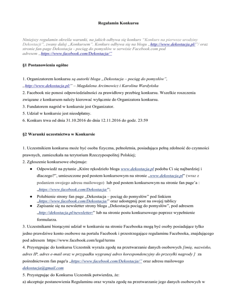 Regulamin Konkursu Niniejszy regulamin określa warunki, na jakich odbywa się konkurs “Konkurs na pierwsze urodziny Dekostacji”, zwany dalej „Konkursem”. Konkurs odbywa się na blogu „http://www.dekostacja.pl/”/ oraz stronie fan-page Dekostacja - pociąg do pomysłów w serwisie Facebook.com pod adresem „https://www.facebook.com/Dekostacja/” §1 Postanowienia ogólne 1. Organizatorem konkursu są autorki bloga „Dekostacja – pociąg do pomysłów”, „http://www.dekostacja.pl/” – Magdalena Arcimowicz i Karolina Wardyńska 2. Facebook nie ponosi odpowiedzialności za prawidłowy przebieg konkursu. Wszelkie roszczenia związane z konkursem należy kierować wyłącznie do Organizatora konkursu. 3. Fundatorem nagród w konkursie jest Organizator. 5. Udział w konkursie jest nieodpłatny. 6. Konkurs trwa od dnia 31.10.2016 do dnia 12.11.2016 do godz. 23:59 §2 Warunki uczestnictwa w Konkursie 1. Uczestnikiem konkursu może być osoba fizyczna, pełnoletnia, posiadająca pełną zdolność do czynności prawnych, zamieszkała na terytorium Rzeczypospolitej Polskiej; 2. Zgłoszenie konkursowe obejmuje: ● Odpowiedź na pytanie „Które rękodzieło bloga www.dekostacja.pl podoba Ci się najbardziej i dlaczego?”, umieszczone pod postem konkursowym na stronie „www.dekostacja.pl” (wraz z podaniem swojego adresu mailowego) lub pod postem konkursowym na stronie fan page’a : „https://www.facebook.com/Dekostacja/”; ● ● Polubienie strony fan page „Dekostacja – pociąg do pomysłów” pod linkiem „https://www.facebook.com/Dekostacja/” oraz udostępnij post na swojej tablicy Zapisanie się na newsletter strony bloga „Dekostacja pociąg do pomysłów”, pod adresem „http://dekostacja.pl/newsletter/” lub na stronie postu konkursowego poprzez wypełnienie formularza. 3. Uczestnikami biorącymi udział w konkursie na stronie Facebooka mogą być osoby posiadające tylko jedno prawdziwe konto osobowe na portalu Facebook i przestrzegające regulaminu Facebooka, znajdującego pod adresem https://www.facebook.com/legal/terms 4. Przystępując do konkursu Uczestnik wyraża zgodę na przetwarzanie danych osobowych [imię, nazwisko, adres IP, adres e-mail oraz w przypadku wygranej adres korespondencyjny do przesyłki nagrody ] za pośrednictwem fan page'a „https://www.facebook.com/Dekostacja/” oraz adresu mailowego [email protected] 5. Przystępując do Konkursu Uczestnik potwierdza, że: a) akceptuje postanowienia Regulaminu oraz wyraża zgodę na przetwarzanie jego danych osobowych w zakresie i w celach wskazanych w Regulaminie, b) zwalnia Facebook z wszelkiej odpowiedzialności związanej z konkursem (w przypadku komentarza na fan page „https://www.facebook.com/Dekostacja/”). 6.Uczestnik Konkursu wyraża zgodę na opublikowanie jego odpowiedzi oraz zdjęć na stronie Konkursowej, podpisanej imieniem i nazwiskiem użytym przez Uczestnika w jego Profilu. 7. W Konkursie zwycięży 4 autorów najciekawszych odpowiedzi. Zwycięzcy zostaną poinformowani poprzez oznaczenie na tablicy fan page „https://www.facebook.com/Dekostacja/” na Facebooku w poście „Rozstrzygnięcie Konkursu” i w poście „Rozstrzygnięcie konkursu” na stronie „www.dekostacja.pl”. Dane osobowe, zawierające również adres do wysyłki zwycięzcy przekażą na e-mail organizatora : [email protected] do dnia 16.11.2016. 8. Najpóźniej w dniu 14.11.2016 do godziny 20.00 zostaną opublikowane wyniki konkursu. §4 Nagrody 1. Nagrodami w konkursie są: ● 1 miejsce – Ręcznie szyta poduszka w kształcie chmury wykonana przez Organizatora; ● 2 miejsce – Dekoracyjna szkatułka drewniana wykonana przez Organizatora; ● 3 miejsce –Deseczka do powieszenia z motywem wykonana przez Organizatora; ● 4 miejsce – Świeczka żelowa ozdobna wykonana przez Organizatora. 2. Jury (autorki bloga „Dekostacja – pociąg do pomysłów” – Magdalena Arcimowicz, Karolina Wardyńska) będzie oceniało przede wszystkim: a) zgodność zgłoszenia z tematyką konkursu, b) spełnienie wszystkich warunków konkursu; c) oryginalność i kreatywność zgłoszenia. 3. Nagrody zostaną wysłane do Laureatów drogą pocztową na koszt Organizatora w przeciągu 14 dni od daty do ogłoszenia wyników tj.14.11.216. 4.Nagrody nie podlegają wymianie na ekwiwalent finansowy. 5.Wynik Konkursu jest ostateczny i nie podlega zaskarżeniu. 6.Zobowiązanie Organizatora do przekazania nagród wskazanych w niniejszym Regulaminie obejmuje tylko i wyłącznie terytorium Rzeczpospolitej Polskiej. 7.Organizator nie ponosi odpowiedzialności za niezawinione przez Organizatora działania Poczty Polskiej. 8.Organizator nie ponosi odpowiedzialności za niedostarczenie nagrody wynikające z przyczyn po stronie Uczestnika. 9.Nagrody w niniejszym konkursie nie przekraczają wartości 759 zł. Zgodnie z art. 21. Ust. 1 pkt 68 Ustawy o podatku dochodowym od osób fizycznych, nagrody te są zwolnione z obowiązku pobrania i opłacenia podatku dochodowego. §5 Prawa Autorskie i inne 1. Uczestnik Konkursu zaświadcza i gwarantuje, że jest jedynym autorem odpowiedzi na zadanie konkursowe i jedynym podmiotem uprawnionym pod kątem praw autorskich do tych odpowiedzi zarówno w formie tekstowej, jak i graficznej oraz że nie naruszają one praw osób trzecich. 2. Organizator zastrzega sobie prawo do weryfikacji kont użytkowników, prac, głosów i komentarzy oraz do usuwania ich bez podania przyczyny. 3. W szczególnych przypadkach Organizator zastrzega sobie prawo do unieważnienia konkursu. §6 Postanowienia końcowe 1.W kwestiach nieuregulowanych niniejszym Regulaminem stosuje się przepisy Kodeksu Cywilnego, ustawy o prawie autorskim i prawach pokrewnych i inne obowiązujące przepisy prawa polskiego. 2.Uczestnik ponosi pełną i wyłączną odpowiedzialność za naruszenie praw osób trzecich, naruszenie powszechnie obowiązujących praw, praw autorskich, prawa do wizerunku osób trzecich w udzielonej Odpow