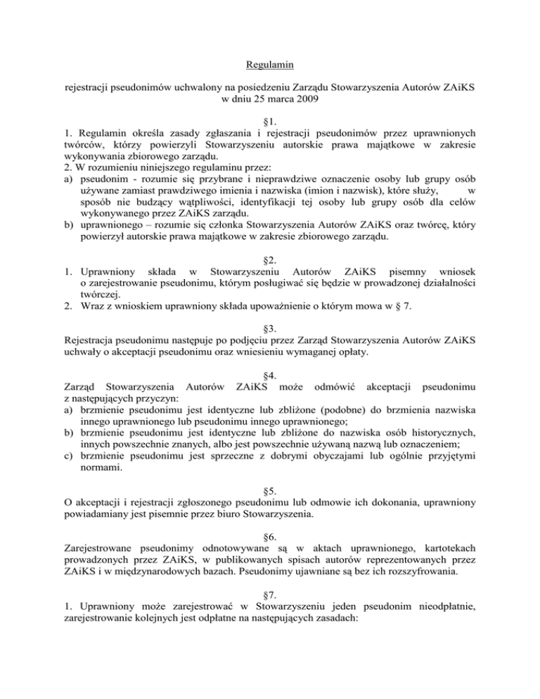 Regulamin rejestracji pseudonimów uchwalony na posiedzeniu Zarządu Stowarzyszenia Autorów ZAiKS w dniu 25 marca 2009 §1. 1. Regulamin określa zasady zgłaszania i rejestracji pseudonimów przez uprawnionych twórców, którzy powierzyli Stowarzyszeniu autorskie prawa majątkowe w zakresie wykonywania zbiorowego zarządu. 2. W rozumieniu niniejszego regulaminu przez: a) pseudonim - rozumie się przybrane i nieprawdziwe oznaczenie osoby lub grupy osób uŜywane zamiast prawdziwego imienia i nazwiska (imion i nazwisk), które słuŜy, w sposób nie budzący wątpliwości, identyfikacji tej osoby lub grupy osób dla celów wykonywanego przez ZAiKS zarządu. b) uprawnionego – rozumie się członka Stowarzyszenia Autorów ZAiKS oraz twórcę, który powierzył autorskie prawa majątkowe w zakresie zbiorowego zarządu. §2. 1. Uprawniony składa w Stowarzyszeniu Autorów ZAiKS pisemny wniosek o zarejestrowanie pseudonimu, którym posługiwać się będzie w prowadzonej działalności twórczej. 2. Wraz z wnioskiem uprawniony składa upowaŜnienie o którym mowa w § 7. §3. Rejestracja pseudonimu następuje po podjęciu przez Zarząd Stowarzyszenia Autorów ZAiKS uchwały o akceptacji pseudonimu oraz wniesieniu wymaganej opłaty. §4. Zarząd Stowarzyszenia Autorów ZAiKS moŜe odmówić akceptacji pseudonimu z następujących przyczyn: a) brzmienie pseudonimu jest identyczne lub zbliŜone (podobne) do brzmienia nazwiska innego uprawnionego lub pseudonimu innego uprawnionego; b) brzmienie pseudonimu jest identyczne lub zbliŜone do nazwiska osób historycznych, innych powszechnie znanych, albo jest powszechnie uŜywaną nazwą lub oznaczeniem; c) brzmienie pseudonimu jest sprzeczne z dobrymi obyczajami lub ogólnie przyjętymi normami. §5. O akceptacji i rejestracji zgłoszonego pseudonimu lub odmowie ich dokonania, uprawniony powiadamiany jest pisemnie przez biuro Stowarzyszenia. §6. Zarejestrowane pseudonimy odnotowywane są w aktach uprawnionego, kartotekach prowadzonych przez ZAiKS, w publikowanych spisach autorów reprezentowanych przez ZAiKS i w międzynarodowych bazach. Pseudonimy ujawniane są bez ich rozszyfrowania. §7. 1. Uprawniony moŜe zarejestrować w Stowarzyszeniu jeden pseudonim nieodpłatnie, zarejestrowanie kolejnych jest odpłatne na następujących zasadach: - za zarejestrowanie drugiego i trzeciego pseudonimu – uprawniony zobowiązany jest do wniesienia opłaty w wysokości 200 zł; - za zarejestrowanie czwartego i kolejnych pseudonimów - uprawniony zobowiązany jest do wniesienia opłaty w wysokości 400 zł; 2. Zarząd Stowarzyszenia ma prawo zmiany wysokości opłat ustalonych w pkt.1, lecz nie częściej niŜ jeden raz w roku kalendarzowym. 3. Wraz z wnioskiem o rejestrację pseudonimu uprawniony składa pisemne oświadczenie, upowaŜniające Stowarzyszenie Autorów ZAiKS, do potrącania opłat za zarejestrowane pseudonimy z bieŜących wpływów na konto autorskie. Wzór oświadczenia stanowi załącznik do regulaminu. §8. Opłaty, o których mowa w § 7 pkt 1 dotyczą wyłącznie osób wymienionych w § 1 pkt 2b. §9. W sprawach nieuregulowanych niniejszym regulaminem, indywidualne decyzje podejmuje Prezydium Zarządu Stowarzyszenia Autorów ZAiKS. §10. Regulamin wchodzi w Ŝycie z dniem 1 lipca 2009 i ma zastosowanie do pseudonimów zgłoszonych do rejestracji po tej dacie. Sekretarz Przewodniczący Załącznik do regulaminu Dane osobowe: ....................................................................................................................................................... Imię (imiona) i nazwisko ....................................................................................................................................................... Adres zamieszkania ....................................................................................................................................................... Adres korespondencyjny Oświadczenie W związku z rejestracją pseudonimu, .................................................................................... niniejszym oświadczam, Ŝe znane mi są przepisy regulaminu rejestracji pseudonimów. Równocześnie zezwalam na potrącenie regulaminowych opłat z mojego konta autorskiego. data ................................... podpis.............................