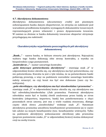 Akredytywa dokumentowa — fragment podręcznika: Adam Salomon, Spedycja w handlu morskim. Procedury i dokumenty, Wydawnictwo Uniwersytetu Gdaoskiego, Gdaosk 2003, s.320–321. 4.7. Akredytywa dokumentowa Akredytywa dokumentowa (documentary credit) jest pisemnym zobowiązaniem banku danym eksporterowi, że otrzyma on należność pod warunkiem przedłożenia kompletu wymaganych dokumentów towarowych reprezentujących prawo własności i prawo dysponowania towarem. W zamian za złożone w banku dokumenty towarowe eksporter otrzymuje przysługującą mu należność. Charakterystyka wypełniania poszczególnych pól akredytywy dokumentowej „Bank..." - nazwa banku, w którym otwarta jest akredytywa. Najczęściej wyboru tego banku dokonują obie strony kontraktu, a wynika on bezpośrednio z jego postanowień. „kontrakt nr..." - numer zawartego kontraktu „pole dotyczące potwierdzenia akredytywy" - stawiając znak „X" w odpowiedniej kratce określa się, czy akredytywa ma być potwierdzona, czy nie potwierdzona. Kwestia ta jest o tyle istotna, że za potwierdzenie banki pobierają prowizję, a więc na podstawie warunków zawartego kontraktu należy oznaczyć, na czyj koszt ma być ono dokonane (nasz czy beneficjenta). „pole określające, czy akredytywa ma być nieodwołalna i przenośna" – stawiając znak „X" w odpowiedniej kratce określa się, czy akredytywa ma być odwołalna/nieodwołalna i/lub przenośna. Ponieważ akredytywa odwołalna może być w każdej chwili anulowana przez każdą ze stron kontraktu (eksportera, importera, bank) bez poinformowania o chęci pozostałych stron umowy, jest ona o wiele rzadziej stosowana, dlatego często obok słowa „nieodwołalna" widnieje znak „X". Natomiast akredytywa przenośna umożliwia beneficjentowi przeniesienie jej w części lub całości na innych beneficjentów (tzw. beneficjentów wtórnych). Tylko na podstawie akredytywy jednoznacznie określonej jako przenośna (poprzez postawienie znaku „X" w odpowiedniej kratce) można dokonywać cesji na osoby trzecie. Strona 1 z 1