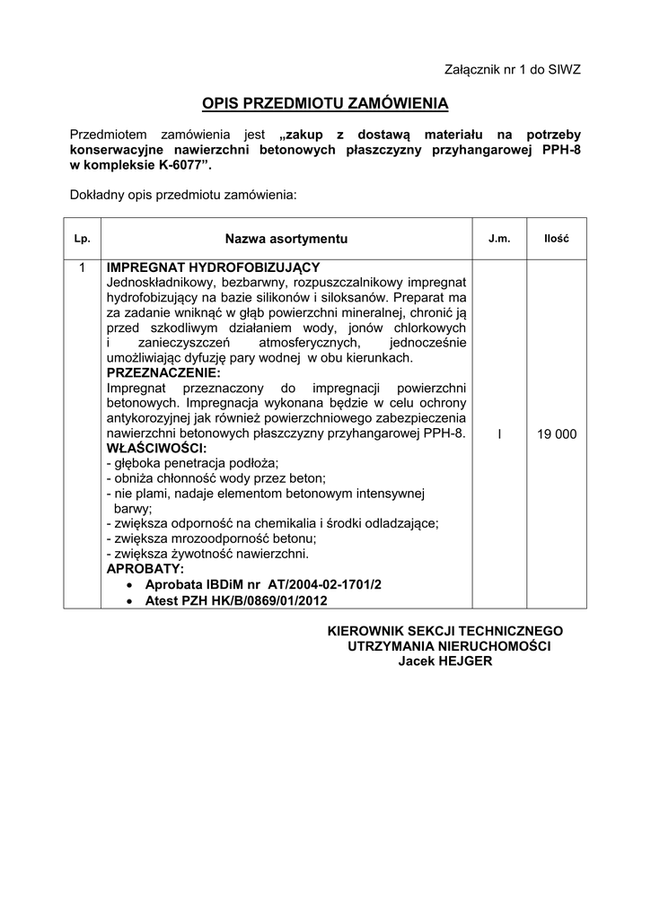 Załącznik nr 1 do SIWZ OPIS PRZEDMIOTU ZAMÓWIENIA Przedmiotem zamówienia jest „zakup z dostawą materiału na potrzeby konserwacyjne nawierzchni betonowych płaszczyzny przyhangarowej PPH-8 w kompleksie K-6077”. Dokładny opis przedmiotu zamówienia: Lp. Nazwa asortymentu J.m. Ilość 1 IMPREGNAT HYDROFOBIZUJĄCY Jednoskładnikowy, bezbarwny, rozpuszczalnikowy impregnat hydrofobizujący na bazie silikonów i siloksanów. Preparat ma za zadanie wniknąć w głąb powierzchni mineralnej, chronić ją przed szkodliwym działaniem wody, jonów chlorkowych i zanieczyszczeń atmosferycznych, jednocześnie umożliwiając dyfuzję pary wodnej w obu kierunkach. PRZEZNACZENIE: Impregnat przeznaczony do impregnacji powierzchni betonowych. Impregnacja wykonana będzie w celu ochrony antykorozyjnej jak również powierzchniowego zabezpieczenia nawierzchni betonowych płaszczyzny przyhangarowej PPH-8. WŁAŚCIWOŚCI: - głęboka penetracja podłoża; - obniża chłonność wody przez beton; - nie plami, nadaje elementom betonowym intensywnej barwy; - zwiększa odporność na chemikalia i środki odladzające; - zwiększa mrozoodporność betonu; - zwiększa żywotność nawierzchni. APROBATY: Aprobata IBDiM nr AT/2004-02-1701/2 Atest PZH HK/B/0869/01/2012 l 19 000 KIEROWNIK SEKCJI TECHNICZNEGO UTRZYMANIA NIERUCHOMOŚCI Jacek HEJGER