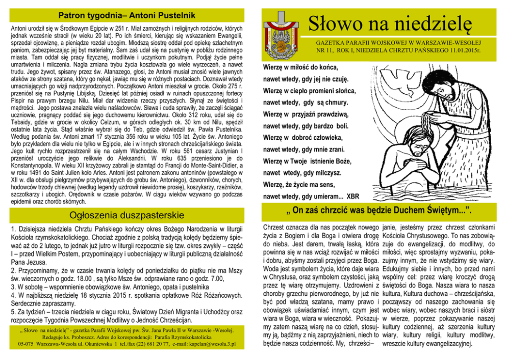 Patron tygodnia– Antoni Pustelnik Antoni urodził się w Środkowym Egipcie w 251 r. Miał zamożnych i religijnych rodziców, których jednak wcześnie stracił (w wieku 20 lat). Po ich śmierci, kierując się wskazaniem Ewangelii, sprzedał ojcowiznę, a pieniądze rozdał ubogim. Młodszą siostrę oddał pod opiekę szlachetnym paniom, zabezpieczając jej byt materialny. Sam zaś udał się na pustynię w pobliżu rodzinnego miasta. Tam oddał się pracy fizycznej, modlitwie i uczynkom pokutnym. Podjął życie pełne umartwienia i milczenia. Nagła zmiana trybu życia kosztowała go wiele wyrzeczeń, a nawet trudu. Jego żywot, spisany przez św. Atanazego, głosi, że Antoni musiał znosić wiele jawnych ataków ze strony szatana, który go nękał, jawiąc mu się w różnych postaciach. Doznawał wtedy umacniających go wizji nadprzyrodzonych. Początkowo Antoni mieszkał w grocie. Około 275 r. przeniósł się na Pustynię Libijską. Dziesięć lat później osiadł w ruinach opuszczonej fortecy Pispir na prawym brzegu Nilu. Miał dar widzenia rzeczy przyszłych. Słynął ze świętości i mądrości. Jego postawa znalazła wielu naśladowców. Sława i cuda sprawiły, że zaczęli ściągać uczniowie, pragnący poddać się jego duchowemu kierownictwu. Około 312 roku, udał się do Tebaidy, gdzie w grocie w okolicy Celzum, w górach odległych ok. 30 km od Nilu, spędził ostatnie lata życia. Stąd właśnie wybrał się do Teb, gdzie odwiedził św. Pawła Pustelnika. Według podania św. Antoni zmarł 17 stycznia 356 roku w wieku 105 lat. Życie św. Antoniego było przykładem dla wielu nie tylko w Egipcie, ale i w innych stronach chrześcijańskiego świata. Jego kult rychło rozprzestrzenił się na całym Wschodzie. W roku 561 cesarz Justynian I przeniósł uroczyście jego relikwie do Aleksandrii. W roku 635 przeniesiono je do Konstantynopola. W wieku XII krzyżowcy zabrali je stamtąd do Francji do Monte-Saint-Didier, a w roku 1491 do Saint Julien koło Arles. Antoni jest patronem zakonu antoninów (powstałego w XII w. dla obsługi pielgrzymów przybywających do grobu św. Antoniego), dzwonników, chorych, hodowców trzody chlewnej (według legendy uzdrowił niewidome prosię), koszykarzy, rzeźników, szczotkarzy i ubogich. Orędownik w czasie pożarów. W ciągu wieków wzywano go podczas epidemii oraz chorób skórnych. Ogłoszenia duszpasterskie 1. Dzisiejsza niedziela Chrztu Pańskiego kończy okres Bożego Narodzenia w liturgii Kościoła rzymskokatolickiego. Chociaż zgodnie z polską tradycją kolędy będziemy śpiewać aż do 2 lutego, to jednak już jutro w liturgii rozpocznie się tzw. okres zwykły – część I – przed Wielkim Postem, przypominający i uobecniający w liturgii publiczną działalność Pana Jezusa. 2. Przypominamy, że w czasie trwania kolędy od poniedziałku do piątku nie ma Mszy św. wieczornych o godz. 18.00 , są tylko Msze św. odprawiane rano o godz. 7.00, 3. W sobotę – wspomnienie obowiązkowe św. Antoniego, opata i pustelnika 4. W najbliższą niedzielę 18 stycznia 2015 r. spotkania opłatkowe Róż Różańcowych. Serdecznie zapraszamy. 5. Za tydzień – trzecia niedziela w ciągu roku, Światowy Dzień Migranta i Uchodźcy oraz rozpoczęcie Tygodnia Powszechnej Modlitwy o Jedność Chrześcijan. „ Słowo na niedzielę” - gazetka Parafii Wojskowej pw. Św. Jana Pawła II w Warszawie -Wesołej. Redaguje ks. Proboszcz. Adres do korespondencji: Parafia Rzymskokatolicka 05-075 Warszawa-Wesoła ul. Okuniewska 1 tel./fax (22) 681 20 77, e-mail: kapelan@wesoła.3.pl Słowo na niedzielę GAZETKA PARAFII WOJSKOWEJ W WARSZAWIE-WESOŁEJ NR 11, ROK I, NIEDZIELA CHRZTU PAŃSKIEGO 11.01.2015r. Wierzę w miłość do końca, nawet wtedy, gdy jej nie czuję. Wierzę w ciepło promieni słońca, nawet wtedy, gdy są chmury. Wierzę w przyjaźń prawdziwą, nawet wtedy, gdy bardzo boli. Wierzę w dobroć człowieka, nawet wtedy, gdy mnie zrani. Wierzę w Twoje istnienie Boże, nawet wtedy, gdy milczysz. Wierzę, że życie ma sens, nawet wtedy, gdy umieram... XBR „ On zaś chrzcić was będzie Duchem Świętym...”. Chrzest oznacza dla nas początek nowego życia z Bogiem i dla Boga i otwiera drogę do nieba. Jest darem, trwałą łaską, która powinna się w nas wciąż rozwijać w miłości i dobru, abyśmy zostali przyjęci przez Boga. Woda jest symbolem życia, które daje wiara w Chrystusa, oraz symbolem czystości, jaką przez tę wiarę otrzymujemy. Uzdrowieni z choroby grzechu pierworodnego, by już nie być pod władzą szatana, mamy prawo i obowiązek uświadamiać innym, czym jest wiara w Boga, wiara w wieczność. Pokazujmy zatem naszą wiarę na co dzień, stosujmy ją, bądźmy z nią zaprzyjaźnieni, niech to będzie nasza codzienność. My, chrześci– janie, jesteśmy przez chrzest członkami Kościoła Chrystusowego. To nas zobowiązuje do ewangelizacji, do modlitwy, do miłości, więc sprostajmy wyzwaniu, pokazujmy innym, że nie wstydzimy się wiary. Edukujmy siebie i innych, bo przed nami wspólny cel: przez wiarę kroczyć drogą świętości do Boga. Nasza wiara to nasza kultura, Kultura duchowa – chrześcijańska, począwszy od naszego zachowania się wobec wiary, wobec naszych braci i sióstr w wierze, poprzez pokazywanie naszej kultury codziennej, aż szerzenia kultury wiary, kultury religii, kultury modlitwy, wreszcie kultury ewangelizacyjnej. Liturgia Słowa na Niedzielę Chrztu Pańskiego I Czytanie Iz 42,1-4.6-7 II Czytanie Dz 10,34-38 Czytanie z Księgi proroka Izajasza To mówi Pan: „Oto mój Sługa, którego podtrzymuję, Wybrany mój, w którym mam upodobanie. Sprawiłem, że Duch mój na Nim spoczął; On przyniesie narodom Prawo. Nie będzie wołał ni podnosił głosu, nie da słyszeć krzyku swego na dworze. Nie złamie trzciny nadłamanej, nie zagasi knotka o nikłym płomyku. On z mocą ogłosi Prawo, nie zniechęci się ani nie załamie, aż utrwali Prawo na ziemi, a Jego p
