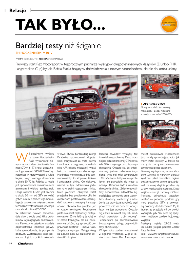 Relacje TAK BYŁO... Patronat Medialny Bardziej testy niż ściganie 3h Hockenheim, 9-10 IV tekst: classicauto zdjęcia: mat. prasowe Pierwszy start Rez Motorsport w tegorocznym pucharze wyścigów długodystansowych klasyków (Dunlop FHR Langstrecken Cup) był dla Rafała Płatka bogaty w doświadczenia z nowym samochodem, ale nie do końca udany. | Alfa Romeo GTAm Nowy samochód jest szerszy, mocniejszy i lżejszy niż znana z zeszłych sezonów 2000 GTV. W 3-godzinnym wyścigu na torze Hockenheim Rafał wystartował nowym samochodem. Jest to Alfa Romeo GTAm z 1971 roku, lżejsza homologacyjnie od GTV2000 o 60 kg, natomiast w rzeczywistości o wiele lżejsza, więc wymaga doważania o około 50-70 kg. Różnica w masie jest spowodowana zastosowaniem aluminium i włókna zamiast stali. Druga różnica: GTAm jest szersza o około 50 mm od GTV, co widać gołym okiem. Oprócz tego homologacja pozwala na większe zmiany techniczne w stosunku do seryjnego samochodu niż w GTV2000. W całkowicie nowym samochodzie dało o sobie znać kilka problemów wymagających dopracowania. Pierwszy to usterka w układzie odpowietrzania zbiornika paliwa, która spowodowała, że pompy nie podawały wystarczającej ilości paliwa na długich, szybkich zakrętach 18 w lewo. Słynny, bardzo długi zakręt Parabolika spowodował kłopoty: silnik otrzymywał za mało paliwa i tracił moc, a co gorsza, na wskaźniku AFR (składu mieszanki) widać było, że mieszanka jest zbyt uboga. Na dłuższą metę niezawodnie spowodowałoby to stopienie tłoków i zniszczenie silnika. Co ciekawe, usterka ta była odczuwalna jedynie na w pełni rozgrzanym silniku, toteż pierwsze okrążenia Rafał przejechał bez problemów. „Po 16 okrążeniach postanowiłem oszczędzić kosztowną maszynę i zrezygnować. Mieliśmy ten problem już w czasie treningów. Podejrzenie padło na aparat zapłonowy, następnie cewkę. Zmienialiśmy je kolejno w czasie treningów, ale nie mieliśmy warunków, aby sprawdzić poprawność działania” – mówi Rafał. Zwycięzca wyścigu, Metzger-Krug na Lotusie Elan S2 przejechał dystans 83 okrążeń. Podczas zawodów wystąpiły też inne ciekawe problemy. Dużo mocniejsza od zeszłorocznej GTV, nowa Alfa GTAm wymaga dużo lepszego chłodzenia. Okazało się, że chłodnica oleju jest nieco zbyt mała i wydajna, więc olej miał temperaturę 120-125 stopni. Niby nie ma problemu, ale przydałoby się nieco ją obniżyć. Podobnie było z układem chłodzenia silnika. „Zdemontowaliśmy niepotrzebnie, zdawałoby się, obciążający samochód drugi wentylator chłodnicy, wychodząc z założenia, że przy dużej szybkości pęd powietrza jest tak duży, że wentylator nie jest potrzebny. Okazało się jednak, że nawet przy 180 km/h drugi wentylator „robi robotę”. Temperatura po zdemontowaniu była za wysoka i gdy go przywróciliśmy, obniżyła się.” W tym roku puchar wystartował 2 tygodnie wcześniej, więc z konieczności team Rez Motorsport musiał potraktować Hockenheim jako rundę sprawdzającą auto. Jak mówi Rafał, niestety w Polsce nie ma gdzie porządnie przetestować samochodu przed sezonem. Pierwszy występ nowym samochodem wywołał u kierowcy ciekawy syndrom: „start nowiutkim, pięknie polakierowanym autem spowodował, że mniej chętnie pchałem się w tzw. męską walkę na torze. Kiedy wejście w zakręt „zamknął mi” Ford Mustang, odruchowo zacząłem uciekać na pobocze, podczas gdy moją poczciwą GTV z pewnością doszłoby do full contact! Myślę jednak, ze przejdzie mi po dwóch wyścigach, gdy Alfa nieco się spatynuje i nabierze bardziej bojowego wyglądu.” Następny wyścig: 21-22 maja, 3h Zolder (Belgia), podczas Zolder Race Festiwal. info: www.fhr-langstreckencup.de, www.rez-motorsport.com