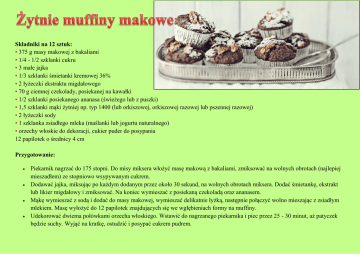 Składniki na 12 sztuk: • 375 g masy makowej z bakaliami • 1/4 - 1/2 szklanki cukru • 3 małe jajka • 1/3 szklanki śmietanki kremowej 36% • 2 łyżeczki ekstraktu migdałowego • 70 g ciemnej czekolady, posiekanej na kawałki • 1/2 szklanki posiekanego ananasa (świeżego lub z puszki) • 1,5 szklanki mąki żytniej np. typ 1400 (lub orkiszowej, orkiszowej razowej lub pszennej razowej) • 2 łyżeczki sody • 1 szklanka zsiadłego mleka (maślanki lub jogurtu naturalnego) • orzechy włoskie do dekoracji, cukier puder do posypania 12 papilotek o średnicy 4 cm Przygotowanie: Piekarnik nagrzać do 175 stopni. Do misy miksera włożyć masę makową z bakaliami, zmiksować na wolnych obrotach (najlepiej mieszadłem) ze stopniowo wsypywanym cukrem. Dodawać jajka, miksując po każdym dodanym przez około 30 sekund, na wolnych obrotach miksera. Dodać śmietankę, ekstrakt lub likier migdałowy i zmiksować. Na koniec wymieszać z posiekaną czekoladą oraz ananasem. Mąkę wymieszać z sodą i dodać do masy makowej, wymieszać delikatnie łyżką, następnie połączyć wolno mieszając z zsiadłym mlekiem. Masę wyłożyć do 12 papilotek znajdujących się we wgłębieniach formy na muffiny. Udekorować dwiema połówkami orzecha włoskiego. Wstawić do nagrzanego piekarnika i piec przez 25 - 30 minut, aż patyczek będzie suchy. Wyjąć na kratkę, ostudzić i posypać cukrem pudrem.