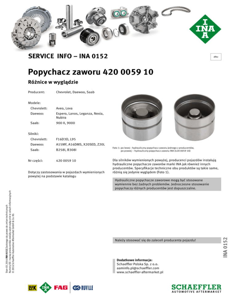 SERVICE INFO – INA 0152 Popychacz zaworu 420 0059 10 Różnice w wyglądzie Producent: Chevrolet, Daewoo, Saab Modele: Chevrolett: Aveo, Lova Daewoo: Espero, Lanos, Leganza, Nexia, Nubira Saab: 900 II, 9000 Silniki: F16D3D, L95 Daewoo: A15MF, A16DMS, X20SED, Z20L Saab: B258I, B308I Nr części: 420 0059 10 Stan 03.2016 INA 0152 Zastrzega się prawo do zmian technicznych Numery OE i nazwy producentów zostały użyte wyłącznie w celach informacyjnych © 2016 Schaeffler Automotive Aftermarket GmbH & Co. KG Dotyczy zastosowania w pojazdach wymienionych powyżej na podstawie katalogu Foto 1: po lewej - hydrauliczny popychacz zaworu jednego z producentów, po prawej – hydrauliczny popychacz zaworu INA (420 0059 10) Dla silników wymienionych powyżej, producenci pojazdów instalują hydrauliczne popychacze zaworów marki INA jak również innych producentów. Specyfikacje techniczne obu produktów są takie same, różnią się jedynie wyglądem (Foto 1). Hydrauliczne popychacze zaworowe mogą być stosowane wymiennie bez żadnych problemów. Jednoczesne stosowanie popychaczy różnych producentów jest dopuszczalne. Należy stosować się do zaleceń producenta pojazdu! Dodatkowe informacje: Schaeffler Polska Sp. z o.o. [email protected] www.schaeffler-aftermarket.pl INA 0152 Chevrolett: