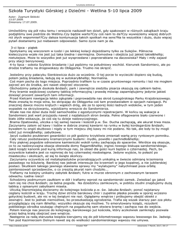 turystyka.skibicki.pl Szkoła Turystyki Górskiej z Dziećmi - Wetlina 5-10 lipca 2009 Autor: Zygmunt Skibicki 13.07.2009. Zmieniony 17.07.2009. Umówiliśmy się pół roku temu i wreszcie nadszedł ten dzień, gdy spakowani w różnych zakątkach kraju podjęliśmy swe podróże do Wetliny.Czy będzie warto?Czy coś nam to da?Czy wywieziemy więcej dobrych niż złych wspomnień?Czy dalsza kontynuacja takich spotkań ma sens?Na te wszystkie i dużo, dużo więcej pytań dostaniemy już niebawem odpowiedzi. Samo życie nam je da. 3-ci lipca - piątek Spotykamy się wieczorem w Łodzi i po lekkiej kolacji dojeżdżamy tylko za Sulejów. Północna kielecczyzna wcale nie jest już taka biedna i siermiężna. Domostwa i obejścia już jakieś takie… nietutejsze. Może to wszystko jest już wysprzedane i poprzerabiane na daczowiska? Mały i miły zajazd przy stacji benzynowej. 4-ty lipca - sobota Szybkie śniadanie i już pędzimy na południowy wschód. Kierunek Sandomierz, ale po drodze trafiamy na drogowskazy do Oblęgorka. Trudno nie skręcić. Jesteśmy przy pałacyku Sienkiewicza dużo za wcześnie. O tej porze to wycieczki dopiero się budzą, potem jedzą śniadania, ładują się w autokary… Normalina. Coś mam pecha do tego miejsca. Poprzednio trafiłem tu w czasie gruntownego remontu i też nie mogłem zajrzeć ani do środka, ani nawet obejrzeć otoczenie. Obchodzimy pałacyk dookoła – park i zewnętrze siedziby pisarza okazują się całkiem ładne. Przy bramie wejściowej czytamy tablicę informacyjną i prawdę mówiąc zapamiętujemy jedynie jakieś dziesięć procent zawartych tam informacji. Przed Kielcami nawigacja lekko zgłupiała i poprowadziła nas skroś Łysogórskiego Parku Krajobrazowego. Może zresztą to moja wina, bo skręcając do Oblęgorka coś tam przestawiałem w opcjach nawigacji. Po znacznej dawce mocno krętych i wąskich dróg, ale za to sporej ilości ładnych widoków, w tym jeden wypadek na skrzyżowaniu, wjeżdżamy wreszcie do Sandomierza. Wcale nas nie dziwi duża ilość samochodów z egzotycznymi rejestracjami. W końcu są wakacje a Sandomierz jest wart przyjazdu nawet z najdalszych stron świata. Pełne oflagowanie biało czerwone i biało żółte wskazuje, że coś się tu dzieje nadzwyczajnego. Brama Opatowska, uliczka o tej samej nazwie i kościół p.w. Św. Ducha zachęcają, ale akurat trwa msza. Zaczynamy zatem od kawy i lodów w dobrze znanej kawiarni na rynku w byłej kordegardzie – bywałem tu ongiś służbowo i nigdy w tym miejscu złej kawy mi nie podano. No tak, ale lody to by mogli robić już mniej… zabytkowe. Jacyś cudacko poubierani gwardziści co pół godziny krzykliwie zmieniali wartę przy rynkowym pomniku. Cały ratusz poobstawiany kramarcznymi budami: mydło, powidło i pachnidło… Przy pięknej pogodzie odnowione kamieniczki wokół rynku zachęcają do spacerów. Wkrótce się okazuje, co to za nadzwyczajna okazja obwiesiła domy flagami… ingres nowego biskupa sandomierskiego. Jakiś ksiądz kanonik pod kurią informuje nas, że obiad dla gości kurii będzie o czternastej. Pech, bo oczywiście katedra jest co najmniej do tej czternastej niedostępna. Jedyne wyjście, to połazić po miasteczku i okolicach, aż się to święto skończy. Zaczynamy oczywiście od metaloplastyków przerabiających unikalną w świecie odmianę krzemienia pasiastego na biżuterię. Bardziej nas jednak interesuje ów krzemień w jego kopalnej, a nie jubilerskiej postaci. Skutkiem takiego jawnego stawiania sprawy my "wylatujemy" natychmiast poza orbitę zainteresowań sprzedawców, o co zresztą akurat nam chodziło... Trafiamy na kolejny unikalny zabytek – futra w murze obronnym z zachowanym tarasem odwachu. Ładna rzecz! Schodzimy podmurnym zaułkiem w dół i trafiamy wprost na sandomierski zamek. Zwiedzać go jakoś nam się nie chce – za ładna pogoda. Na dziedzińcu zamkowym, w pobliżu studni znajdujemy dużą tablicę z opisanymi zabytkami miasta. Uliczką Staromiejską docieramy do kolejnego kościoła p.w. św. Jakuba – ponoć najstarszy ceglany kościół w kraju. Trochę dziwi stricte barokowy chór i zupełnie płaska powała w sporej wczesno gotyckiej budowli, ale nic w tej świątyni nie razi. Oglądamy wnętrze i próbujemy obejść obiekt z zewnątrz. Jest to jednak niemożliwe, bo przeszkadzają ogrodzenia. Trafia się wszak starszy pan zza płotu przyglądający się nam i… wszystko okazuje się możliwe. To emerytowany ksiądz, rezydent pobliskiego ośrodka szukając chętnych na pogaduchę sam otwiera bramę i zachęca nas do wejścia. Potem kieruje nas jeszcze do kolejnego, barokowego już kościoła, który aczkolwiek zamknięty pozwala przez ładną kratę obejrzeć swe wnętrze. Następnie za radą staruszka księdza kierujemy się do pół kilometrowego wąwozu lessowego św. Jadwigi. Ten pod Kazimierzem Dolnym nawet się do wielkości sandomierskiego wąwozu nie umywa. http://skibicki.pl/08 Kreator PDF Utworzono 7 March, 2017, 09:17 turystyka.skibicki.pl Znów obchodzimy wokół zamek i okazuje się, że katedra jest już dostępna: sutanny, habity i poczty sztandarowe wszelkiej maści oraz proweniencji – głównie strażackie – wsiadały już gremialnie do samochodów. Znaczy, Sandomierz ma już oficjalnie urzędującego biskupa i katedra jest dostępna dla zwykłych wiernych oraz turystów. Znałem tę budowlę od dawna, ale tak duszno to nigdy tam nie było. Cóż… prawie cztery godziny tłum z nie j nie wychodził. Czytamy, że nowy biskup to wręcz młodzieniaszek – nawet pięćdziesiątki nie ma. Znów podchodzimy pod rynek i mijając siedzibę kurii wprost wchodzimy na Nuncjusza Papieskiego abp. Kowalczyka – za wysoki to on nie jest. Zjedliśmy obiad w byłym domu kompozytora Gomółki i… w drogę. Kierunek Sanok. Nawigacja bez pudła podprowadziła nas pod skansen, ale z noclegami to jej już tak dobrze nie poszło. Trafiamy na hotel, ale trwa w nim wesele i brak miej