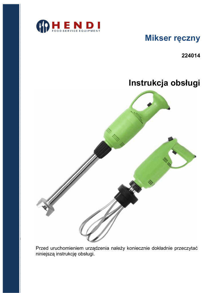 Mikser ręczny 224014 Instrukcja obsługi I Przed uruchomieniem urządzenia naleŜy koniecznie dokładnie przeczytać niniejszą instrukcję obsługi. SPIS TREŚCI INFORMACJE OGÓLNE .................................................................................................................................. 3 Przeznaczenie instrukcji ................................................................................................................................... 3 Oznaczenie urządzenia i producenta ............................................................................................................... 3 Opis urządzenia ............................................................................................................................................... 4 Dane techniczne .............................................................................................................................................. 4 Wymiary całkowite............................................................................................................................................ 5 Zabezpieczenia ................................................................................................................................................ 7 Informacje dotyczące bezpieczeństwa ............................................................................................................ 7 Ryzyko resztkowe ............................................................................................................................................ 8 INFORMACJE DOTYCZĄCE INSTALACJI ...................................................................................................... 9 Rozpakowanie ................................................................................................................................................. 9 Miejsce instalacji .............................................................................................................................................. 9 Połączenia elektryczne ..................................................................................................................................... 9 INFORMACJE DOTYCZĄCE UśYTKOWANIA I CZYSZCZENIA ................................................................... 10 Opis elementów sterowania .......................................................................................................................... 10 Korzystanie z miksera ................................................................................................................................... 10 Korzystanie z ramienia ubijającego................................................................................................................ 11 Zalecenia dotyczące uŜytkowania .................................................................................................................. 12 Czyszczenie bieŜące ...................................................................................................................................... 13 DłuŜszy okres nieuŜywania ........................................................................................................................... 13 ROZWIĄZYWANIE PROBLEMÓW, RECYKLING ........................................................................................ 14 Wstęp............................................................................................................................................................. 14 Problemy, przyczyny, rozwiązania ................................................................................................................. 14 Utylizacja i recykling ....................................................................................................................................... 14 INFORMACJE OGÓLNE 1 Przeznaczenie instrukcji Niniejsza instrukcja opracowana została przez producenta i stanowi integralną część urządzenia. W trakcie projektowania i wytwarzania urządzenia producent uwzględnił ewentualne zagrożenia i ryzyko osobiste, które mogą wiązać się z użytkowaniem urządzenia. Oprócz przestrzegania obowiązujących przepisów prawa, producent stosuje suje się do wszystkich wzorowych zasad dotyczących techniki konstrukcyjnej. Celem niniejszej instrukcji jest poinformowanie użytkowników o środkach ostrożności pozwalających uniknąć zagrożeń. Należy zawsze zachować ostrożność. Bezpieczeństwo zależy od wszystkich wszy operatorów obsługujących urządzenie. Niniejszą instrukcję należy przechowywać w odpowiednim, łatwo dostępnym miejscu. W instrukcji zastosowano następujące symbole, aby lepiej podkreślić znaczenie niektórych fragmentów: NIEBEZPIECZEŃSTWO - OSTRZEŻENIE: oznacza zagrożenia, które mogą spowodować poważne obrażenia, wymagane jest zachowanie ostrożności. UWAGA: oznacza szczególnie istotne informacje techniczne. Do instrukcji dołączono: świadectwo gwarancji określające warunki gwarancji producenta, producenta, dokumenty potwierdzające zgodność z obowiązującymi przepisami BHP. Aby zapytać o serwis, uzyskać informacje lub zamówić części, należy skontaktować się z autoryzowanym dealerem. Oznaczenie urządzenia i producenta Producent Oznaczenie Numer seryjny Oznaczenia zgodności Model urządzenia Rok produkcji Specyfikacje techniczne INFORMACJE OGÓLNE 1 Opis urządzenia Seria mikserów obejmuje następujące modele Model Model MX40 przeznaczony jest to użytku o natężeniu od małego do średniego. Urządzenie ma klasyczną budowę, użytkowane jest w położeniu pionowym. Silnik urządzenia oparty jest o konstrukcję z tworzywa, a ramię z ostrzem i ramię ubijające wykonane są ze stali nierdzewnej, stopu aluminium i elementów z tworzywa. Urządzenie wyposażone jest w jedną prędkość miksera i regulowaną prędkość ubijania. Dane techniczne Jednostka miary MX40 / 224014 Zasilanie V Hz