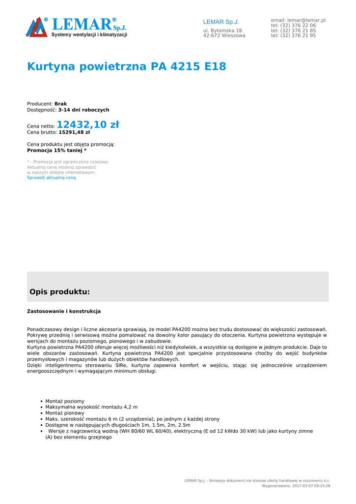 Karta Produktu - Kurtyna powietrzna PA 4215 E18