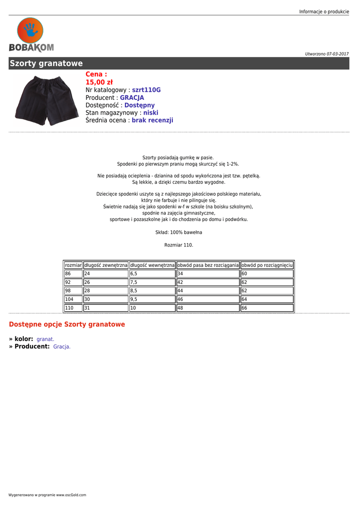 Informacje o produkcie Utworzono 07-03-2017 Szorty granatowe Cena : 15,00 zł Nr katalogowy : szrt110G Producent : GRACJA Dostępność : Dostępny Stan magazynowy : niski Średnia ocena : brak recenzji Szorty posiadają gumkę w pasie. Spodenki po pierwszym praniu mogą skurczyć się 1-2%. Nie posiadają ocieplenia - dzianina od spodu wykończona jest tzw. pętelką. Są lekkie, a dzięki czemu bardzo wygodne. Dziecięce spodenki uszyte są z najlepszego jakościowo polskiego materiału, który nie farbuje i nie pilinguje się. Świetnie nadają się jako spodenki w-f w szkole (na boisku szkolnym), spodnie na zajęcia gimnastyczne, sportowe i pozaszkolne jak i do chodzenia po domu i podwórku. Skład: 100% bawełna Rozmiar 110. rozmiar długość zewnętrzna długość wewnętrzna obwód pasa bez rozciągania obwód po rozciągnięciu 86 24 6,5 34 60 92 26 7,5 42 62 98 28 8,5 44 62 104 30 9,5 46 64 110 31 10 48 66 Dostępne opcje Szorty granatowe » kolor: granat. » Producent: Gracja. Wygenerowano w programie www.oscGold.com