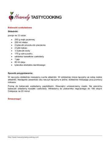 Babeczki czekoladowe Składniki: porcja na 12 sztuk 250 g mąki pszennej 250 ml mleka 2 łyżeczki proszku do pieczenia 2 łyżki kakao ½ łyżeczki sody 170 g cukru pudru szklanka kawałków czekolady 1 jajo 80 ml oleju łyżeczka ekstraktu waniliowego Sposób przygotowania: W naczyniu dokładnie mieszamy suche składniki. W oddzielnej misce łączymy ze sobą mokre składniki. Następnie zawartość obu naczyń łączymy w jedno, dokładnie mieszając przy pomocy miksera. Formę do babeczek wykładamy papilotkami. Wewnątrz umieszczamy ciasto. Na wierzchu babeczki układamy kawałki czekolady. Wkładamy do piekarnika nagrzanego do 180 stopni Celsjusza na 20 minut. Smacznego! http://www.heavenlytastycooking.com