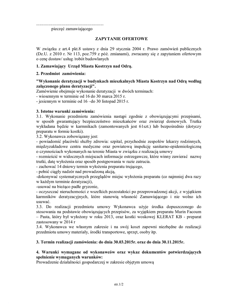 Zapytanie ofertowe - deratyzacja 2015