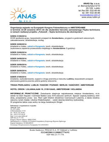 ANAS Sp. z o.o. ul. Bernardyńska12/10 20-109 Lublin tel./fax.081 532-48-49 tel. 081 532-38-88 [email protected] www.anas.lublin.pl Organizacja wyjazdu na Europejski Kongres Fotowoltaiczny w AMSTERDAMIE w terminie 22-26 września 2014 rok dla studentów kierunku zamawianego Fizyka techniczna w ramach realizacji projektu „Fotowolt – fizyka techniczna dla ekoinżyniera”. DZIEN 21/09/2014: 03:00 spotkanie grupy, bezpośredni przejazd do Amsterdamu, przyjazd w godzinach wieczornych, zakwaterowanie, obiadokolacja, nocleg. DZIEŃ 22/09/2014: śniadanie w hotelu, udział w Kongresie, lunch, obiadokolacja (wykonawca zapewnia przewodnika miejskiego w Amsterdamie /3 godziny) DZIEŃ 23/09/2014: śniadanie w hotelu, udział w Kongresie, lunch, obiadokolacja DZIEŃ 24/09/2014: śniadanie w hotelu, udział w Kongresie, lunch, obiadokolacja DZIEŃ 25/09/2014: śniadanie w hotelu, udział w Kongresie, lunch, obiadokolacja DZIEŃ 26/09/2014: śniadanie w hotelu, udział w Kongresie, lunch, obiadokolacja DZIEŃ 27/09/2014 śniadanie, wykwaterowanie, wyjazd w drogę powrotną w kierunku Lublina, bezpośredni przejazd planowana godzina powrotu późne godziny wieczorne. TRASA PRZEJAZDU: LUBLIN / RADOM / POZNAŃ / BERLIN / HANOVER / AMSTERDAM HOTEL ORION / JULIANALAAN 19, 2159 KAAG, AMSTERDAM / HOLANDIA INFORMACJE PRAKTYCZNE: Zwiedzanie obejmuje najciekawsze miejsca Amsterdamu, m.in. widok na Dam Square i Centraal Station oraz XVII wieczne centrum. Spacer częścią dzielnicy chińskiej, przejdziemy przez tzw. Red Light District (Dzielnice Czerwonych Latarnii), a także średniowieczny rynek miasta i okolice Waterlooplein - cześć dawnej dzielnicy żydowskiej. W programie także czas wolny na targu kwiatowym Singel. Informacje o organizatorze wyjazdu: Anas sp. z o.o. 20-109 Lublin ul.Bernardyńska 12/10 tel: +48 81 532 38 88 fax: +48 81 832 48 49 http://www.anas.lublin.pl NIP 946-23-77-778 Krajowy Rejestr Sądowy: 0000152945 Sąd Rejonowy w Lublinie XI Wydział Gospodarczy Krajowego Rejestru Sądowego Kapitał Zakładowy 50 000,00PLN Gwarancja Ubezpieczeniowa Europejskie Nr G/024/2014 Konto bankowe: PEKAO S.A. IV Oddział w Lublinie 52124025001111000037776192 NIP 946-23-77-778