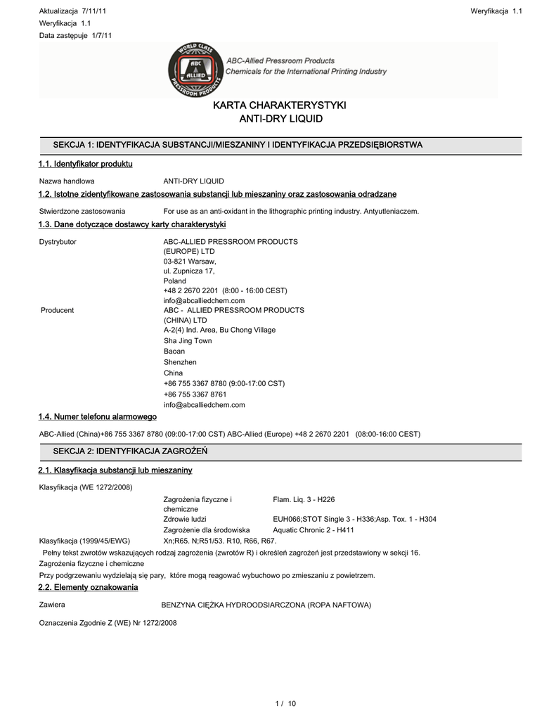 Aktualizacja 7/11/11 Weryfikacja 1.1 Weryfikacja 1.1 Data zastępuje 1/7/11 KARTA CHARAKTERYSTYKI ANTI-DRY LIQUID SEKCJA 1: IDENTYFIKACJA SUBSTANCJI/MIESZANINY I IDENTYFIKACJA PRZEDSIĘBIORSTWA 1.1. Identyfikator produktu Nazwa handlowa ANTI-DRY LIQUID 1.2. Istotne zidentyfikowane zastosowania substancji lub mieszaniny oraz zastosowania odradzane Stwierdzone zastosowania For use as an anti-oxidant in the lithographic printing industry. Antyutleniaczem. 1.3. Dane dotyczące dostawcy karty charakterystyki Dystrybutor Producent ABC-ALLIED PRESSROOM PRODUCTS (EUROPE) LTD 03-821 Warsaw, ul. Zupnicza 17, Poland +48 2 2670 2201 (8:00 - 16:00 CEST) [email protected] ABC - ALLIED PRESSROOM PRODUCTS (CHINA) LTD A-2(4) Ind. Area, Bu Chong Village Sha Jing Town Baoan Shenzhen China +86 755 3367 8780 (9:00-17:00 CST) +86 755 3367 8761 [email protected] 1.4. Numer telefonu alarmowego ABC-Allied (China)+86 755 3367 8780 (09:00-17:00 CST) ABC-Allied (Europe) +48 2 2670 2201 (08:00-16:00 CEST) SEKCJA 2: IDENTYFIKACJA ZAGROŻEŃ 2.1. Klasyfikacja substancji lub mieszaniny Klasyfikacja (WE 1272/2008) Klasyfikacja (1999/45/EWG) Flam. Liq. 3 - H226 Zagrożenia fizyczne i chemiczne Zdrowie ludzi EUH066;STOT Single 3 - H336;Asp. Tox. 1 - H304 Zagrożenie dla środowiska Aquatic Chronic 2 - H411 Xn;R65. N;R51/53. R10, R66, R67. Pełny tekst zwrotów wskazujących rodzaj zagrożenia (zwrotów R) i określeń zagrożeń jest przedstawiony w sekcji 16. Zagrożenia fizyczne i chemiczne Przy podgrzewaniu wydzielają się pary, które mogą reagować wybuchowo po zmieszaniu z powietrzem. 2.2. Elementy oznakowania Zawiera BENZYNA CIĘŻKA HYDROODSIARCZONA (ROPA NAFTOWA) Oznaczenia Zgodnie Z (WE) Nr 1272/2008 1 / 10 Weryfikacja 1.1 ANTI-DRY LIQUID Hasło ostrzegawcze Niebezpieczeństwo Zwroty wskazujące rodzaj zagrożenia H226 H304 H336 H411 Łatwopalna ciecz i pary. Połknięcie i dostanie się przez drogi oddechowe może grozić śmiercią. Może wywoływać uczucie senności lub zawroty głowy. Działa toksycznie na organizmy wodne, powodując długotrwałe skutki. P271 Stosować wyłącznie na zewnątrz lub w dobrze wentylowanym pomieszczeniu Stosować rękawice ochronne/odzież ochronną/ochronę oczu/ochronę twarzy. Zawartość/pojemnik usuwać zgodnie z przepisami narodowymi. Zwroty wskazujące środki ostrożności P280 P501 Dodatkowe zwroty wskazujące środki ostrożności P210 P233 P240 P241 P242 P243 P273 P261 P370+378 P301+310 P303+361+353 P304+340 P312 P331 P391 P403+233 P403+235 P405 Przechowywać z dala od źródeł ciepła/iskrzenia/otwar tego ognia/gorących powierzchni. Palenie wzbronione. Przechowywać pojemnik szczelnie zamknięty. Uziemić/połączyć pojemnik i sprzęt odbiorczy. Używać elektrycznego sprzętu przeciwwybuchowego. Używać wyłącznie nieiskrzących narzędzi. Przedsięwziąć środki ostrożności zapobiegające statycznemu rozładowaniu. Unikać uwalniania do środowiska. Unikać wdychania par/rozpylonej cieczy. W przypadku pożaru: Stosować pianę, dwutlenek węgla, suchy proszek lub mgłę wodną do tłumienia ognia. W PRZYPADKU POŁKNIĘCIA: Natychmiast skontaktować się z OŚRODKIEM ZATRUĆ lub z lekarzem. W PRZYPADKU DOSTANIA SIĘ NA SKÓRĘ (lub na włosy): Natychmiast usunąć/zdjąć całą zanieczyszczoną odzież. Spłukać skórę pod strumieniem wody/prysznicem. W PRZYPADKU DOSTANIA SIĘ DO DRÓG ODDECHOWYCH: wyprowadzić lub wynieść poszkodowanego na świeże powietrze i zapewnić warunki do odpoczynku w pozycji umożliwiającej swobodne oddychanie. W przypadku złego samopoczucia skontaktować się z OŚRODKIEM ZATRUĆ lub z lekarzem. NIE wywoływać wymiotów. Zebrać wyciek. Przechowywać w dobrze wentylowanym miejscu. Przechowywać pojemnik szczelnie zamknięty. Przechowywać w dobrze wentylowanym miejscu. Przechowywać w chłodnym miejscu. Przechowywać pod zamknięciem. Informacje uzupełniające na etykiecie EUH066 2.3. Inne zagrożenia Powtarzające się narażenie może powodować wysuszanie lub pękanie skóry. Nieklasyfikowany jako PBT / vPvB na podstawie obecnych kryteriów UE. SEKCJA 3: SKŁAD/INFORMACJA O SKŁADNIKACH 3.2. Mieszaniny 2 / 10 Weryfikacja 1.1 ANTI-DRY LIQUID BENZYNA CIĘŻKA HYDROODSIARCZONA (ROPA NAFTOWA) Numer CAS: 64742-82-1 50-70% Numer WE: 265-185-4 Klasyfikacja (WE 1272/2008) Flam. Liq. 3 - H226 EUH066 Skin Mild Irrit. 3 - H316 STOT Single 3 - H336 Asp. Tox. 1 - H304 Aquatic Chronic 2 - H411 Klasyfikacja (67/548/EWG) Xn;R65. N;R51/53. R10,R66,R67. Pełny tekst zwrotów wskazujących rodzaj zagrożenia (zwrotów R) i określeń zagrożeń jest przedstawiony w sekcji 16. Uwagi względem składu BENZYNA CIĘŻKA HYDROODSIARCZONA (ROPA NAFTOWA) (CAS 64742-82-1) wymienione zawiera: NAFTALEN (cas 91-20-3) ~ 0.1 - 0.9%. KSYLEN (cas 1330-20-7) ~ 1 - 5%. 1, 2, 4-TRIMETYLOBENZEN (cas 95-63-6) ~ 1 - 5%. SEKCJA 4: ŚRODKI PIERWSZEJ POMOCY 4.1. Opis środków pierwszej pomocy Wdychanie Niezwłocznie wynieść/wyprowadzić osobę narażoną na wdychanie na świeże powietrze. W przypadku trudności z oddychaniem może być konieczne podanie tlenu. W przypadku zatrzymania funkcji oddechowych zastosować sztuczne oddychanie. Zapewnić zaatakowanej osobie ciepło i odpoczynek. Zapewnić niezwłoczną opiekę lekarską. Spożycie NIE WYWOŁYWAĆ WYMIOTÓW! W przypadku wymiotów trzymać głowę nisko, aby zawartość żołądka nie dostała się do płuc. Niezwłocznie odsunąć ofiarę od źródła narażenia. Dokładnie wypłukać usta. Zapewnić odpoczynek, ciepło i świeże powietrze. Natychmiast zapewnić opiekę lekarską! Kontakt ze skórą Odsunąć zaatakowaną osobę od źródła zanieczyszczenia. Zdjąć zanieczyszczoną odzież. Natychmiast umyć skórę wodą z mydłem. Jeśli podrażnienie nie zniknie po myciu, skontaktować się z lekarzem. Kontakt z oczami Przed płukaniem upewnić się, że ewentualne soczewki kontaktowe zostały wyjęte z oczu. Niezwłocznie przemyć oczy dużą ilością wody, podnosząc powieki. Kontynuowa