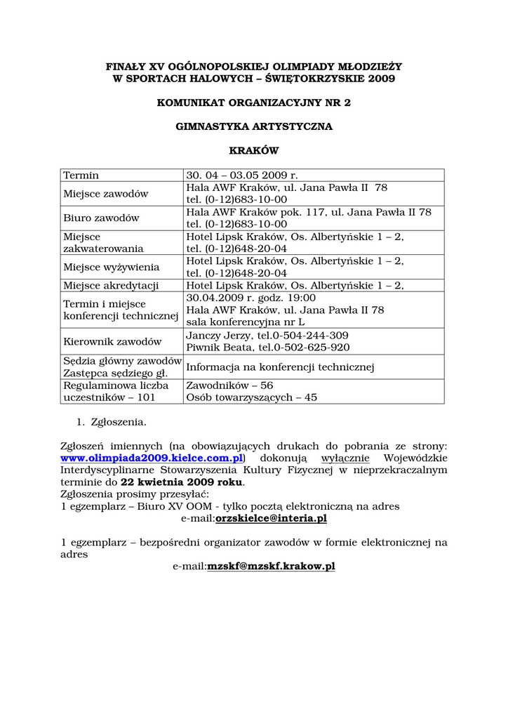 FINAŁY XV OGÓLNOPOLSKIEJ OLIMPIADY MŁODZIEŻY W SPORTACH HALOWYCH – ŚWIĘTOKRZYSKIE 2009 KOMUNIKAT ORGANIZACYJNY NR 2 GIMNASTYKA ARTYSTYCZNA KRAKÓW Termin 30. 04 – 03.05 2009 r. Hala AWF Kraków, ul. Jana Pawła II 78 Miejsce zawodów tel. (0-12)683-10-00 Hala AWF Kraków pok. 117, ul. Jana Pawła II 78 Biuro zawodów tel. (0-12)683-10-00 Miejsce Hotel Lipsk Kraków, Os. Albertyńskie 1 – 2, zakwaterowania tel. (0-12)648-20-04 Hotel Lipsk Kraków, Os. Albertyńskie 1 – 2, Miejsce wyżywienia tel. (0-12)648-20-04 Miejsce akredytacji Hotel Lipsk Kraków, Os. Albertyńskie 1 – 2, 30.04.2009 r. godz. 19:00 Termin i miejsce Hala AWF Kraków, ul. Jana Pawła II 78 konferencji technicznej sala konferencyjna nr L Janczy Jerzy, tel.0-504-244-309 Kierownik zawodów Piwnik Beata, tel.0-502-625-920 Sędzia główny zawodów Informacja na konferencji technicznej Zastępca sędziego gł. Regulaminowa liczba Zawodników – 56 uczestników – 101 Osób towarzyszących – 45 1. Zgłoszenia. Zgłoszeń imiennych (na obowiązujących drukach do pobrania ze strony: www.olimpiada2009.kielce.com.pl) dokonują wyłącznie Wojewódzkie Interdyscyplinarne Stowarzyszenia Kultury Fizycznej w nieprzekraczalnym terminie do 22 kwietnia 2009 roku. Zgłoszenia prosimy przesyłać: 1 egzemplarz – Biuro XV OOM - tylko pocztą elektroniczną na adres e-mail:[email protected] 1 egzemplarz – bezpośredni organizator zawodów w formie elektronicznej na adres e-mail:[email protected] 2. Warunki uczestnictwa. W Finałach XV OOM w sportach halowych mogą brać udział zawodnicy zakwalifikowani (zgodnie z wykazami sporządzonymi przez Polski Związek Sportowy) posiadający aktualną licencję w ilościach oraz rocznikach podanych w Regulaminie Współzawodnictwa Sportowego Dzieci i Młodzieży zamieszczonego na stronie Polskiej Federacji Sportu Młodzieżowego www.sportmlodziezowy.pl 3. Program zawodów: 30.04.2009 – czwartek do godz. 12:00 godz. 13:00 – 18:00 godz. 16:00 – 18:00 godz. 19:00 1.05.2009 – piątek godz. 11:30 – 12:40 godz. 12:50 – 13:30 godz. 13:30 – 15:30 przyjazd ekip próba przyrządu komisja mandatowa konferencja techniczna godz. 15:30 – 16:00 godz. 16:00 – 17:10 godz. 17:10 – 18:10 kl. II układ ze skakanką mp w układach zespołowych uroczyste otwarcie XV OOM w gimnastyce artystycznej pm w układach zespołowych kl. III układ taneczny kl. II układ z obręczą 2.05.2009 – sobota godz. 11:00 – 12:00 godz. 12:10 – 13:30 godz. 13:30 – 16:00 godz. 16:00 – 17:00 godz. 17:10 – 18:30 kl. II układ z piłką kl. III układ ze skakanką przerwa kl. II układ z maczugami kl. III układ z obręczą lub piłką 3.05.2009 – niedziela godz. 10:00 – 10:20 godz. 10:20 – 10:40 godz. 11:00 – 11:20 godz. 11:20 – 11:40 godz. 12:00 – 12:20 godz. 12:20 – 12:40 godz. 12:50 – 13:10 godz. 15:00 po obiedzie finał kl. II – skakanka finał kl. III – układ taneczno – akrobatyczny dekoracja finał kl. II – obręcz finał kl. III – skakanka dekoracja finał kl. II - piłka finał kl. III – obręcz finał kl. II – maczuga dekoracja dekoracja i zakończenie zawodów wyjazd ekip