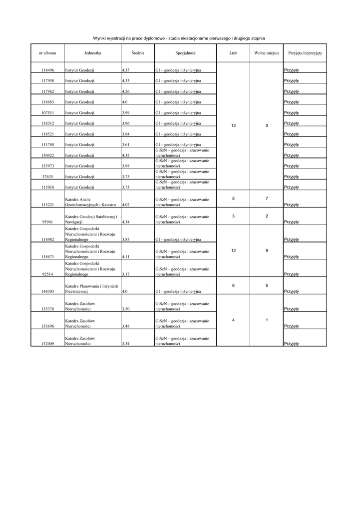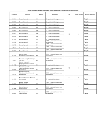 Wyniki rejestracji na prace dyplomowe - studia niestacjonarne pierwszego i drugiego stopnia nr albumu Średnia Jednostka Specjalność Lmit Wolne miejsca Przyjęty/nieprzyjęty 118496 Instytut Geodezji 4.35 GI – geodezja inżynieryjna Przyjęty 117958 Instytut Geodezji 4.33 GI – geodezja inżynieryjna Przyjęty 117962 Instytut Geodezji 4.26 GI – geodezja inżynieryjna Przyjęty 118683 Instytut Geodezji 4.0 GI – geodezja inżynieryjna Przyjęty 107511 Instytut Geodezji 3.99 GI – geodezja inżynieryjna Przyjęty 118312 Instytut Geodezji 3.96 GI – geodezja inżynieryjna 118521 Instytut Geodezji 3.84 GI – geodezja inżynieryjna Przyjęty 111788 Instytut Geodezji 3.61 Przyjęty 130922 Instytut Geodezji 4.32 133973 Instytut Geodezji 3.98 37635 Instytut Geodezji 3.75 115016 Instytut Geodezji 3.73 GI – geodezja inżynieryjna GiSzN – geodezja i szacowanie nieruchomości GiSzN – geodezja i szacowanie nieruchomości GiSzN – geodezja i szacowanie nieruchomości GiSzN – geodezja i szacowanie nieruchomości Katedra Analiz Geoinformacyjnych i Katastru 4.02 GiSzN – geodezja i szacowanie nieruchomości 8 115221 Katedra Geodezji Satelitarnej i Nawigacji 4.34 GiSzN – geodezja i szacowanie nieruchomości 3 95961 114982 Katedra Gospodarki Nieruchomościami i Rozwoju Regionalnego 3.85 GI – geodezja inżynieryjna 118671 Katedra Gospodarki Nieruchomościami i Rozwoju Regionalnego 4.11 GiSzN – geodezja i szacowanie nieruchomości 92514 Katedra Gospodarki Nieruchomościami i Rozwoju Regionalnego 3.17 GiSzN – geodezja i szacowanie nieruchomości 144303 Katedra Planowania i Inżynierii Przestrzennej 4.0 GI – geodezja inżynieryjna Przyjęty 133378 Katedra Zasobów Nieruchomości 3.50 GiSzN – geodezja i szacowanie nieruchomości Przyjęty 133696 Katedra Zasobów Nieruchomości 3.48 GiSzN – geodezja i szacowanie nieruchomości 132009 Katedra Zasobów Nieruchomości 3.34 GiSzN – geodezja i szacowanie nieruchomości 12 0 Przyjęty Przyjęty Przyjęty Przyjęty Przyjęty 7 Przyjęty 2 Przyjęty Przyjęty 12 9 Przyjęty Przyjęty 6 4 5 1 Przyjęty Przyjęty