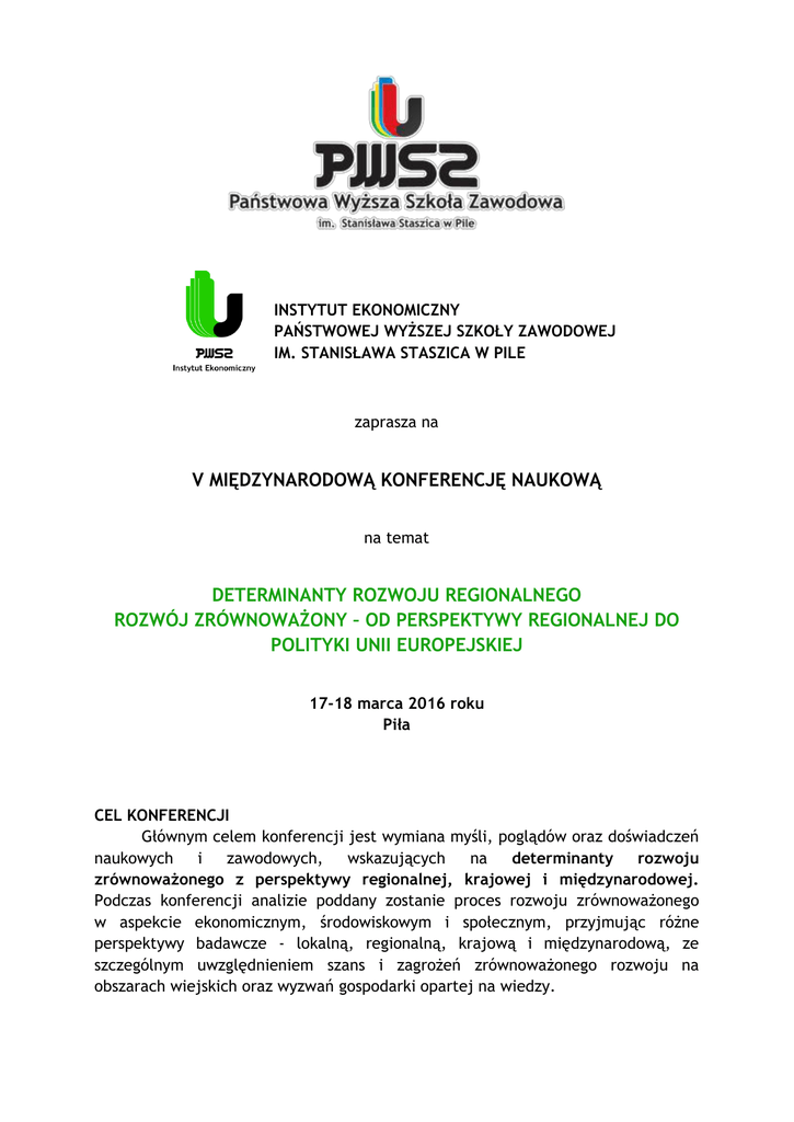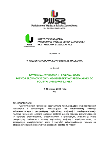 INSTYTUT EKONOMICZNY PAŃSTWOWEJ WYŻSZEJ SZKOŁY ZAWODOWEJ IM. STANISŁAWA STASZICA W PILE zaprasza na V MIĘDZYNARODOWĄ KONFERENCJĘ NAUKOWĄ na temat DETERMINANTY ROZWOJU REGIONALNEGO ROZWÓJ ZRÓWNOWAŻONY – OD PERSPEKTYWY REGIONALNEJ DO POLITYKI UNII EUROPEJSKIEJ 17-18 marca 2016 roku Piła CEL KONFERENCJI Głównym celem konferencji jest wymiana myśli, poglądów oraz doświadczeń naukowych i zawodowych, wskazujących na determinanty rozwoju zrównoważonego z perspektywy regionalnej, krajowej i międzynarodowej. Podczas konferencji analizie poddany zostanie proces rozwoju zrównoważonego w aspekcie ekonomicznym, środowiskowym i społecznym, przyjmując różne perspektywy badawcze - lokalną, regionalną, krajową i międzynarodową, ze szczególnym uwzględnieniem szans i zagrożeń zrównoważonego rozwoju na obszarach wiejskich oraz wyzwań gospodarki opartej na wiedzy. TEMATYKA KONFERENCJI Proponujemy dyskusję wokół następujących problemów: Rozwój zrównoważony w regionie, w Polsce i w Unii Europejskiej – przepływy i współzależności Polityki Unii Europejskiej na rzecz rozwoju zrównoważonego – efekty i perspektywy Rozwój gospodarczy a zasoby środowiskowe na obszarach wiejskich Kształtowanie się nowoczesnego rynku pracy i kapitału ludzkiego Wyzwania gospodarki opartej na wiedzy MŚP a rozwój zrównoważony regionów w Polsce i w UE Zrównoważony rozwój samorządowych przestrzeni regionalnych Paradygmat zrównoważonego rozwoju i jego ewolucja JĘZYK KONFERENCJI Oficjalnym językiem konferencji będzie język polski i angielski. UCZESTNICY KONFERENCJI Na najbliższej konferencji spodziewamy się gości z zagranicznych ośrodków akademickich – m.in. ze Słowacji, Ukrainy, Rumunii, Turcji, Łotwy. W celu nadania konferencji wymiaru praktycznego planowany jest udział przedstawicieli biznesu oraz władz szczebla lokalnego, regionalnego i centralnego. WYDAWNICTWO Owocem dyskusji naukowej w ramach naszej konferencji będą dwie monografie oraz publikacje w czasopiśmie Progress in Economic Sciences: 1. Wybrane artykuły zostaną zredagowane i wydane w formie prestiżowej monografii nt polityki wsparcia zrównoważonego rozwoju obszarów wiejskich, perspektywa regionalna, krajowa i międzynarodowa, która zostanie przetłumaczona na język angielski (na koszt organizatorów) i zgłoszona do indeksowania w Web of Sciences. 2. Wybrane artykuły zostaną zredagowane i wydane w formie prestiżowej monografii nt wyzwań edukacyjnych i aspektów społecznych rozwoju zrównoważonego w języku polskim. 3. Pozostałe prace w języku polskim lub angielskim zostaną opublikowane w czasopiśmie Progress in Economic Sciences. W związku z powyższym oczekujemy nadsyłania oryginalnych prac naukowych w języku angielskim lub polskim o objętości minimum 21 tys. znaków, przygotowanych zgodnie z wymogami edycyjnymi zamieszczonymi na stronie pne.pwsz.pila.pl. Referaty zgłoszone na konferencję zostaną skierowane do publikacji dopiero po pozytywnym przejściu procedury podwójnej recenzji. TERMINY 1. Zgłoszenie uczestnictwa w konferencji (tytuł i główne tezy referatu) 05.02.2016 2. Opłata konferencyjna 500 zł - obejmująca publikację w monografii, pełne wyżywienie i nocleg 300 zł – publikacja bez uczestnictwa 16.02.2016 3. Tekst referatu przygotowany zgodnie z wymogami zamieszczonymi na stronie pne.pwsz.pila.pl (artykuły zgłoszone po terminie nie trafią do publikacji) 27.02.2016 KONTO KONFERENCJI 48 1500 1041 1210 4005 7248 0000 BZACH 3 Oddział w Pile z dopiskiem DETERMINANTY ROZWOJU REGIONALNEGO dla wpłat zagranicznych PL48 1500 1041 1210 4005 7248 0000 BZACH 3 Oddział w Pile KOD SWIFT KRDBPLPW UWAGA W przypadku rezygnacji z udziału w konferencji organizatorzy zwracają w całości koszt opłaty konferencyjnej do dnia 31.01.2016 r. Po tym terminie opłaty nie będą zwracane. DODATKOWE INFORMACJE Sekretariat konferencji Instytut Ekonomiczny Państwowej Wyższej Szkoły Zawodowej im. Stanisława Staszica w Pile ul. Podchorążych 10, 64-920 Piła tel./fax +48 67 352 26 11 e-mail: [email protected], www.konferencja.pwsz.pila.pl
