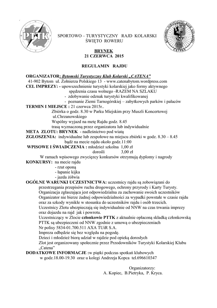 SPORTOWO – TURYSTYCZNY RAJD KOLARSKI ŚWIĘTO ROWERU BRYNEK 21 CZERWCA 2015 REGULAMIN RAJDU ORGANIZATOR: Bytomski Turystyczny Klub Kolarski „CATENA” 41-902 Bytom ul. Żołnierza Polskiego 13 - www.catenabytom.wordpress.com CEL IMPREZY: - upowszechnienie turystyki kolarskiej jako formy aktywnego spędzenia czasu wolnego -RAZEM NA SZLAKU - zdobywanie odznak turystyki kwalifikowanej - poznanie Ziemi Tarnogórskiej – zabytkowych parków i pałaców TERMIN I MIEJSCE : 21 czerwca 2015r.. Zbiórka o godz. 8.30 w Parku Miejskim przy Muszli Koncertowej ul.Chrzanowskiego Wspólny wyjazd na metę Rajdu godz. 8.45 trasą wyznaczoną przez organizatora lub indywidualnie META ZLOTU: BRYNEK - nadleśnictwo pod wiatą ZGŁOSZENIA: indywidualne lub zespołowe na miejscu zbiórki w godz. 8.30 – 8.45 bądź na mecie rajdu około godz.11:00 WPISOWE I ŚWIADCZENIA : młodzież szkolna 1,00 zł dorośli 3,00 zł W ramach wpisowego zwycięzcy konkursów otrzymują dyplomy i nagrody KONKURSY: na mecie rajdu - rzut oponą - łapanie kijka - jazda żółwia OGÓLNE WARUNKI UCZESTNICTWA: uczestnicy rajdu są zobowiązani do przestrzegania przepisów ruchu drogowego, ochrony przyrody i Karty Turysty. Organizacja zgłaszająca jest odpowiedzialna za zachowanie swoich uczestników Organizator nie bierze żadnej odpowiedzialności za wypadki powstałe w czasie rajdu oraz za szkody wynikłe w stosunku do uczestników rajdu i osób trzecich. Uczestnicy Zlotu ubezpieczają się indywidualnie od NNW na czas trwania imprezy oraz dojazdu na rajd jak i powrotu. Uczestniczący w Zlocie członkowie PTTK z aktualnie opłaconą składką członkowską PTTK są ubezpieczeni od NNW zgodnie z umową o ubezpieczeniach Nr polisy 5834-01.700.511 AXA TUiR S.A. Impreza odbędzie się bez względu na pogodę. Dzieci i młodzież biorą udział w rajdzie pod opieką dorosłych Zlot jest organizowany społecznie przez Przodowników Turystyki Kolarskiej Klubu „Catena” DODATKOWE INFORMACJE :w piątki podczas spotkań klubowych w godz.18.00-19.30 oraz u kolegi Andrzeja Kopca tel.696610347 Organizatorzy: A. Kopiec, B.Pietryka, P. Kryca.