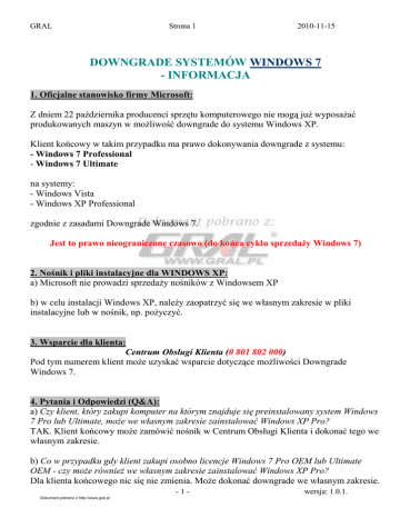 GRAL Strona 1 2010-11-15 DOWNGRADE SYSTEMÓW WINDOWS 7 - INFORMACJA 1. Oficjalne stanowisko firmy Microsoft: Z dniem 22 października producenci sprzętu komputerowego nie mogą juŜ wyposaŜać produkowanych maszyn w moŜliwość downgrade do systemu Windows XP. Klient końcowy w takim przypadku ma prawo dokonywania downgrade z systemu: - Windows 7 Professional - Windows 7 Ultimate na systemy: - Windows Vista - Windows XP Professional zgodnie z zasadami Downgrade Windows 7. Jest to prawo nieograniczone czasowo (do końca cyklu sprzedaŜy Windows 7) 2. Nośnik i pliki instalacyjne dla WINDOWS XP: a) Microsoft nie prowadzi sprzedaŜy nośników z Windowsem XP b) w celu instalacji Windows XP, naleŜy zaopatrzyć się we własnym zakresie w pliki instalacyjne lub w nośnik, np. poŜyczyć. 3. Wsparcie dla klienta: Centrum Obsługi Klienta (0 801 802 000) Pod tym numerem klient moŜe uzyskać wsparcie dotyczące moŜliwości Downgrade Windows 7. 4. Pytania i Odpowiedzi (Q&A): a) Czy klient, który zakupi komputer na którym znajduje się preinstalowany system Windows 7 Pro lub Ultimate, moŜe we własnym zakresie zainstalować Windows XP Pro? TAK. Klient końcowy moŜe zamówić nośnik w Centrum Obsługi Klienta i dokonać tego we własnym zakresie. b) Co w przypadku gdy klient zakupi osobno licencje Windows 7 Pro OEM lub Ultimate OEM - czy moŜe równieŜ we własnym zakresie zainstalować Windows XP Pro? Dla klienta końcowego nic się nie zmienia. MoŜe dokonać downgrade we własnym zakresie. -1Dokument pobrano z http://www.gral.pl wersja: 1.0.1.
