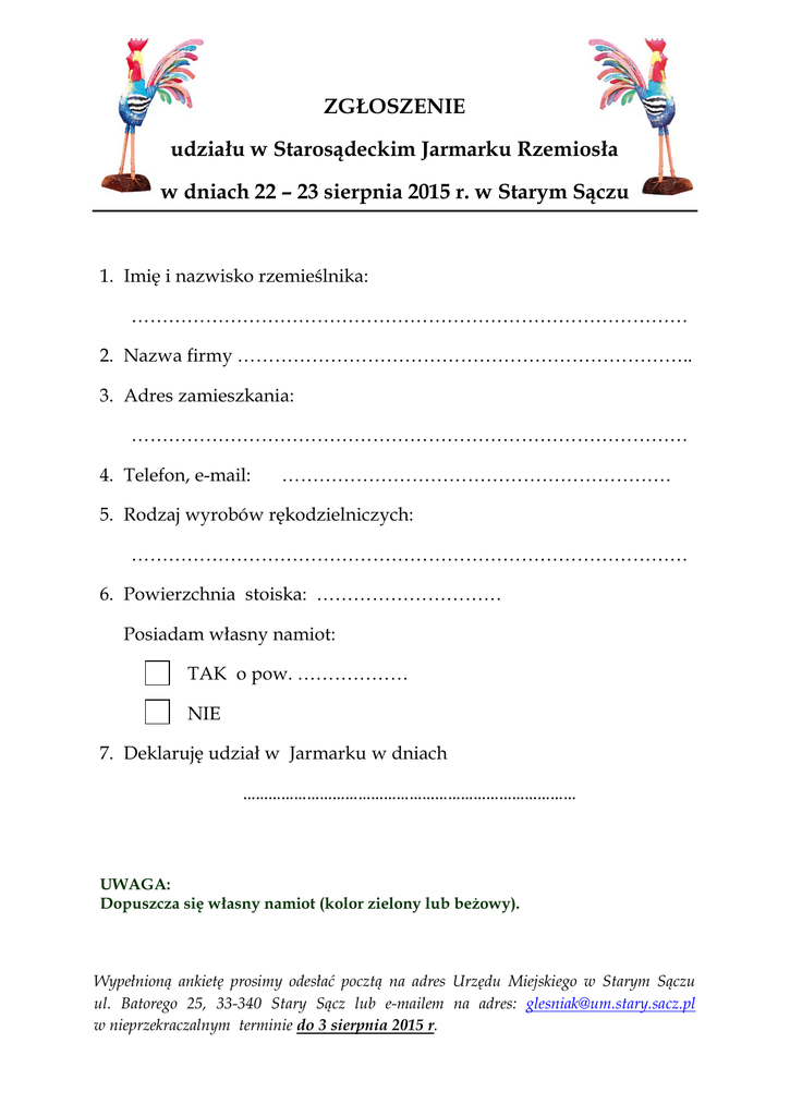 ZGŁOSZENIE udziału w Starosądeckim Jarmarku Rzemiosła w dniach 22 – 23 sierpnia 2015 r. w Starym Sączu 1. Imię i nazwisko rzemieślnika: ……………………………………………………………………………… 2. Nazwa firmy ……………………………………………………………….. 3. Adres zamieszkania: ……………………………………………………………………………… 4. Telefon, e-mail: ……………………………………………………… 5. Rodzaj wyrobów rękodzielniczych: ……………………………………………………………………………… 6. Powierzchnia stoiska: ………………………… Posiadam własny namiot: TAK o pow. ……………… NIE 7. Deklaruję udział w Jarmarku w dniach …………………………………………………………………… UWAGA: Dopuszcza się własny namiot (kolor zielony lub beżowy). Wypełnioną ankietę prosimy odesłać pocztą na adres Urzędu Miejskiego w Starym Sączu ul. Batorego 25, 33-340 Stary Sącz lub e-mailem na adres: [email protected] w nieprzekraczalnym terminie do 3 sierpnia 2015 r.