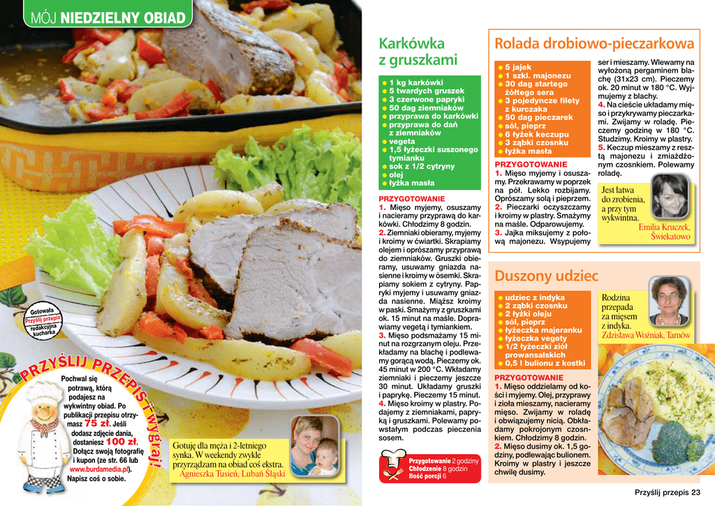 MÓJ NIEDZIELNY OBIAD Karkówka z gruszkami 1 kg karkówki 5 twardych gruszek 3 czerwone papryki 50 dag ziemniaków przyprawa do karkówki przyprawa do dań z ziemniaków ● vegeta ● 1,5 łyżeczki suszonego tymianku ● sok z 1/2 cytryny ● olej ● łyżka masła ● ● ● ● ● ● PRZYGOTOWANIE Gotowała pis Przyślij prze redakcyjna kucharka Pochwal się potrawą, którą podajesz na wykwintny obiad. Po publikacji przepisu otrzymasz 75 zł. Jeśli dodasz zdjęcie dania, dostaniesz 100 zł. Dołącz swoją fotografię i kupon (ze str. 66 lub www.burdamedia.pl). Napisz coś o sobie. Gotuję dla męża i 2-letniego synka. W weekendy zwykle przyrządzam na obiad coś ekstra. Agnieszka Tusień, Lubań Śląski 1. Mięso myjemy, osuszamy i nacieramy przyprawą do karkówki. Chłodzimy 8 godzin. 2. Ziemniaki obieramy, myjemy i kroimy w ćwiartki. Skrapiamy olejem i oprószamy przyprawą do ziemniaków. Gruszki obieramy, usuwamy gniazda nasienne i kroimy w ósemki. Skrapiamy sokiem z cytryny. Papryki myjemy i usuwamy gniazda nasienne. Miąższ kroimy w paski. Smażymy z gruszkami ok. 15 minut na maśle. Doprawiamy vegetą i tymiankiem. 3. Mięso podsmażamy 15 minut na rozgrzanym oleju. Przekładamy na blachę i podlewamy gorącą wodą. Pieczemy ok. 45 minut w 200 °C. Wkładamy ziemniaki i pieczemy jeszcze 30 minut. Układamy gruszki i paprykę. Pieczemy 15 minut. 4. Mięso kroimy w plastry. Podajemy z ziemniakami, papryką i gruszkami. Polewamy powstałym podczas pieczenia sosem. Przygotowanie 2 godziny Chłodzenie 8 godzin Ilość porcji 6 Rolada drobiowo-pieczarkowa ser i mieszamy. Wlewamy na wyłożoną pergaminem blachę (31x23 cm). Pieczemy ok. 20 minut w 180 °C. Wyjmujemy z blachy. 4. Na cieście układamy mięso i przykrywamy pieczarkami. Zwijamy w roladę. Pieczemy godzinę w 180 °C. Studzimy. Kroimy w plastry. 5. Keczup mieszamy z resztą majonezu i zmiażdżoPRZYGOTOWANIE nym czosnkiem. Polewamy 1. Mięso myjemy i osusza- roladę. my. Przekrawamy w poprzek na pół. Lekko rozbijamy. Jest łatwa Oprószamy solą i pieprzem. do zrobienia, 2. Pieczarki oczyszczamy a przy tym i kroimy w plastry. Smażymy wykwintna. na maśle. Odparowujemy. Emilia Kruczek, 3. Jajka miksujemy z połoŚwiekatowo wą majonezu. Wsypujemy 5 jajek 1 szkl. majonezu 30 dag startego żółtego sera ● 3 pojedyncze filety z kurczaka ● 50 dag pieczarek ● sól, pieprz ● 6 łyżek keczupu ● 3 ząbki czosnku ● łyżka masła ● ● ● Duszony udziec udziec z indyka 2 ząbki czosnku 2 łyżki oleju sól, pieprz łyżeczka majeranku łyżeczka vegety 1/2 łyżeczki ziół prowansalskich ● 0,5 l bulionu z kostki ● ● ● ● ● ● ● Rodzina przepada za mięsem z indyka. Zdzisława Woźniak, Tarnów PRZYGOTOWANIE 1. Mięso oddzielamy od kości i myjemy. Olej, przyprawy i zioła mieszamy, nacieramy mięso. Zwijamy w roladę i obwiązujemy nicią. Obkładamy pokrojonym czosnkiem. Chłodzimy 8 godzin. 2. Mięso dusimy ok. 1,5 godziny, podlewając bulionem. Kroimy w plastry i jeszcze chwilę dusimy. Przyślij przepis 23