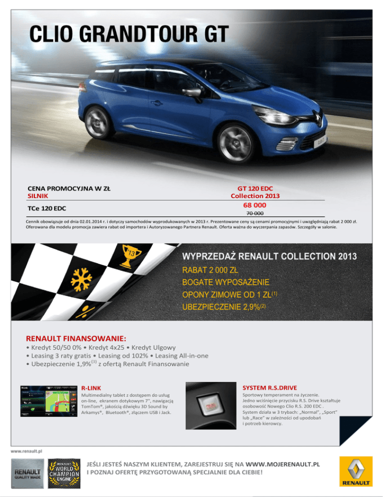 CENA PROMOCYJNA W ZŁ SILNIK GT 120 EDC Collection 2013 68 000 TCe 120 EDC 70 000 Cennik obowiązuje od dnia 02.01.2014 r. i dotyczy samochodów wyprodukowanych w 2013 r. Prezentowane ceny są cenami promocyjnymi i uwzględniają rabat 2 000 zł. Oferowana dla modelu promocja zawiera rabat od importera i Autoryzowanego Partnera Renault. Oferta ważna do wyczerpania zapasów. Szczegóły w salonie. WYPRZEDAŻ RENAULT COLLECTION 2013 RABAT 2 000 ZŁ BOGATE WYPOSAŻENIE OPONY ZIMOWE OD 1 ZŁ(1) UBEZPIECZENIE 2,9%(2) RENAULT FINANSOWANIE: • Kredyt 50/50 0% • Kredyt 4x25 • Kredyt Ulgowy • Leasing 3 raty gratis • Leasing od 102% • Leasing All-in-one • Ubezpieczenie 1,9%(3) z ofertą Renault Finansowanie R-LINK SYSTEM R.S.DRIVE Multimedialny tablet z dostępem do usług on-line, ekranem dotykowym 7'', nawigacją TomTom®, jakością dźwięku 3D Sound by Arkamys®, Bluetooth®, złączem USB i Jack. Sportowy temperament na życzenie. Jedno wciśnięcie przycisku R.S. Drive kształtuje osobowość Nowego Clio R.S. 200 EDC . System działa w 3 trybach: „Normal”, „Sport” lub „Race” w zależności od upodobań i potrzeb kierowcy. JEŚLI JESTEŚ NASZYM KLIENTEM, ZAREJESTRUJ SIĘ NA WWW.MOJERENAULT.PL I POZNAJ OFERTĘ PRZYGOTOWANĄ SPECJALNIE DLA CIEBIE! WYPOSAŻENIE GT 120 EDC Collection 2013 BEZPIECZEŃSTWO CZYNNE I BIERNE ABS z s ys temem ws poma ga ni a na głego ha mowa ni a Przedni e podus zki powi etrzne ki erowcy i pa s a żera Deza ktywa cja podus zki powi etrznej pa s a żera z przodu Boczne podus zki powi etrzne Regul a tor - ogra ni czni k prędkoś ci Sys tem ws poma ga ni a rus za ni a pod górę (Hi l l Sta rt As s i s t) Sys tem dyna mi cznej kontrol i toru ja zdy (ESC) z funkcją za pobi ega ni a poś l i zgowi kół pędnych przy rus za ni u (ASR) ● ● ● ● ● ● Sygna ł ni eza pi ętych pa s ów bezpi eczeńs twa (na ws zys tki ch mi ejs ca ch) ● Przedni e pa s y bezpi eczeńs twa z regul a cją wys okoś ci , ogra ni czni ki em na pi ęci a i na pi na czem ● Tyl ne pa s y bezpi eczeńs twa : 3-punktowe, z ogra ni czni ka mi na pi ęci a na bocznych mi ejs ca ch ● Sys tem mocowa ni a fotel i ków dl a dzi ecka Is ofi x na bocznych mi ejs ca ch z tyłu i mi ejs ca pa s a żera z przodu (tyłem do ki erunku ja zdy) ● ● WYGLĄD ZEWNĘTRZNY Za wi es zeni e Sport typowe dl a wers ji GT ● Logo Rena ul t z ozna czeni em GT ● Rel i ngi da chowe w kol orze ma towego chromu ● Przedni zderza k ze ś wi a tła mi LED ● Boczne l i s twy ochronne w kol orze na dwozi a z ws ta wka mi w kol orze s za rym ● Tyl ny zderza k z ozdobną l i s twą w kol orze s za rym i chromowa ną, podwójną rurą wydechu (ozdobna l i s twa w przypa dku za mówi eni a ka mery cofa ni a ) Obudowy l us terek bocznych w kol orze s za rym ● ● Przedni e zewnętrzne kl a mki drzwi w kol orze na dwozi a ● Tyl ne zewnętrzne kl a mki drzwi ukryte przy tyl nym s łupku Tyl ny s pojl er da chowy Szyby tyl ne boczne i tyl na przyci emni a ne Obręcze kół ze s topu meta l i l ekki ch 17" GT ci emnos za re ● ● ● ● La ki er meta l i zowa ny/ meta l i zowa ny s pecja l ny/ meta l i zowa ny s pecja l ny GT La ki er ni emeta l i zowa ny 1900/2100/2300 0 WYGLĄD WNĘTRZA Tona cja gra fi towa wnętrza Ta pi cerka gra fi towo- s za ra , z el ementa mi s kóry ekol ogi cznej Al umi ni owe peda ły Li s twy progowe z na pi s em Rena ul t Sport Ki erowni ca s kórza na z łopa tka mi s terującymi s krzyni ą bi egów ● ● ● ● ● Des ka rozdzi el cza z ozna czeni em Rena ul t Sport ● Wewnętrzne el ementy ozdobne w kol orze s za rym Wewnętrzne kl a mki drzwi chromowa ne ● ● WIDOCZNOŚĆ I OŚWIETLENIE Świ a tła do ja zdy dzi ennej z di oda mi LED Czujni k ś wi a tła i des zczu ● ● Lus terka boczne s kła da ne el ektryczni e, podgrzewa ne, z czujni ki em tempera tury zewnętrznej ● GT 120 EDC Collection 2013 PROWADZENIE POJAZDU i URZĄDZENIA KONTROLNE Ka rta Rena ul t ha nds free El ektryczne, zmi enne wpoma ga ni e ukła du ki erowni czego Ins ta l a cja do monta żu a l a rmu Ki erowni ca z regul a cją wys okoś ci i głębokoś ci Ka mera cofa ni a (z s ys temem ws poma ga ni a pa rkowa ni a tyłem) z obra zem wyś wi etla nym na 7" ekra ni e Rena ul t R-l i nk Komputer pokła dowy Zes pół ws ka źni ków a na l ogowo-cyfrowych Ws ka źni k zmi a ny bi egów Ws ka źni k s tyl u ja zdy (3 kol ory : zi el ony-żółty-poma ra ńczowy) w cel u i nformowa ni a ki erowcy o ekol ogi cznej jeździ e (zwi ąza ny z R-l i nk) Sys tem RS Dri ve ( 2 tryby dzi a ła ni a w wers ji GT) Sys tem R.S. Moni tor 2.0 (wyma ga R-l i nk) Autos tra dowy tryb pra cy ki erunkows ka zów Koło za pa s owe ● ● 300 ● 1500 ● ● ● ● ● 1000 ● ● KOMFORT Kl i ma tyza cja a utoma tyczna ● Szyby przedni e regul owa ne el ektryczni e ( włączni k i mpul s owy po s troni e ki erowcy) ● Szyby tyl ne regul owa ne el ektryczni e Os łona przeci ws łoneczna z za myka nym l us terki em po s troni e ki erowcy Os łona przeci ws łoneczna po s troni e pa s a żera z l us terki em Uchwyt po s troni e pa s a żera z przodu i na dwóch bocznych mi ejs ca ch z tyłu Fotel ki erowcy z regul a cją wys okoś ci Za główki przedni e z regul a cją wys okoś ci Tyl na ka na pa dzi el ona w ukła dzi e 1/3-2/3 (opa rci e) z 3 za główka mi z regul a cją wys okoś ci ● ● ● ● ● ● ● MULTIMEDIA Sys tem Rena ul t BASS REFLEX ● Rena ul t R-Sound Effect - a pl i ka cja dos tępna z R-l i nk , zmi eni a jąca dźwi ęk s i l ni ka s łys za l ny we wnętrzu ● Ma pa Europy - wers ja rozs zerzona 430 R-LINK: mul timedi a l ny ta bl et z ekra nem dotykowym 7", na wi ga cją TomTom, ra di oodtwa rza czem z przes trzennym dźwi ęki em 3D Sound by Arka mys , Bl uetooth®, gni a zdem USB i ja ck ● Dos tęp do us ług i ntera ktywnych ● ● = seryjnie Niektóre opcje wymagają zamówienia dodatkowego wyposażenia opcjonalnego lub wykluczają się wzajemn