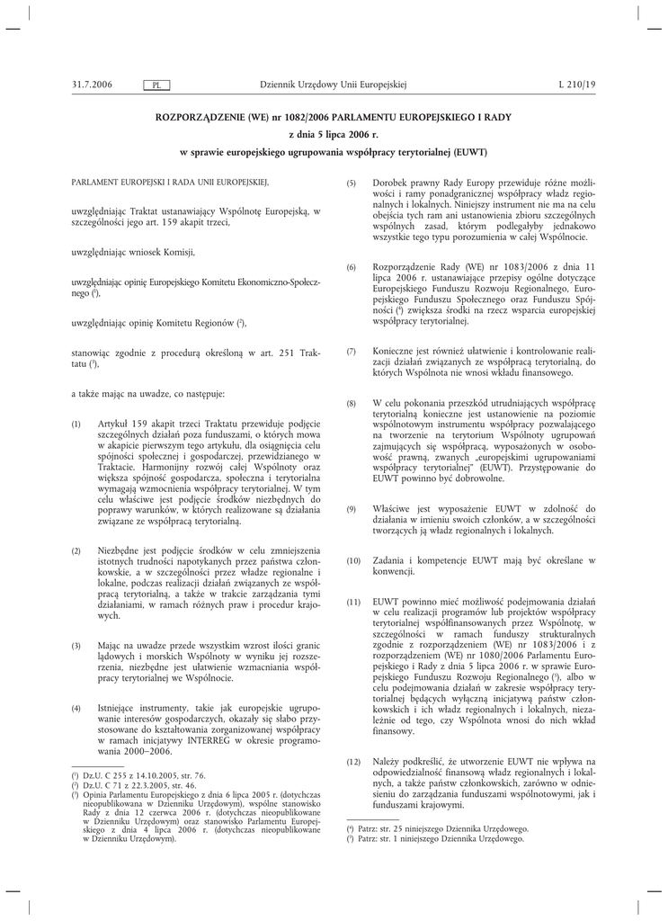 31.7.2006 Dziennik Urzędowy Unii Europejskiej PL L 210/19 ROZPORZĄDZENIE (WE) nr 1082/2006 PARLAMENTU EUROPEJSKIEGO I RADY z dnia 5 lipca 2006 r. w sprawie europejskiego ugrupowania współpracy terytorialnej (EUWT) PARLAMENT EUROPEJSKI I RADA UNII EUROPEJSKIEJ, (5) Dorobek prawny Rady Europy przewiduje różne możliwości i ramy ponadgranicznej współpracy władz regionalnych i lokalnych. Niniejszy instrument nie ma na celu obejścia tych ram ani ustanowienia zbioru szczególnych wspólnych zasad, którym podlegałyby jednakowo wszystkie tego typu porozumienia w całej Wspólnocie. (6) Rozporządzenie Rady (WE) nr 1083/2006 z dnia 11 lipca 2006 r. ustanawiające przepisy ogólne dotyczące Europejskiego Funduszu Rozwoju Regionalnego, Europejskiego Funduszu Społecznego oraz Funduszu Spójności (4) zwiększa środki na rzecz wsparcia europejskiej współpracy terytorialnej. (7) Konieczne jest również ułatwienie i kontrolowanie realizacji działań związanych ze współpracą terytorialną, do których Wspólnota nie wnosi wkładu finansowego. (8) W celu pokonania przeszkód utrudniających współpracę terytorialną konieczne jest ustanowienie na poziomie wspólnotowym instrumentu współpracy pozwalającego na tworzenie na terytorium Wspólnoty ugrupowań zajmujących się współpracą, wyposażonych w osobowość prawną, zwanych „europejskimi ugrupowaniami współpracy terytorialnej” (EUWT). Przystępowanie do EUWT powinno być dobrowolne. (9) Właściwe jest wyposażenie EUWT w zdolność do działania w imieniu swoich członków, a w szczególności tworzących ją władz regionalnych i lokalnych. (10) Zadania i kompetencje EUWT mają być określane w konwencji. (11) EUWT powinno mieć możliwość podejmowania działań w celu realizacji programów lub projektów współpracy terytorialnej współfinansowanych przez Wspólnotę, w szczególności w ramach funduszy strukturalnych zgodnie z rozporządzeniem (WE) nr 1083/2006 i z rozporządzeniem (WE) nr 1080/2006 Parlamentu Europejskiego i Rady z dnia 5 lipca 2006 r. w sprawie Europejskiego Funduszu Rozwoju Regionalnego (5), albo w celu podejmowania działań w zakresie współpracy terytorialnej będących wyłączną inicjatywą państw członkowskich i ich władz regionalnych i lokalnych, niezależnie od tego, czy Wspólnota wnosi do nich wkład finansowy. (12) Należy podkreślić, że utworzenie EUWT nie wpływa na odpowiedzialność finansową władz regionalnych i lokalnych, a także państw członkowskich, zarówno w odniesieniu do zarządzania funduszami wspólnotowymi, jak i funduszami krajowymi. uwzględniając Traktat ustanawiający Wspólnotę Europejską, w szczególności jego art. 159 akapit trzeci, uwzględniając wniosek Komisji, uwzględniając opinię Europejskiego Komitetu Ekonomiczno-Społecznego (1), uwzględniając opinię Komitetu Regionów (2), stanowiąc zgodnie z procedurą określoną w art. 251 Traktatu (3), a także mając na uwadze, co następuje: (1) (2) Artykuł 159 akapit trzeci Traktatu przewiduje podjęcie szczególnych działań poza funduszami, o których mowa w akapicie pierwszym tego artykułu, dla osiągnięcia celu spójności społecznej i gospodarczej, przewidzianego w Traktacie. Harmonijny rozwój całej Wspólnoty oraz większa spójność gospodarcza, społeczna i terytorialna wymagają wzmocnienia współpracy terytorialnej. W tym celu właściwe jest podjęcie środków niezbędnych do poprawy warunków, w których realizowane są działania związane ze współpracą terytorialną. Niezbędne jest podjęcie środków w celu zmniejszenia istotnych trudności napotykanych przez państwa członkowskie, a w szczególności przez władze regionalne i lokalne, podczas realizacji działań związanych ze współpracą terytorialną, a także w trakcie zarządzania tymi działaniami, w ramach różnych praw i procedur krajowych. (3) Mając na uwadze przede wszystkim wzrost ilości granic lądowych i morskich Wspólnoty w wyniku jej rozszerzenia, niezbędne jest ułatwienie wzmacniania współpracy terytorialnej we Wspólnocie. (4) Istniejące instrumenty, takie jak europejskie ugrupowanie interesów gospodarczych, okazały się słabo przystosowane do kształtowania zorganizowanej współpracy w ramach inicjatywy INTERREG w okresie programowania 2000–2006. ( ) Dz.U. C 255 z 14.10.2005, str. 76. (2) Dz.U. C 71 z 22.3.2005, str. 46. (3) Opinia Parlamentu Europejskiego z dnia 6 lipca 2005 r. (dotychczas nieopublikowana w Dzienniku Urzędowym), wspólne stanowisko Rady z dnia 12 czerwca 2006 r. (dotychczas nieopublikowane w Dzienniku Urzędowym) oraz stanowisko Parlamentu Europejskiego z dnia 4 lipca 2006 r. (dotychczas nieopublikowane w Dzienniku Urzędowym). 1 (4) Patrz: str. 25 niniejszego Dziennika Urzędowego. (5) Patrz: str. 1 niniejszego Dziennika Urzędowego. L 210/20 Dziennik Urzędowy Unii Europejskiej PL 31.7.2006 Należy podkreślić, że uprawnienia władz regionalnych i lokalnych jako władz publicznych, a w szczególności uprawnienia policyjne i regulacyjne, nie mogą być przedmiotem konwencji. a) niniejszemu rozporządzeniu; (14) Konieczne jest ustanowienie przez EUWT własnego statutu i ustanowienie własnych organów, a także zasad dotyczących budżetu i ponoszenia odpowiedzialności finansowej EUWT. c) w przypadku spraw nieuregulowanych niniejszym rozporządzeniem lub uregulowanych nim tylko częściowo – prawu państwa członkowskiego, w którym znajduje się siedziba statutowa EUWT. (15) Warunki współpracy terytorialnej powinny być tworzone zgodnie z zasadą pomocniczości określoną w art. 5 Traktatu. Zgodnie z zasadą proporcjonalności określoną w tym artykule niniejsze rozporządzenie nie wykracza poza to, co jest niezbędne do osiągnięcia jego celów, przy dobrowolnym charakterze powoływania EUWT, zgodnie z porządkiem konstytucyjnym każdego z państw członkowskich. W przypadku gdy zgodnie z prawem Wspólnoty lub międzynarodowym prawe