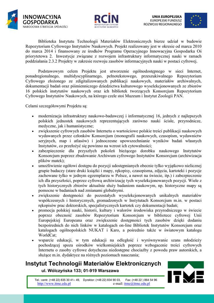 Biblioteka Instytutu Technologii Materiałów Elektronicznych bierze udział w budowie Repozytorium Cyfrowego Instytutów Naukowych. Projekt realizowany jest w okresie od marca 2010 do marca 2014 i finansowany ze środków Programu Operacyjnego Innowacyjna Gospodarka Oś priorytetowa 2. Inwestycje związane z rozwojem infrastruktury informatycznej nauki w ramach poddziałania 2.3.2 Projekty w zakresie rozwoju zasobów informacyjnych nauki w postaci cyfrowej. Podstawowym celem Projektu jest utworzenie ogólnodostępnego w sieci Internet, ponadregionalnego, multidyscyplinarnego, pełnotekstowego, przeszukiwalnego Repozytorium Cyfrowego złożonego ze zdigitalizowanych publikacji naukowych, materiałów archiwalnych, dokumentacji badań oraz piśmienniczego dziedzictwa kulturowego wyselekcjonowanych ze zbiorów 16 polskich instytutów naukowych oraz ich bibliotek tworzących Konsorcjum Repozytorium Cyfrowego Instytutów Naukowych, na którego czele stoi Muzeum i Instytut Zoologii PAN. Celami szczegółowymi Projektu są: modernizacja infrastruktury naukowo-badawczej i informatycznej 16, jednych z najlepszych polskich jednostek naukowych reprezentujących zarówno nauki ścisłe, przyrodnicze, medyczne, jak i humanistyczne; zwiększenie cyfrowych zasobów Internetu o wartościowe polskie treści publikacji naukowych wydawanych przez członków Konsorcjum (monografii naukowych, czasopism, wydawnictw seryjnych, map i atlasów) i jednoczesne upowszechnianie wyników badań własnych Instytutów, co przełożyć się powinno na wzrost ich cytowalności; zabezpieczenie dla przyszłych pokoleń bieżącego dorobku naukowego Instytutów Konsorcjum poprzez zbudowanie Archiwum cyfrowego Instytutów Konsorcjum (archiwizacja plików matek); umożliwienie ogółowi dostępu do pozycji udostępnianych obecnie tylko wyjątkowo nielicznej grupie badaczy (stare druki książki i mapy, rękopisy, czasopisma, zdjęcia, kartoteki i pozycje zachowane tylko w jednym egzemplarzu w Polsce, a nawet na świecie, itp.) i zabezpieczenie ich dla przyszłości, poprzez cyfrową archiwizację tych wyselekcjonowanych pozycji. Wiele z tych historycznych zbiorów aktualnie służy badaniom naukowym, np. historyczne mapy są pomocne w badaniach nad zmianami globalnymi. zwiększenie dostępności do pozostałych wyselekcjonowanych unikalnych materiałów współczesnych i historycznych, gromadzonych w Instytutach Konsorcjum m.in. w postaci rękopisów prac doktorskich, specjalistycznych kartotek czy dokumentacji badań; promocja polskiej nauki, historii, kultury i walorów środowiska przyrodniczego w świecie poprzez obecność zasobów Repozytorium Konsorcjum w bibliotece cyfrowej Unii Europejskiej Europeana oraz zwiększenie dostępności tych zasobów dzięki dodaniu bezpośrednich do nich linków w katalogach on-line Bibliotek Instytutów Konsorcjum oraz katalogach ogólnopolskich NUKAT i Karo, a pośrednio także w światowym katalogu WorldCat; wsparcie edukacji, w tym edukacji na odległość i wyrównywanie szans młodzieży pochodzącej spoza ośrodków wielkomiejskich poprzez wzbogacenie treści cyfrowych Internetu o zasoby cyfrowe dotychczas niedostępne chociażby z powodu praw autorskich, a służące m.in. dydaktyce na różnych poziomach nauczania; Instytut Technologii Materiałów Elektronicznych ul. Wólczyńska 133; 01-919 Warszawa Tel.: centr. (+48 22) 835 30 41 49, http://www.itme.edu.pl Dyrektor: (+48 22) 834 90 03, Fax: (+48 22 ) 864 54 96 e-mail: [email protected] podnoszenie umiejętności użytkowników bibliotek naukowych Konsorcjum w zakresie wyszukiwania literatury naukowej w wartościowych zasobach Internetu w ramach spotkań informacyjnych promujących Projekt. pomoc merytoryczna i organizacyjna mniej zaawansowanym członkom Konsorcjum, która umożliwi włączenie wyników badań ich Instytutów do światowego obiegu informacji; W ramach Projektu planowana jest cyfryzacja ponad 25 tysięcy pozycji ze zbiorów Bibliotek i Instytutów Konsorcjum. Realizacja Projektu stanowić będzie początkiem pracy czekającej Instytuty, które będą chciały pokazać Światu swój dorobek naukowy (część z Instytutów tworzących Konsorcjum posiada biblioteki zaliczone do Narodowego Zasobu Bibliotecznego). Zakres tematyczny bazy rozciąga się na dziedziny od humanistycznych do ścisłych. Repozytorium Cyfrowe Instytutów Naukowych będzie ogólnodostępną platformą dostępu do cyfrowych zbiorów zarówno dla środowiska naukowców, pracowników gospodarki, pracowników informacji naukowej, ale też uczniów, studentów i całego społeczeństwa. Zdigitalizowane zbiory będą udostępnione w Internecie na platformie Repozytorium utworzonego za pomocą systemu dLibra, który jest standardem obecnie używanym w Polsce. W ramach realizacji projektu Instytut Technologii Materiałów Elektronicznych zamierza dokonać digitalizacji i udostępnienia w internecie ponad 13 tysięcy stron publikacji z zakresu wydawanych przez Instytut czasopism: „Materiały Elektroniczne” i „Prace ITME”. W projekcie RCIN uczestniczą: Instytut Archeologii i Etnologii Polskiej Akademii Nauk Instytut Badań Literackich Polskiej Akademii Nauk Instytut Biologii Doświadczalnej im. Marcelego Nenckiego Polskiej Akademii Nauk Instytut Biologii Ssaków Polskiej Akademii Nauk Instytut Chemii Fizycznej Polskiej Akademii Nauk Instytut Chemii Organicznej Polskiej Akademii Nauk Instytut Filozofii i Socjologii Polskiej Akademii Nauk Instytut Geografii i Przestrzennego Zagospodarowania im. Stanisława Leszczyckiego Polskiej Akademii Nauk Instytut Historii im. Tadeusza Manteuffla Polskiej Akademii Nauk Instytut Języka Polskiego Polskiej Akademii Nauk Instytut Matematyczny Polskiej Akademii Nauk Instytut Medycyny Doświadczalnej i Klinicznej im. Mirosława Mossakowskiego Polskiej Akademii Nauk Instytut Podstawowych Problemów Techniki Polskiej Akademii Nauk Instytut Slawistyki Polskiej Akademii Nauk Instytut Technologii Materiałów Elektr