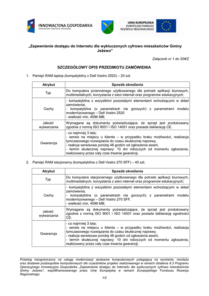 „Zapewnienie dostępu do Internetu dla wykluczonych cyfrowo mieszkańców Gminy Jeżewo” Załącznik nr 1 do SIWZ SZCZEGÓŁOWY OPIS PRZEDMIOTU ZAMÓWIENIA 1. Pamięć RAM laptop (kompatybilny z Dell Vostro 2520) – 20 szt. Atrybut Sposób określenia Typ Do komputera przenośnego użytkowanego dla potrzeb aplikacji biurowych, multimedialnych, korzystania z sieci internet oraz programów edukacyjnych; Cechy - kompatybilna z wszystkimi pozostałymi elementami wchodzącymi w skład zamówienia; - kompatybilna (o parametrach nie gorszych) z parametrami modelu modernizowanego – Dell Vostro 2520 - wielkość min. 4096 MB; Jakość wytwarzania Wymagane są dokumenty poświadczające, że sprzęt jest produkowany zgodnie z normą ISO 9001 i ISO 14001 oraz posiada deklarację CE. Gwarancja - co najmniej 3 lata; - serwis na miejscu u klienta – w przypadku braku możliwości, realizacja tymczasowego rozwiązania do czasu skutecznej naprawy, - reakcja serwisowa poniżej 48 godzin od zgłoszenia awarii, - termin skutecznej naprawy: 10 dni roboczych od momentu zgłoszenia, realizowany przez cały czas trwania gwarancji. 2. Pamięć RAM stacjonarny (kompatybilna z Dell Vostro 270 SFF) – 40 szt. Atrybut Sposób określenia Typ Do komputera stacjonarnego użytkowanego dla potrzeb aplikacji biurowych, multimedialnych, korzystania z sieci internet oraz programów edukacyjnych; Cechy - kompatybilna z wszystkimi pozostałymi elementami wchodzącymi w skład zamówienia; - kompatybilna (o parametrach nie gorszych) z parametrami modelu modernizowanego – Dell Vostro 270 SFF, - wielkość min. 4096 MB; Jakość wytwarzania Wymagane są dokumenty poświadczające, że sprzęt jest produkowany zgodnie z normą ISO 9001 i ISO 14001 oraz posiada deklarację zgodności CE. Gwarancja - co najmniej 3 lata; - serwis na miejscu u klienta – w przypadku braku możliwości, realizacja tymczasowego rozwiązania do czasu skutecznej naprawy, - reakcja serwisowa poniżej 48 godzin od zgłoszenia awarii, - termin skutecznej naprawy: 10 dni roboczych od momentu zgłoszenia, realizowany przez cały czas trwania gwarancji. Przetarg nieograniczony na usługę modernizacji zestawów komputerowych polegającą na wymianie, montażu oraz dostawie podzespołów komputerowych dla uczestników projektu realizowanego w ramach działania 8.3 Programu Operacyjnego Innowacyjna Gospodarka „Zapewnienie dostępu do Internetu dla wykluczonych cyfrowo mieszkańców Gminy Jeżewo”, współfinansowanego przez Unię Europejską w ramach Europejskiego Funduszu Rozwoju Regionalnego. 1/2 „Zapewnienie dostępu do Internetu dla wykluczonych cyfrowo mieszkańców Gminy Jeżewo” 3. Dysk twardy (kompatybilny z Dell Vostro 2520 i Dell Vostro 270 SFF)– 60 szt. Atrybut Sposób określenia Typ Do komputera przenośnego i stacjonarnego użytkowanego dla potrzeb aplikacji biurowych, multimedialnych, korzystania z sieci internet oraz programów edukacyjnych; Cechy - kompatybilny z wszystkimi pozostałymi elementami wchodzącymi w skład zamówienia; - kompatybilna z parametrami modelu modernizowanego – Dell Vostro 2520 i Dell Vostro 270SFF - pojemność: nie mniejsza niż 250 GB; Jakość wytwarzania Wymagane są dokumenty poświadczające, że sprzęt jest produkowany zgodnie z normą ISO 9001 i ISO 14001 oraz posiada deklarację zgodności CE. Parametry producenta Prędkość zapisu minimum: 520 MB/s Prędkość odczytu minimum: 540 MB/s Niezawodność średniego czasu bezawaryjnej pracy (MTBF) producenta: 2000000 godzin. Gwarancja - co najmniej 3 lata; - serwis na miejscu u klienta – w przypadku braku możliwości, realizacja tymczasowego rozwiązania do czasu skutecznej naprawy, - reakcja serwisowa poniżej 48 godzin od zgłoszenia awarii, - termin skutecznej naprawy: 10 dni roboczych od momentu zgłoszenia, realizowany przez cały czas trwania gwarancji. Dodatkowe akcesoria i informacje Do wszystkich komputerów należy dołączyć i zainstalować zewnętrzną kieszeń USB z dotychczasowym dyskiem (40 sztuk 3,5 cala i 20 sztuk 2,5). Montaż zmodernizowanych dysków twardych musi być wykonany w szynie montażowej i miejscu dotychczasowego dysku – zgodnie z aktualną wiedzą techniczną. Przetarg nieograniczony na usługę modernizacji zestawów komputerowych polegającą na wymianie, montażu oraz dostawie podzespołów komputerowych dla uczestników projektu realizowanego w ramach działania 8.3 Programu Operacyjnego Innowacyjna Gospodarka „Zapewnienie dostępu do Internetu dla wykluczonych cyfrowo mieszkańców Gminy Jeżewo”, współfinansowanego przez Unię Europejską w ramach Europejskiego Funduszu Rozwoju Regionalnego. 2/2