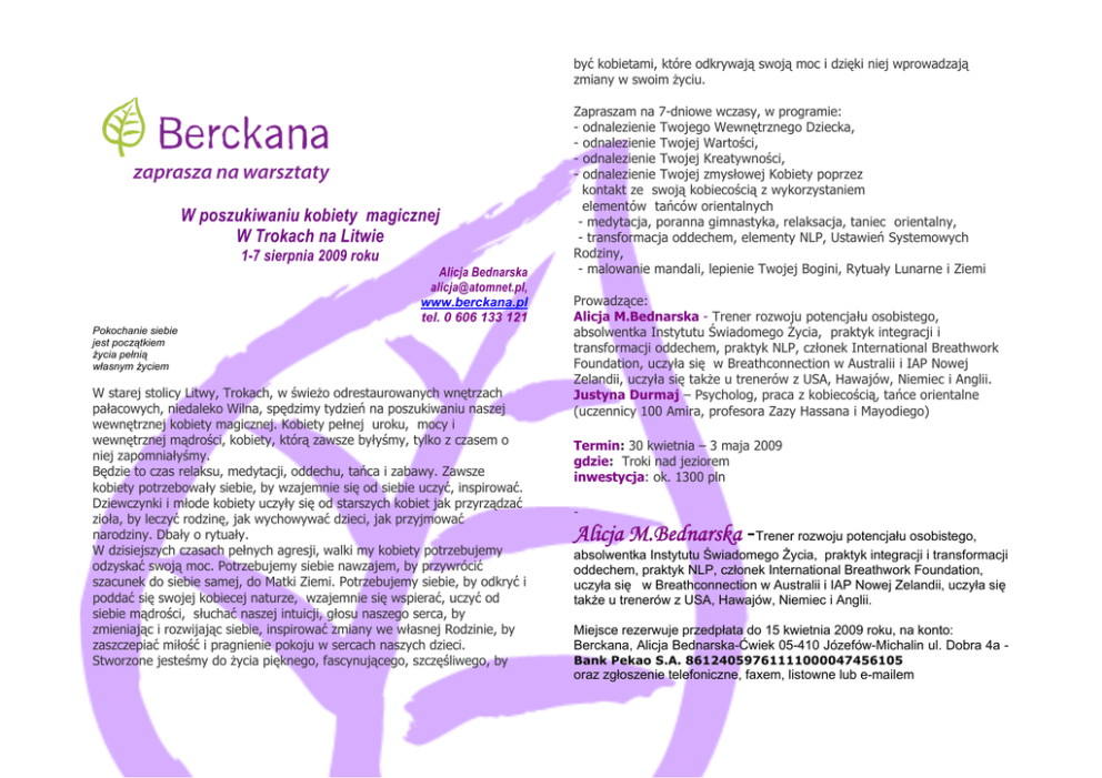 być kobietami, które odkrywają swoją moc i dzięki niej wprowadzają zmiany w swoim życiu. W poszukiwaniu kobiety magicznej W Trokach na Litwie 1-7 sierpnia 2009 roku Alicja Bednarska [email protected], www.berckana.pl tel. 0 606 133 121 Pokochanie siebie jest początkiem życia pełnią własnym życiem W starej stolicy Litwy, Trokach, w świeżo odrestaurowanych wnętrzach pałacowych, niedaleko Wilna, spędzimy tydzień na poszukiwaniu naszej wewnętrznej kobiety magicznej. Kobiety pełnej uroku, mocy i wewnętrznej mądrości, kobiety, którą zawsze byłyśmy, tylko z czasem o niej zapomniałyśmy. Będzie to czas relaksu, medytacji, oddechu, tańca i zabawy. Zawsze kobiety potrzebowały siebie, by wzajemnie się od siebie uczyć, inspirować. Dziewczynki i młode kobiety uczyły się od starszych kobiet jak przyrządzać zioła, by leczyć rodzinę, jak wychowywać dzieci, jak przyjmować narodziny. Dbały o rytuały. W dzisiejszych czasach pełnych agresji, walki my kobiety potrzebujemy odzyskać swoją moc. Potrzebujemy siebie nawzajem, by przywrócić szacunek do siebie samej, do Matki Ziemi. Potrzebujemy siebie, by odkryć i poddać się swojej kobiecej naturze, wzajemnie się wspierać, uczyć od siebie mądrości, słuchać naszej intuicji, głosu naszego serca, by zmieniając i rozwijając siebie, inspirować zmiany we własnej Rodzinie, by zaszczepiać miłość i pragnienie pokoju w sercach naszych dzieci. Stworzone jesteśmy do życia pięknego, fascynującego, szczęśliwego, by Zapraszam na 7-dniowe wczasy, w programie: - odnalezienie Twojego Wewnętrznego Dziecka, - odnalezienie Twojej Wartości, - odnalezienie Twojej Kreatywności, - odnalezienie Twojej zmysłowej Kobiety poprzez kontakt ze swoją kobiecością z wykorzystaniem elementów tańców orientalnych - medytacja, poranna gimnastyka, relaksacja, taniec orientalny, - transformacja oddechem, elementy NLP, Ustawień Systemowych Rodziny, - malowanie mandali, lepienie Twojej Bogini, Rytuały Lunarne i Ziemi Prowadzące: Alicja M.Bednarska - Trener rozwoju potencjału osobistego, absolwentka Instytutu Świadomego Życia, praktyk integracji i transformacji oddechem, praktyk NLP, członek International Breathwork Foundation, uczyła się w Breathconnection w Australii i IAP Nowej Zelandii, uczyła się także u trenerów z USA, Hawajów, Niemiec i Anglii. Justyna Durmaj – Psycholog, praca z kobiecością, tańce orientalne (uczennicy 100 Amira, profesora Zazy Hassana i Mayodiego) Termin: 30 kwietnia – 3 maja 2009 gdzie: Troki nad jeziorem inwestycja: ok. 1300 pln - Alicja M.Bednarska -Trener rozwoju potencjału osobistego, absolwentka Instytutu Świadomego Życia, praktyk integracji i transformacji oddechem, praktyk NLP, członek International Breathwork Foundation, uczyła się w Breathconnection w Australii i IAP Nowej Zelandii, uczyła się także u trenerów z USA, Hawajów, Niemiec i Anglii. Miejsce rezerwuje przedpłata do 15 kwietnia 2009 roku, na konto: Berckana, Alicja Bednarska-Ćwiek 05-410 Józefów-Michalin ul. Dobra 4a Bank Pekao S.A. 86124059761111000047456105 oraz zgłoszenie telefoniczne, faxem, listowne lub e-mailem