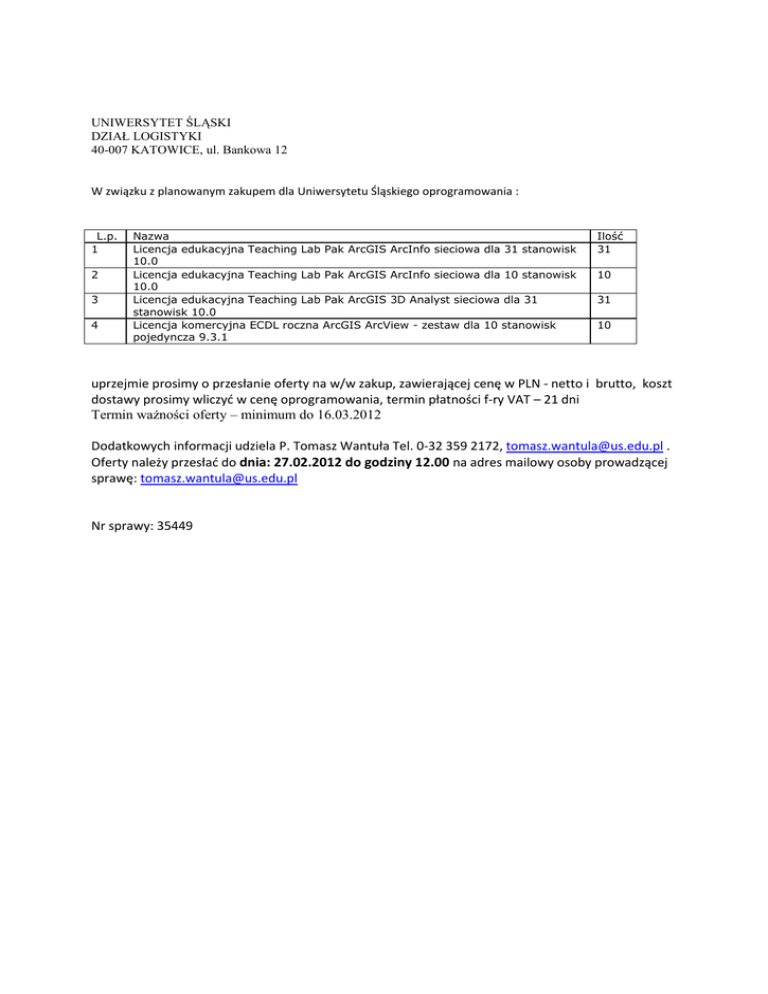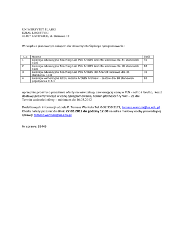UNIWERSYTET ŚLĄSKI DZIAŁ LOGISTYKI 40-007 KATOWICE, ul. Bankowa 12 W związku z planowanym zakupem dla Uniwersytetu Śląskiego oprogramowania : L.p. 1 2 3 4 Nazwa Licencja edukacyjna Teaching Lab Pak ArcGIS ArcInfo sieciowa dla 31 stanowisk 10.0 Licencja edukacyjna Teaching Lab Pak ArcGIS ArcInfo sieciowa dla 10 stanowisk 10.0 Licencja edukacyjna Teaching Lab Pak ArcGIS 3D Analyst sieciowa dla 31 stanowisk 10.0 Licencja komercyjna ECDL roczna ArcGIS ArcView - zestaw dla 10 stanowisk pojedyncza 9.3.1 Ilość 31 10 31 10 uprzejmie prosimy o przesłanie oferty na w/w zakup, zawierającej cenę w PLN - netto i brutto, koszt dostawy prosimy wliczyć w cenę oprogramowania, termin płatności f-ry VAT – 21 dni Termin ważności oferty – minimum do 16.03.2012 Dodatkowych informacji udziela P. Tomasz Wantuła Tel. 0-32 359 2172, [email protected] . Oferty należy przesłać do dnia: 27.02.2012 do godziny 12.00 na adres mailowy osoby prowadzącej sprawę: [email protected] Nr sprawy: 35449