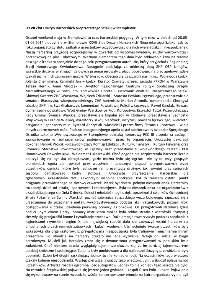 XXVII Zlot Drużyn Harcerskich Nieprzetartego Szlaku w Stemplewie Ostatni weekend maja w Stemplewie to czas harcerskiej przygody. W tym roku w dniach od 28.0501.06.2014r. odbył się w Stemplewie XXVII Zlot Drużyn Harcerskich Nieprzetartego Szlaku. Jak co roku organizatorzy zlotu zadbali o uczestników przygotowując dla nich wiele atrakcji i niespodzianek. Naszą harcerską przygodę rozpoczęliśmy w czwartek od wspólnej kwaterki, służby wartowniczej i porządkowej na placu obozowym. Ważnym elementem tego dnia było oddawanie krwi na terenie naszego ośrodka w specjalnie do tego celu przygotowanym autobusie, który przyjechał z Regionalnej Stacji Honorowego Krwiodawstwa. Następnie podążając za orkiestrą dętą ZHP OSP Uniejów, wszystkie drużyny w strojach galowych przemaszerowały z placu obozowego na plac apelowy, gdzie czekali już na nich zaproszeni goście. W tym roku obecnością zaszczycili nas m.in.: Wojewoda Łódzki Jolanta Chełmioska, Kamioski Jan – Łódzki Kurator Oświaty, prezes zarządu PFRON w Warszawie Teresa Hernik, Anna Mroczek – Dyrektor Regionalnego Centrum Polityki Społecznej Urzędu Marszałkowskiego w Łodzi, hm. Kołakowska Dorota – Kierownik Wydziału Nieprzetartego Szlaku Głównej Kwatery ZHP Warszawa, Wojciech Zdziarski – Starosta Powiatu Łęczyckiego, przedstawiciele senatora Błaszczyka, wiceprzewodniczący ZHP harcmistrz Marian Antonik, komendantka Chorągwi Łódzkiej ZHP hm. Ewa Grabarczyk, komendant Powiatowej Policji w Łęczycy p. Paweł Karolak, Edward Cymer radny powiatowy, Wójt Gminy Wartkowice Piotr Kuropatwa, Krzysztof Tutak Przewodniczący Rady Gminy Świnice Warckie, przedstawiciele kopalni soli w Kłodawie, przedstawiciel Jednostki Wojskowej w Leźnicy Wielkiej, dyrektorzy szkół, placówek, instytucji powiatu łęczyckiego, wieloletni przyjaciele i sponsorzy m.in. Ryszard Andrysiak właściciel i prezes firmy Eltrans z Chorzowa i wiele innych zaproszonych osób. Podczas inauguracyjnego apelu został udekorowany sztandar Specjalnego Ośrodka szkolno Wychowawczego w Stemplewie odznaką honorową PCK III stopnia za zasługi i zaangażowanie w realizację celów podejmowanych przez tę organizację. Uroczystej dekoracji dokonali Henryk Wójcik –przewodniczący Komisji Edukacji , Kultury, Turystyki i Kultury Fizycznej oraz Promocji Starostwa Powiatowego w Łęczycy oraz przedstawiciel wojewódzkiego zarządu PCK Honorowych Dawców Krwi Waldemar Łukaszewski. Chod pogoda nie rozpieszczała harcerze licznie odliczyli się na ognisku obrzędowym, gdzie można było się ogrzad nie tylko przy gorących płomieniach ognia ale również przy wesołych i tanecznych pląsach przygotowanych przez uczestników ogniska, które były jednocześnie prezentacją drużyny, jak również przy śpiewach zespołu ogniskowego kadry zlotowej. Uroczyste przyrzeczenie harcerskie dla zgłoszonych uczestników Zlotu zakooczyło wspólne spotkanie. Był to zarazem ostatni punkt programu przewidzianego na zlotowy czwartek. Piątek był dniem pełnym niespodzianek. Uczestnicy rozpoczęli dzieo od atrakcji sportowych i rekreacyjnych. Była to niespodzianka od organizatorów z okazji zbliżającego się Dnia Dziecka. Dzieci i młodzież mogli dzięki uprzejmości członków Ochotniczej Straży Pożarnej ze Świnic Warckich poznad tajemnice strażackiego wozu bojowego, zapoznad się z urządzeniem do przecinania metalu wykorzystywanego podczas akcji ratunkowych, poznali kroki postępowania w czasie udzielania pierwszej pomocy. Członkowie LOK przygotowali strzelnicę gdzie pod czujnym okiem i przy pomocy instruktora można było oddad strzały z wiatrówki. Sympatią cieszyły się przejażdżki konne i rywalizacje szachowe. Duże emocje towarzyszyły podczas spotkania z legionistami rzymskimi Legion X, ale największą radośd dało się zauważyd wśród harcerzy na dmuchanych przestrzennych zabawkach i kulach wodnych. Uśmiechnięte twarze uczestników były wskazówką dla organizatorów, iż przygotowana niespodzianka była trafionym i niezmiernie miłym prezentem. Po obiedzie na harcerzy czekało nie lada wyzwanie. Wzięli oni udział w biegu patrolowym. Musieli jak Herakles zmóc się z dwunastoma przygotowanymi w pobliskim lesie zadaniami. Chod niektóre zdania wyglądały tajemniczo okazało się, że im bardziej tajemnicze tym bardziej śmieszne i zaskakujące. Zadania były punktowane a dla najlepszej drużyny przewidziane były upominki. Dzieo był długi i zaskakujący jednak to nie koniec emocji. Na uczestników tego wieczoru czekały kolejne niespodzianki. Występ pierwszej gwiazdy tego wieczoru, Juli , wzbudził aplauz wśród uczestników. Artystka rozdała ogromną ilośd autografów. Jednak to nie koniec - tego jeszcze nie było. Na estradzie Stęplewskiej pojawiła się jeszcze jedna gwiazda - zespół Disco Polo – Joker. Pojawienie się wykonawców na scenie wzbudziło wśród koncertowiczów emocje na które organizatorzy nie byli przygotowani. Napierający na artystów tłum musieli poskromid niezastąpieni chłopcy z drużyny kwatermistrzowskiej. Niestety koncert dobiegło kooca i trzeba było się pożegnad. Sobota to kolejny już dzieo który krył w sobie wiele atrakcji i niespodzianek. Rozpoczął się od warsztatów, na których uczestnicy musieli się wykazad wyobraźnią i twórczością. Organizatorzy zaproponowali trzy stanowiska warsztatowe: „Kwiatowa kula”; „Przybornik” oraz „Osikowe kwiaty”. Zrobiło się strasznie kolorowo i wiosennie nawet pogoda w tym dniu napawała optymizmem i radością. Warsztat „Osikowe kwiaty” został zorganizowany w ramach realizacji programu ekologicznego współfinansowanego przez WFOŚiGW w Łodzi, „Przyroda – Przygoda – Ekologia”. Prowadzony był przez gości z Osikowej Doliny, którzy zaprezentowali nam swoją niezwykłą twórczośd poprzez wystawę wykonywanych prac. Wszyscy po skooczonej pracy mogli zrobid sobie pamiątkowe zdjęcie w olbrzymim osikowy