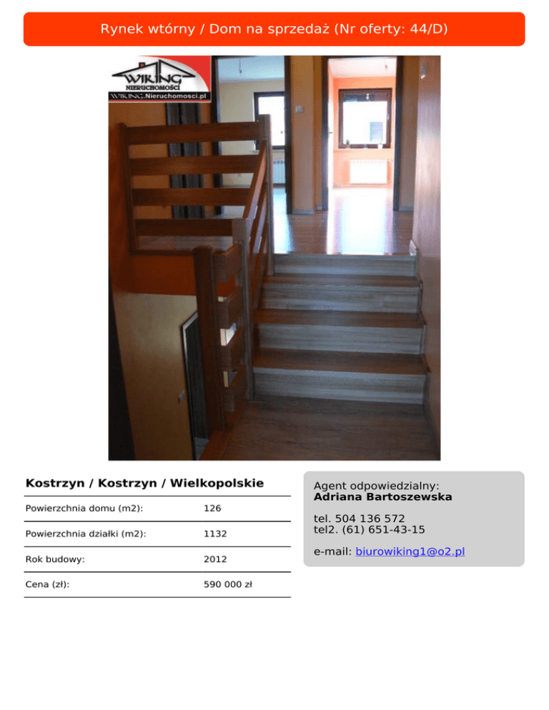 Rynek wtórny / Dom na sprzedaż (Nr oferty: 44/D) Kostrzyn / Kostrzyn / Wielkopolskie Powierzchnia domu (m2): 126 Powierzchnia działki (m2): 1132 Rok budowy: 2012 Cena (zł): 590 000 zł Agent odpowiedzialny: Adriana Bartoszewska tel. 504 136 572 tel2. (61) 651-43-15 e-mail: [email protected] Serdecznie zapraszamy na naszą stronę internetową, gdzie znajdą Państwo szczegóły oferty. www.wiking.nieruchomosci.pl
