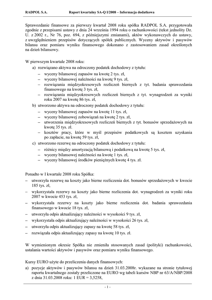 RADPOL S.A. Raport kwartalny SA-Q I/2008 – Informacja dodatkowa Sprawozdanie finansowe za pierwszy kwartał 2008 roku spółka RADPOL S.A. przygotowała zgodnie z przepisami ustawy z dnia 24 września 1994 roku o rachunkowości (tekst jednolity Dz. U. z 2002 r., Nr 76, poz. 694, z późniejszymi zmianami), aktów wykonawczych do ustawy, z uwzględnieniem przepisów dotyczących spółek publicznych. Wyceny aktywów i pasywów bilansu oraz pomiaru wyniku finansowego dokonano z zastosowaniem zasad określonych na dzień bilansowy. W pierwszym kwartale 2008 roku: a) rozwiązano aktywa na odroczony podatek dochodowy z tytułu: wyceny bilansowej zapasów na kwotę 2 tys. zł, wyceny bilansowej należności na kwotę 9 tys. zł, rozwiązania międzyokresowych rozliczeń biernych z tyt. badania sprawozdania finansowego na kwotę 3 tys. zł, rozwiązania międzyokresowych rozliczeń biernych z tyt. wynagrodzeń za wyniki roku 2007 na kwotę 86 tys. zł, b) utworzono aktywa na odroczony podatek dochodowy z tytułu: wyceny bilansowej zapasów na kwotę 11 tys. zł, wyceny bilansowej zobowiązań na kwotę 2 tys. zł, utworzenia międzyokresowych rozliczeń biernych z tyt. bonusów sprzedażowych na kwotę 35 tys. zł. kosztów pracy, które w myśl przepisów podatkowych są kosztem uzyskania po zapłacie, na kwotę 59 tys. zł, c) utworzono rezerwę na odroczony podatek dochodowy z tytułu: różnicy między amortyzacją bilansową i podatkową na kwotę 5 tys. zł, wyceny bilansowej należności na kwotę 1 tys. zł, wyceny bilansowej środków pieniężnych kwotę 4 tys. zł. Ponadto w I kwartale 2008 roku Spółka: utworzyła rezerwę na koszty jako bierne rozliczenia dot. bonusów sprzedażowych w kwocie 185 tys. zł, wykorzystała rezerwy na koszty jako bierne rozliczenia dot. wynagrodzeń za wyniki roku 2007 w kwocie 453 tys. zł, wykorzystała rezerwy na koszty jako bierne rozliczenia dot. badania sprawozdania finansowego w kwocie 18 tys. zł, utworzyła odpis aktualizujący należności w wysokości 9 tys. zł, wykorzystała odpis aktualizujący należności w wysokości 26 tys. zł, utworzyła odpis aktualizujący zapasy na kwotę 58 tys. zł, rozwiązała odpis aktualizujący zapasy na kwotę 10 tys. zł. W wymienionym okresie Spółka nie zmieniła stosowanych zasad (polityki) rachunkowości, ustalania wartości aktywów i pasywów oraz pomiaru wyniku finansowego. Kursy EURO użyte do przeliczenia danych finansowych: a) pozycje aktywów i pasywów bilansu na dzień 31.03.2008r. wykazane na stronie tytułowej raportu kwartalnego zostały przeliczone na EURO wg tabeli kursów NBP nr 63/A/NBP/2008 z dnia 31.03.2008 roku: 1 EUR = 3,5258, -1- RADPOL S.A. Raport kwartalny SA-Q I/2008 – Informacja dodatkowa b) poszczególne pozycje rachunku zysków i strat oraz rachunku przepływu środków pieniężnych za okres od 01.01.2008 do 31.03.2008 roku zostały przeliczone na EURO na podstawie kursów ogłoszonych przez NBP w tabelach kursów: nr 22/A/NBP/2008 z dnia 31.01.2008 roku, nr 43/A/NBP/2008 z dnia 29.02.2008 roku, nr 63/A/NBP/2008 z dnia 31.03.2008 roku. Średnia arytmetyczna wynosi 10,6722 : 3 = 3,5574. 1. Zwięzły opis istotnych dokonań lub niepowodzeń emitenta w okresie, którego dotyczy raport, wraz z wykazem najważniejszych zdarzeń ich dotyczących. 1.1. W wyniku prowadzonej działalności Spółka w I kwartale 2008 wypracowała przychody ze sprzedaży w wysokości 9.036 tys. zł oraz zysk netto w wysokości 1.766 tys. zł. Wzrost przychodów ze sprzedaży wyniósł 15,67 % w stosunku do analogicznego okresu roku ubiegłego. 1.2. Spółka prowadziła inwestycje w ramach projektu współfinansowanego ze środków UE obejmujące: 1.2.1. System regałów wysokiego składowania oparty na systemie szwajcarskiej firmy DEXION do nowo budowanej części magazynowej w głównej hali 5A. Umowę podpisano z polską firmą LOGIS na kwotę ok. 570 tys. zł. Zgodnie z planem zakończony został pierwszy etap budowy nowego magazynu co pozwoli na terminową realizację dalszych prac budowlanych. Kolejny etap wyposażania powierzchni magazynowej w nowe regały zostanie zakończony w maju 2008r. 1.2.2. Oprogramowanie do zarządzania magazynami wysokiego składowania. Umowę podpisano z polską firmą OPTIDATA na kwotę ok. 200 tys. zł. Zakończone zostały wszystkie prace przygotowawcze do wdrożenia systemu. Uruchomienie nastąpi równolegle z przeprowadzaniem wyrobów do nowo wybudowanego magazynu. 1.2.3. Dwuślimakowa wytłaczarka laboratoryjna do opracowywania nowych składów mieszanek będąca laboratoryjną wersją posiadanej produkcyjnej linii marki THEYSOHN. Umowa podpisana z niemiecką firmą BRABENDER na kwotę ok. 680 tys. zł. Zakończenie tego zadania zostało przesunięte na maj 2008r. 1.2.4. Dwie kompletne linie wytłaczakowe z głowicami do produkcji rur cienkościennych i pogrubionych wyposażone w precyzyjne dozowanie materiału typu grawimetrycznego. Umowę podpisano z polską firmą METALCHEM Toruń na kwotę ok. 1,25 mln zł. Rozpoczęto procedury odbiorowe nowych linii. Po ich zakończeniu nastąpi instalacja, której zakończenie zaplanowano na maj 2008r. 1.2.5. Nowoczesne formy do kapturków (6 szt.) wyposażone w system dysz gorącokanałowych. Umowę podpisano z polską firmą FORMET na kwotę ok. 630 tys. zł. Zgodnie z terminem rozpoczęły się próby nowych form. Zakończenie całej procedury odbiorowej zaplanowano na maj 2008r. 1.2.6. W wyniku odwołania się i zwiększenia puli środków przeznaczonych na unijny program 2.2.1 Spółka uzyskała kolejne dofinansowanie na inwestycje. Dofinansowanie dotyczy urządzenia do badania szczelności rur, które jest niezbędne do uruchomienia usługowego sieciowania rur do ciepłej wody. Usługa taka zostanie uruchomiona po wybudowaniu nowej stacji akceleratora. Wartość inwestycji wynosi 1,6 mln zł, a poziom dofinansowania 50%. W celu realizacji inwestycji podpisano umowę na dostawę z niemieckim producentem. Warto