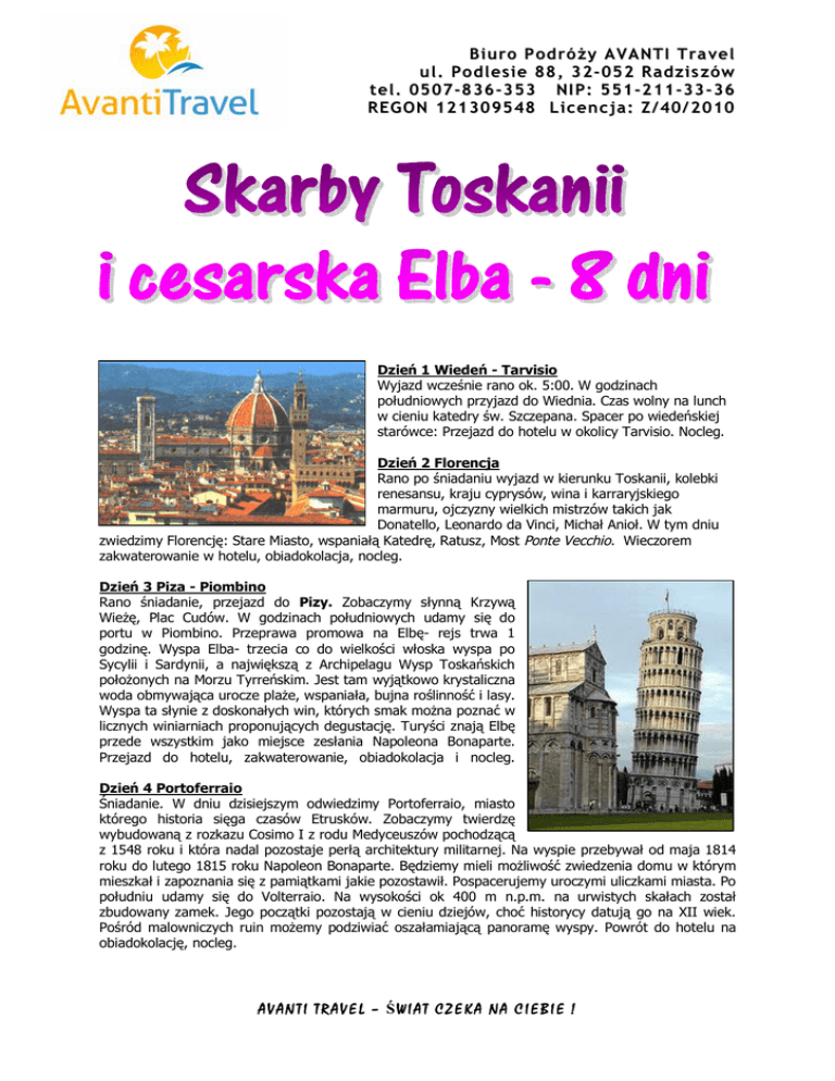 Biuro Pod ró ży AVANTI Tra vel ul. Po dlesie 88 , 3 2-05 2 Radzis zów tel. 0507-836-353 NI P: 551-211-33-36 REGON 121 30 95 48 Licencja: Z/40/ 2 010 Dzień 1 Wiedeń - Tarvisio Wyjazd wcześnie rano ok. 5:00. W godzinach południowych przyjazd do Wiednia. Czas wolny na lunch w cieniu katedry św. Szczepana. Spacer po wiedeńskiej starówce: Przejazd do hotelu w okolicy Tarvisio. Nocleg. Dzień 2 Florencja Rano po śniadaniu wyjazd w kierunku Toskanii, kolebki renesansu, kraju cyprysów, wina i karraryjskiego marmuru, ojczyzny wielkich mistrzów takich jak Donatello, Leonardo da Vinci, Michał Anioł. W tym dniu zwiedzimy Florencję: Stare Miasto, wspaniałą Katedrę, Ratusz, Most Ponte Vecchio. Wieczorem zakwaterowanie w hotelu, obiadokolacja, nocleg. Dzień 3 Piza - Piombino Rano śniadanie, przejazd do Pizy. Zobaczymy słynną Krzywą Wieżę, Plac Cudów. W godzinach południowych udamy się do portu w Piombino. Przeprawa promowa na Elbę- rejs trwa 1 godzinę. Wyspa Elba- trzecia co do wielkości włoska wyspa po Sycylii i Sardynii, a największą z Archipelagu Wysp Toskańskich położonych na Morzu Tyrreńskim. Jest tam wyjątkowo krystaliczna woda obmywająca urocze plaże, wspaniała, bujna roślinność i lasy. Wyspa ta słynie z doskonałych win, których smak można poznać w licznych winiarniach proponujących degustację. Turyści znają Elbę przede wszystkim jako miejsce zesłania Napoleona Bonaparte. Przejazd do hotelu, zakwaterowanie, obiadokolacja i nocleg. Dzień 4 Portoferraio Śniadanie. W dniu dzisiejszym odwiedzimy Portoferraio, miasto którego historia sięga czasów Etrusków. Zobaczymy twierdzę wybudowaną z rozkazu Cosimo I z rodu Medyceuszów pochodzącą z 1548 roku i która nadal pozostaje perłą architektury militarnej. Na wyspie przebywał od maja 1814 roku do lutego 1815 roku Napoleon Bonaparte. Będziemy mieli możliwość zwiedzenia domu w którym mieszkał i zapoznania się z pamiątkami jakie pozostawił. Pospacerujemy uroczymi uliczkami miasta. Po południu udamy się do Volterraio. Na wysokości ok 400 m n.p.m. na urwistych skałach został zbudowany zamek. Jego początki pozostają w cieniu dziejów, choć historycy datują go na XII wiek. Pośród malowniczych ruin możemy podziwiać oszałamiającą panoramę wyspy. Powrót do hotelu na obiadokolację, nocleg. AV ANTI TR AV EL – ŚWI AT CZEKA NA CIEBIE ! Biuro Pod ró ży AVANTI Tra vel ul. Po dlesie 88 , 3 2-05 2 Radzis zów tel. 0507-836-353 NI P: 551-211-33-36 REGON 121 30 95 48 Licencja: Z/40/ 2 010 Dzień 5 Marciana Marina Po śniadaniu czas wolny, plażowanie, odpoczynek. Po południu przejazd do Marciana Marina. Po zaokrętowaniu na statek wycieczkowy rozpoczniemy 2- godzinny rejs po morzu Tyrreńskim, który z pewnością zapisze się w pamięci jako wyjątkowy czas relaksu, będziemy podziwiali wspaniałe widoki wyspy, skarby flory i fauny. Wieczorem powrót do hotelu, obiadokolacja , nocleg. Dzień 6 Monte Cappane Śniadanie. Rano udamy się na Monte Cappane najwyższy szczyt Elby 1017 m.n.p.m. Z miejscowości Font Poggio (359 m.n.p.m.) słynącej z doskonałej wody źródlanej udamy się do miejscowości Marciana - najstarszej osady na Elbie z pełną uroku starą dzielnicą z wąskimi alejkami, arkadami, belwederami oraz kamiennymi schodami ozdobionymi girlandami kwiatów. Następnie wjazd oryginalna kolejką linową na szczyt Cappane skąd podziwiać będziemy panoramę wyspy. Powrót do hotelu, obiadokolacja , nocleg. Dzień 7 Wyjazd do Polski Rano po śniadaniu wykwaterowanie z hotelu, przejazd do portu w Portoferraio i zaokrętowanie na prom do Piombino. Wyjazd w drogę powrotną do Polski. Nocny przejazd. Dzień 8 Polska Przyjazd do Kraju w godzinach rannych. Cena obejmuje: Przejazd komfortowym autokarem 6 noclegów w hotelach **/ *** Wyżywienie: 6 śniadań, 6 obiadokolacji Opieka doświadczonego pilota Ubezpieczenie turystyczne NW + KL + bagaż ( Signal Iduna ) Cena nie obejmuje: opłat wstępów do zwiedzanych obiektów, promu na Elbę, obowiązkowych przewodników, koszt ok. 90 Euro AV ANTI TR AV EL – ŚWI AT CZEKA NA CIEBIE !