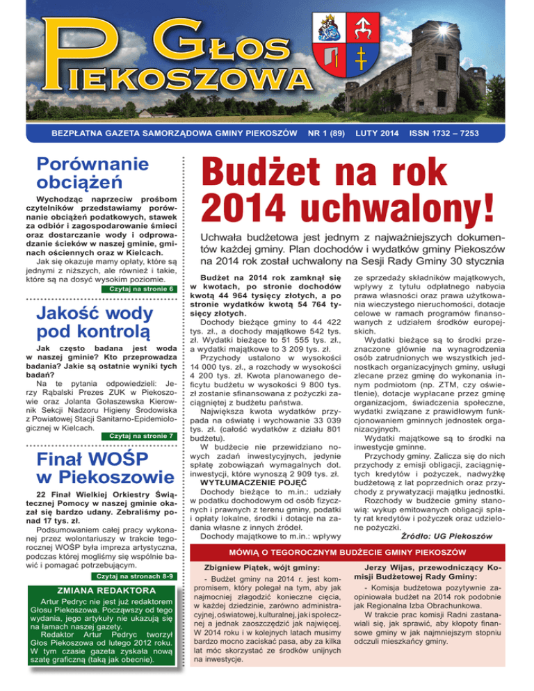 BEZPŁATNA GAZETA SAMORZĄDOWA GMINY PIEKOSZÓW Porównanie obciążeń Wychodząc naprzeciw prośbom czytelników przedstawiamy porównanie obciążeń podatkowych, stawek za odbiór i zagospodarowanie śmieci oraz dostarczanie wody i odprowadzanie ścieków w naszej gminie, gminach ościennych oraz w Kielcach. Jak się okazuje mamy opłaty, które są jednymi z niższych, ale również i takie, które są na dosyć wysokim poziomie. Czytaj na stronie 6 Jakość wody pod kontrolą Jak często badana jest woda w naszej gminie? Kto przeprowadza badania? Jakie są ostatnie wyniki tych badań? Na te pytania odpowiedzieli: Jerzy Rąbalski Prezes ZUK w Piekoszowie oraz Jolanta Gołaszewska Kierownik Sekcji Nadzoru Higieny Środowiska z Powiatowej Stacji Sanitarno-Epidemiologicznej w Kielcach. Czytaj na stronie 7 Finał WOŚP w Piekoszowie 22 Finał Wielkiej Orkiestry Świątecznej Pomocy w naszej gminie okazał się bardzo udany. Zebraliśmy ponad 17 tys. zł. Podsumowaniem całej pracy wykonanej przez wolontariuszy w trakcie tegorocznej WOŚP była impreza artystyczna, podczas której mogliśmy się wspólnie bawić i pomagać potrzebującym. Czytaj na stronach 8-9 ZMIANA REDAKTORA Artur Pedryc nie jest już redaktorem Głosu Piekoszowa. Począwszy od tego wydania, jego artykuły nie ukazują się na łamach naszej gazety. Redaktor Artur Pedryc tworzył Głos Piekoszowa od lutego 2012 roku. W tym czasie gazeta zyskała nową szatę graficzną (taką jak obecnie). NR 1 (89) LUTY 2014 ISSN 1732 – 7253 Budżet na rok 2014 uchwalony! Uchwała budżetowa jest jednym z najważniejszych dokumentów każdej gminy. Plan dochodów i wydatków gminy Piekoszów na 2014 rok został uchwalony na Sesji Rady Gminy 30 stycznia Budżet na 2014 rok zamknął się w kwotach, po stronie dochodów kwotą 44 964 tysięcy złotych, a po stronie wydatków kwotą 54 764 tysięcy złotych. Dochody bieżące gminy to 44 422 tys. zł., a dochody majątkowe 542 tys. zł. Wydatki bieżące to 51 555 tys. zł., a wydatki majątkowe to 3 209 tys. zł. Przychody ustalono w wysokości 14 000 tys. zł., a rozchody w wysokości 4 200 tys. zł. Kwota planowanego deficytu budżetu w wysokości 9 800 tys. zł zostanie sfinansowana z pożyczki zaciągniętej z budżetu państwa. Największa kwota wydatków przypada na oświatę i wychowanie 33 039 tys. zł. (całość wydatków z działu 801 budżetu). W budżecie nie przewidziano nowych zadań inwestycyjnych, jedynie spłatę zobowiązań wymagalnych dot. inwestycji, które wynoszą 2 909 tys. zł. WYTŁUMACZENIE POJĘĆ Dochody bieżące to m.in.: udziały w podatku dochodowym od osób fizycznych i prawnych z terenu gminy, podatki i opłaty lokalne, środki i dotacje na zadania własne z innych źródeł. Dochody majątkowe to m.in.: wpływy ze sprzedaży składników majątkowych, wpływy z tytułu odpłatnego nabycia prawa własności oraz prawa użytkowania wieczystego nieruchomości, dotacje celowe w ramach programów finansowanych z udziałem środków europejskich. Wydatki bieżące są to środki przeznaczone głównie na wynagrodzenia osób zatrudnionych we wszystkich jednostkach organizacyjnych gminy, usługi zlecane przez gminę do wykonania innym podmiotom (np. ZTM, czy oświetlenie), dotacje wypłacane przez gminę organizacjom, świadczenia społeczne, wydatki związane z prawidłowym funkcjonowaniem gminnych jednostek organizacyjnych. Wydatki majątkowe są to środki na inwestycje gminne. Przychody gminy. Zalicza się do nich przychody z emisji obligacji, zaciągniętych kredytów i pożyczek, nadwyżkę budżetową z lat poprzednich oraz przychody z prywatyzacji majątku jednostki. Rozchody w budżecie gminy stanowią: wykup emitowanych obligacji spłaty rat kredytów i pożyczek oraz udzielone pożyczki. Źródło: UG Piekoszów MÓWIĄ O TEGOROCZNYM BUDŻECIE GMINY PIEKOSZÓW Zbigniew Piątek, wójt gminy: - Budżet gminy na 2014 r. jest kompromisem, który polegał na tym, aby jak najmocniej złagodzić konieczne cięcia, w każdej dziedzinie, zarówno administracyjnej, oświatowej, kulturalnej, jak i społecznej a jednak zaoszczędzić jak najwięcej. W 2014 roku i w kolejnych latach musimy bardzo mocno zaciskać pasa, aby za kilka lat móc skorzystać ze środków unijnych na inwestycje. Jerzy Wijas, przewodniczący Komisji Budżetowej Rady Gminy: - Komisja budżetowa pozytywnie zaopiniowała budżet na 2014 rok podobnie jak Regionalna Izba Obrachunkowa. W trakcie prac komisji Radni zastanawiali się, jak sprawić, aby kłopoty finansowe gminy w jak najmniejszym stopniu odczuli mieszkańcy gminy. 2 G ŁYO W DSA RPZREZNEIDAS I Ę B I O R C Ó W W SKRÓCIE Cena za wywóz śmieci pozostaje bez zmian Urząd Gminy w Piekoszowie informuje, iż opłata za odbiór i zagospodarowanie odpadów komunalnych w 2014 roku nie uległa zmianie. Wpłaty należy dokonywać przelewem na poczcie lub w banku na rachunek Urzędu Gminy Piekoszów. Numer konta: 39 8499 0008 0400 0534 2000 0055 W sytuacjach problemowych wypełniony druk wpłaty można otrzymać w Urzędzie Gminy w pokoju nr 112. Powstaje Gminna Rada Działalności Pożytku Publicznego W związku z tworzeniem Gminnej Rady Działalności Pożytku Publicznego, Urząd Gminy zwraca się do organizacji pozarządowych oraz podmiotów wymienionych w art. 3 ust. 3 ustawy z dnia 24 kwietnia 2003 r. o działalności pożytku publicznego i wolontariacie (Dz. U. z 2010 r. Nr 234 poz. 1536 ze zm.) prowadzących działalność na terenie Gminy Piekoszów do wzięcia aktywnego udziału w pracach związanych z jej utworzeniem. Więcej szczegółów na stronie www.piekoszow.pl Dopłaty do ziarna Agencja Rynku Rolnego informuje, że do 25 czerwca można ubiegać się o dopłaty z tytułu zużytego do siewu lub sadzenia materiału siewnego kategorii elitarny lub kwalifikowany mającej charakter pomocy de minimis w rolnictwie, dotyczące materiału siewnego – zbóż ozimych i jarych, roślin strączkowych i ziemniaka – zakupionego i