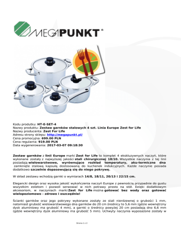 Kodu produtku: HT-E-SET-4 Nazwy produktu: Zestaw garnków stalowych 4 szt. Linia Europe Zest for Life Nazwy producenta: Zest For Life Adresu strony sklepu: http://megapunkt.pl/ Cena promocyjna: 699.00 PLN Cena regularna: 919.00 PLN Data wygenerowania: 2017-03-07 09:18:30 Zestaw garnków z linii Europe marki Zest for Life to komplet 4 ekskluzywnych naczyń, które wykonane zostały z najwyższej jakości stali chirurgicznej 18/10. Wszystkie naczynia z tej linii posiadają wielowarstwowe, wyrównujące rozkład temperatury, aku-termiczne dna zamknięte stalową kapsułą dostosowaną do kuchenek indukcyjnych. Każde naczynie posiada dodatkowo szczelnie dopasowującą się do niego pokrywę. W skład zestawu wchodzą garnki o wymiarach 14/8, 18/11, 20/13 i 22/15 cm. Elegancki design oraz wysoka jakość wykończenia naczyń Europe z pewnością przypadnie do gustu wszystkim estetom i pozwoli serwować w nich potrawy prosto na stół. Dzięki dodatkowym akcesoriom, w naczyniach marki Zest for Life można gotować bez wody oraz gotować wielopoziomowo - zdrowo i oszczędnie! Ścianki garnków oraz jego pokrywy wykonane zostały ze stali nierdzewnej o grubości 1 mm, natomiast grubość wielowarstwowego dna garnków do 20 cm średnicy to 5,6 mm (gdzie wewnętrzny dysk aluminiowy ma grubość 4 mm), a garnki o średnicy powyżej 20 cm posiadają dno 6,6 mm (gdzie wewnętrzny dysk aluminiowy ma grubość 5 mm). Uchwyty naczynia wyposażone zostały w Strona 1 z 2 specjalne wkładki z tworzywa sztucznego, które chronią ręce przed oparzeniem nagrzanym metalem. Naczynia z linii Europe posiadają bardzo praktyczny, szeroki rant, który znacznie ułatwia przelewanie płynów. Strona 2 z 2