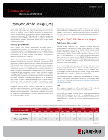 KINGSTON.COM Jakość usługi dla Kingston DC400 SSD Czym jest jakość usługi (QoS) Jakość usługi (QoS) SSD odnosi się do jednolitości i przewidywalności latencji (czasu odpowiedzi) oraz wydajności IOPS (liczba operacji wejścia/ wyjścia na sekundę) podczas obsługi obciążenia odczytem/zapisem. Mierniki QoS wykazują, że w najgorszym przypadku obciążenia badanym w okresie profile latencji i IOPS SSD utrzymują się w określonym zakresie (zwykle do minimum 99,9% punktów danych w ustalonym okresie) bez nieoczekiwanych wartości odstających powodujących nagły spadek wydajności zastosowań. Dlaczego QoS jest istotna Centra danych coraz częściej bezwzględnie wymagają spójnej i przewidywalnej wydajności SSD przez cały czas. Administratorzy IT i architekci pamięci ściśle określają „dopuszczalne poziomy wydajności” przy podejmowaniu decyzji o zakupie SSD. Dostawcy usług przechowywania danych muszą być w stanie zapewnić swoim klientom wysoki poziom pewności co do poziomów wydajności. SSD są tworzone przy użyciu technologii pamięci flash NAND i wymagają kontrolera zarządzającego wszystkimi operacjami wejścia/wyjścia oraz pamięcią flash NAND. Ze względu na cechy pamięci flash NAND kontroler SSD nie zawsze może szybko przetworzyć transakcje odczytu lub zapisu hosta, ponieważ musi również przeprowadzić w tle zadania związane z zarządzaniem pamięcią flash NAND. Zadania te obejmują odśmiecanie, proces czyszczenia nieprawidłowych bloków danych do dostępnego miejsca na SSD oraz niwelowanie zużycia – równą dystrybucję zapisów w całej pamięci flash NAND, która pomaga przedłużyć żywotność SSD. Jeśli oprogramowanie firmowe SSD nie jest odpowiednio zaprojektowane pod kątem wydajnego zarządzania tymi zadaniami w tle dla danego zastosowania firmowego, niespójna wydajność pamięci w ramach danego zastosowania może nie spełniać wymogów IT dotyczących wrażeń użytkownika wynikających z umów o poziomie świadczonych usług (SLA). Obciążenia systemów klienta zwykle nie ujawniają tych okresowych spadków wydajności zastosowań, ponieważ typowe obciążenie klienta zapewnia wiele „czasu bezczynności”, w którym kontroler SSD może przeprowadzić zadania związane z zarządzaniem danymi bez zauważalnej dla użytkownika utraty wydajności. Natomiast obciążenie serwera może być bardzo wymagające dla SSD. Wirtualizacja, bazy danych i aplikacje OLTP reprezentują bardzo losowy wzorzec obciążenia odczytem/zapisem do SSD przez dłuższe okresy, w związku z czym istotne jest, aby oprogramowanie firmowe kontrolera SSD było zoptymalizowane i zapewniało spójne oraz zrównoważone poziomy wydajności. Kingston DC400 SSD dla centrów danych Nadmiarowe bloki pamięci Kingston DC400 oferowany jest z różnym poziomem fabrycznie skonfigurowanych nadmiarowych bloków pamięci, wynoszącym 7% lub 28%. Dostępne pojemności DC400 to 400 GB, 480 GB, 800 GB, 960 GB, 1,6 TB i 1,8 TB. Modele DC400 skonfigurowane z wyższymi poziomami nadmiarowych bloków pamięci będą generalnie zapewniać niższą latencję i wyższą wydajność IOPS niż napędy skonfigurowane z mniejszą liczbą nadmiarowych bloków pamięci. DC400 1,8 TB idealnie nadaje się do zastosowań wymagających pamięci o dużej gęstości przechowywania danych oraz doskonałej wydajności odczytu, przy jednoczesnej dobrej wydajności zapisu i wytrzymałości. Firma Kingston zdaje sobie sprawę, że wykorzystanie SSD przez centra danych wymaga zróżnicowanego podejścia, w związku z czym zapewnia użytkownikom narzędzie w GUI Kingston Storage Manager (KSM), umożliwiające ustawienie nadmiarowych bloków pamięci, które najlepiej odpowiadają celom dotyczącym obciążenia i wytrzymałości. Więcej informacji na temat nadmiarowych bloków pamięci w SSD można znaleźć w dokumencie „Maksymalizacja wydajności i wytrzymałości dzięki nadmiarowym blokom pamięci” („Maximizing Performance and Endurance with Over Provisioning”). QoS Cechy sprzętowe i oprogramowania firmowego Kingston DC400 umożliwiają zapewnienie spójnej latencji odczytu/zapisu oraz wydajności IOPS. Latencja SSD musi osiągnąć określone poziomy usługi dotyczące obciążenia aplikacji dla 99,9% punktów danych lub – w przypadku jeszcze bardziej wymagającej skali – 99,99% punktów danych. SSD, które są zoptymalizowane względem tych SLA wykazują się wyższymi poziomami przewidywalności wydajności. W poniższej tabeli przedstawiono wyniki latencji według pojemności i poziomów QoS dla głębokości kolejki (QD) wynoszącej 1: QoS [ms] (4K, losowo) QD = 1 400GB Odczyt 480GB Zapis Odczyt 800GB Zapis Odczyt 960GB Zapis Odczyt 1600GB Zapis Odczyt Zapis 1800GB Odczyt Zapis Jakość usługi (99,9%) 0.3 0.5 0.2 0.3 0.3 0.5 0.3 3.7 0.3 0.5 0.3 3 Jakość usługi (99,99%) 0.4 2.3 0.4 4.3 0.4 3 0.4 6.7 0.4 3.7 0.4 9.6 jeszcze >> Jakość usługi dla Kingston DC400 SSD Spójność wydajności Oprogramowanie firmowe DC400 zostało zaprojektowane pod kątem spójności wydajności i QoS. Spójność wydajności jest oparta na wynikach testu IOPS i obliczana jako najwolniejszy 1-sekundowy interwał IOPS podzielony przez wynik IOPS podczas całego testu. Spójność wydajności wielu SSD klienta wykorzystywanych w serwerach nie jest przewidywalna. SSD klienta nie są zoptymalizowane pod kątem zapewnienia spójnych IO przy stałych obciążeniach, których wymagają zastosowania firmowe. Jak wcześniej wspomniano, SSD muszą wykonywać operacje w tle, które mogą okresowo zużywać znaczną część szerokości pasma kontrolera SSD, czasowo ograniczając operacje I/O i powodować niepożądane wahania wydajności. Dane techniczne W poniższej tabeli przedstawiono spójność wydajności IOPS DC400 przy 100% obciążeniu odczytem/zapisem 4 KB. DC400 zapewnia spójność wydajności na poziomie do 99% dla odczytu 4 KB i na poziomie 90% dla zapisu 4 KB w całym zakresi