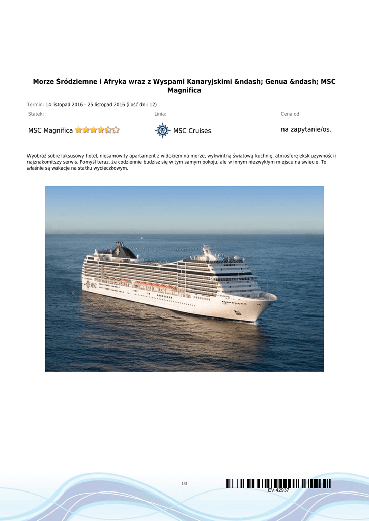 Morze Śródziemne i Afryka wraz z Wyspami Kanaryjskimi – Genua – MSC Magnifica Termin: 14 listopad 2016 - 25 listopad 2016 (ilość dni: 12) Statek: MSC Magnifica Linia: Cena od: MSC Cruises na zapytanie/os. Wyobraź sobie luksusowy hotel, niesamowity apartament z widokiem na morze, wykwintną światową kuchnię, atmosferę ekskluzywności i najznakomitszy serwis. Pomyśl teraz, że codziennie budzisz się w tym samym pokoju, ale w innym niezwykłym miejscu na świecie. To właśnie są wakacje na statku wycieczkowym. 1/3 EV:42937 TRASA REJSU dzień 1 Data Port Wpłynięcie Wypłynięcie poniedziałek 14.11.2016 Genua 17:00 17:00 13:00 18:00 Włochy wtorek 15.11.2016 Barcelona dzień 3 środa 16.11.2016 Dzień na morzu --:-- --:-- dzień 4 czwartek 17.11.2016 Casablanca 08:00 22:00 dzień 5 piątek 18.11.2016 Dzień na morzu --:-- --:-- dzień 6 sobota 19.11.2016 Santa Cruz de Tenerife, Teneryfa / Wyspy Kanaryjskie 08:00 17:00 09:00 17:00 dzień 2 Hiszpania Maroko Hiszpania dzień 7 niedziela 20.11.2016 Funchal, Madera dzień 8 poniedziałek 21.11.2016 Dzień na morzu --:-- --:-- dzień 9 wtorek 22.11.2016 Malaga 08:00 14:00 Portugalia Hiszpania dzień 10 środa 23.11.2016 Dzień na morzu --:-- --:-- dzień 11 czwartek 24.11.2016 Civitavecchia, Rzym 09:00 19:00 piątek 25.11.2016 Genua 08:00 08:00 dzień 12 Włochy Włochy CENNIK 2/3 EV:42937 Legenda Cena katalogowa Outside with Partial View 2 976.31zł Suite Aurea 8 092.55zł Inside Bella 2 086.53zł Balcony Cabin Aurea 6 980.32zł Balcony Cabin Fantastica 4 755.87zł Balcony Cabin Bella 3 866.09zł Ocean View Fantastica 3 643.65zł Inside Fantastica 2 531.42zł Opłaty portowe Cena promocyjna 711.82zł Uwaga! Ceny za osobę w kabinie dwuosobowej. Cena zawiera: zakwaterowanie w kabinie wybranej kategorii; wyżywienie - 3 główne posiłki, przekąski między posiłkami, bufet lub przekąski o północy; napoje serwowane do śniadania i w bufetach samoobsługowych; serwis bagażowy podczas wejścia i zejścia ze statku; serwis kabinowy; korzystanie ze wszystkich urządzeń sportowo - rekreacyjnych znajdujących się na pokładzie statku (basen, jacuzzi, sala fitness, itp.); udział we wszystkich imprezach organizowanych na statku (przedstawienia w teatrze, koncerty, programy animacyjne itp.). Cena nie zawiera: kosztów dojazdu do portu; opłat portowych; ewentualnych noclegów w hotelu przed/po rejsie i transferów; wycieczek fakultatywnych w trakcie rejsu; korzystania z barów, mini baru w kabinie oraz napojów zamawianych w restauracji; korzystania z punktów usługowych (fryzjer, pralnia, fotograf, salon piękności i odnowy biologicznej, internet) i wydatków osobistych; napiwków dla obsługi na statku (kwota uzależniona od długości rejsu); ubezpieczenia KL, NNW i bagaż, kosztów wiz (tam gdzie wymagane). Uwagi: na wszystkich rejsach MSC Cruises można zarezerwować pakiety all inclusive: Allegrissimo 24h: 26€/os./dzień i 12€/dziecko/dzień; Allegrissimo Premium: 44€/os./dzień i 21€/dziecko/dzień (pakiet musi być wykupiony przez każdą osobę zakwaterowaną w kabinie - można zakupić w biurze przed rejsem). Na Państwa życzenie zarezerwujemy przelot, transfery do/z portu, parking, dodatkowe noclegi oraz zadbamy o odpowiednie ubezpieczenie podróżne. 3/3 EV:42937
