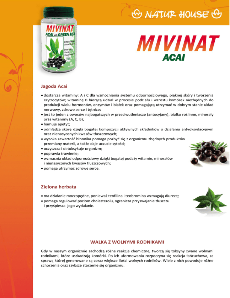 Jagoda Acai dostarcza witaminy: A i C dla wzmocnienia systemu odpornościowego, pięknej skóry i tworzenia erytrocytów; witaminę B biorącą udział w procesie podziału i wzrostu komórek niezbędnych do produkcji wielu hormonów, enzymów i białek oraz pomagającą utrzymać w dobrym stanie układ nerwowy, zdrowe serce i tętnice; jest to jeden z owoców najbogatszych w przeciwutleniacze (antocyjany), białko roślinne, minerały oraz witaminy (A, C, B); hamuje apetyt; odmładza skórę dzięki bogatej kompozycji aktywnych składników o działaniu antyoksydacyjnym oraz nienasyconych kwasów tłuszczowych; wysoka zawartość błonnika pomaga pozbyć się z organizmu zbędnych produktów przemiany materii, a także daje uczucie sytości; oczyszcza i detoksykuje organizm; poprawia trawienie; wzmacnia układ odpornościowy dzięki bogatej podaży witamin, minerałów i nienasyconych kwasów tłuszczowych; pomaga utrzymać zdrowe serce. Zielona herbata ma działanie moczopędne, ponieważ teofilina i teobromina wzmagają diurezę; pomaga regulować poziom cholesterolu, ogranicza przyswajanie tłuszczu i przyśpiesza jego wydalanie. WALKA Z WOLNYMI RODNIKAMI Gdy w naszym organizmie zachodzą różne reakcje chemiczne, tworzą się toksyny zwane wolnymi rodnikami, które uszkadzają komórki. Po ich uformowaniu rozpoczyna się reakcja łańcuchowa, za sprawą której generowane są coraz większe ilości wolnych rodników. Wiele z nich powoduje różne schorzenia oraz szybsze starzenie się organizmu. Przeciwutleniacze to substancje odżywcze pomocne w zwalczaniu nadmiaru wolnych rodników. Jeśli ilość wolnych rodników wytwarzanych w organizmie jest zbyt wysoka, nasz system antyoksydacyjny nie jest w stanie samodzielnie zneutralizować nadmiaru, więc wolne rodniki atakują zdrowe komórki, powodując ich mniej lub bardziej poważne obrażenia. Tak dzieje się na przykład w związku z różnymi schorzeniami takimi jak niektóre rodzaje nowotworów, choroby sercowo-naczyniowe, otyłość, cukrzyca, choroba Alzheimera, choroby oczu, toczeń itp. Powstawanie wolnych rodników Wolne rodniki powstają przy wielu procesach zachodzących w organizmie, na przykład w przebiegu szlaków metabolicznych lub gdy układ odpornościowy jest atakowany przez wirusy i bakterie. Jednakże istnieją również czynniki środowiskowe sprzyjające ich powstawaniu i namnażaniu. Są to np.: zanieczyszczenie środowiska, palenie tytoniu, przebywanie w zadymionych pomieszczeniach. Czynnikami wewnętrznymi, które mają wpływ na powstawanie wolnych rodników są natomiast: zbyt intensywne ćwiczenia fizyczne, stres, lęk, niewłaściwy metabolizm, choroby. Czynniki zewnętrzne to: nieodpowiednia dieta uboga w witaminy i minerały, a bogata w tłuszcze nasycone, palenie tytoniu, nadużywanie alkoholu i innych używek, przyjmowanie niektórych leków, nadmierna ekspozycja na słońce. PORADY Wolne rodniki uszkadzając komórki organizmu przyczyniają się do jego szybszego starzenia i mogą być przyczyną wielu poważnych chorób. Jednakże istnieje wiele sposobów, aby zatrzymać ten proces, można na przykład spożywać produkty o działaniu antyoksydacyjnym.