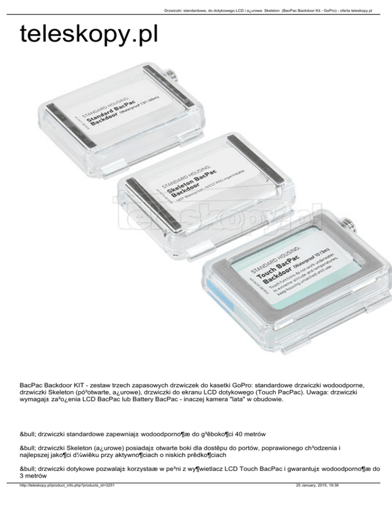 Drzwiczki: standardowe, do dotykowego LCD i a¿urowe Skeleton (BacPac Backdoor Kit - GoPro) - oferta teleskopy.pl teleskopy.pl BacPac Backdoor KIT - zestaw trzech zapasowych drzwiczek do kasetki GoPro: standardowe drzwiczki wodoodporne, drzwiczki Skeleton (pó³otwarte, a¿urowe), drzwiczki do ekranu LCD dotykowego (Touch PacPac). Uwaga: drzwiczki wymagaj± za³o¿enia LCD BacPac lub Battery BacPac - inaczej kamera "lata" w obudowie. • drzwiczki standardowe zapewniaj± wodoodporno¶æ do g³êboko¶ci 40 metrów • drzwiczki Skeleton (a¿urowe) posiadaj± otwarte boki dla dostêpu do portów, poprawionego ch³odzenia i najlepszej jako¶ci d¼wiêku przy aktywno¶ciach o niskich prêdko¶ciach • drzwiczki dotykowe pozwalaj± korzystaæ w pe³ni z wy¶wietlacz LCD Touch BacPac i gwarantuj± wodoodporno¶æ do 3 metrów http://teleskopy.pl/product_info.php?products_id=3251 25 January, 2015, 19:36 Drzwiczki: standardowe, do dotykowego LCD i a¿urowe Skeleton (BacPac Backdoor Kit - GoPro) - oferta teleskopy.pl • drzwiczki wciska siê w miejsce w kasetce - instalacja nie wymaga narzêdzi • pasuje do kamer Hero3 i 3+, do obudowy 3+, Hero4 W NASZEJ OFERCIE POSIADAMY KAMERY GOPRO: najnowsze Hero4 Black i Hero 4 Silver oraz bogaty wybór akcesoriów do GoPro (w tym Hero 3+, 3 i 2) - zachêcamy do kontaktu. Jeste¶my Autoryzowanym Sprzedawc± Detalicznym GoPro - oferowane przez nas kamery i akcesoria GoPro pochodz± z oficjalnej polskiej dystrybucji i posiadaj± 2-letni±, realizowan± w Polsce gwarancjê dystrybutora. http://teleskopy.pl/product_info.php?products_id=3251 25 January, 2015, 19:36