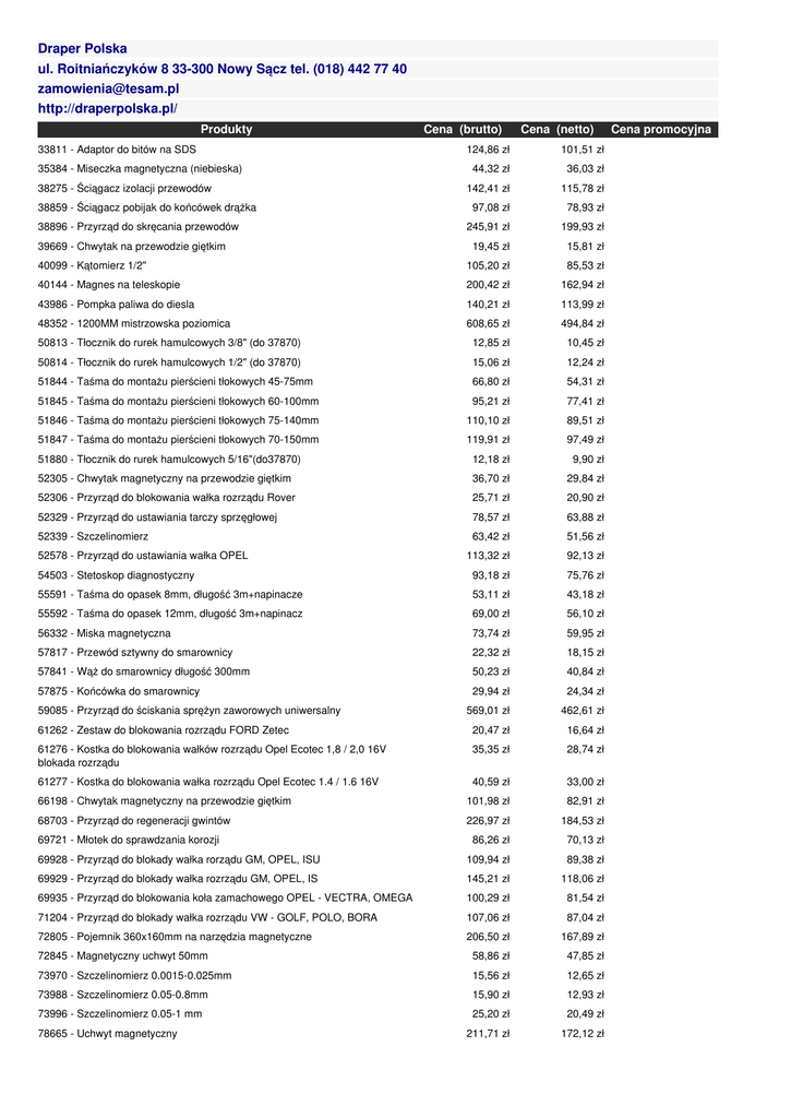 Draper Polska ul. Roitniańczyków 8 33-300 Nowy Sącz tel. (018) 442 77 40 [email protected] http://draperpolska.pl/ Produkty 33811 - Adaptor do bitów na SDS 35384 - Miseczka magnetyczna (niebieska) 38275 - Ściągacz izolacji przewodów 38859 - Ściągacz pobijak do końcówek drążka 38896 - Przyrząd do skręcania przewodów 39669 - Chwytak na przewodzie giętkim Cena (brutto) Cena (netto) 124,86 zł 101,51 zł 44,32 zł 36,03 zł 142,41 zł 115,78 zł 97,08 zł 78,93 zł 245,91 zł 199,93 zł 19,45 zł 15,81 zł 40099 - Kątomierz 1/2" 105,20 zł 85,53 zł 40144 - Magnes na teleskopie 200,42 zł 162,94 zł 43986 - Pompka paliwa do diesla 140,21 zł 113,99 zł 48352 - 1200MM mistrzowska poziomica 608,65 zł 494,84 zł 50813 - Tłocznik do rurek hamulcowych 3/8" (do 37870) 12,85 zł 10,45 zł 50814 - Tłocznik do rurek hamulcowych 1/2" (do 37870) 15,06 zł 12,24 zł 51844 - Taśma do montażu pierścieni tłokowych 45-75mm 66,80 zł 54,31 zł 51845 - Taśma do montażu pierścieni tłokowych 60-100mm 95,21 zł 77,41 zł 51846 - Taśma do montażu pierścieni tłokowych 75-140mm 110,10 zł 89,51 zł 51847 - Taśma do montażu pierścieni tłokowych 70-150mm 119,91 zł 97,49 zł 51880 - Tłocznik do rurek hamulcowych 5/16"(do37870) 12,18 zł 9,90 zł 52305 - Chwytak magnetyczny na przewodzie giętkim 36,70 zł 29,84 zł 52306 - Przyrząd do blokowania wałka rozrządu Rover 25,71 zł 20,90 zł 52329 - Przyrząd do ustawiania tarczy sprzęgłowej 78,57 zł 63,88 zł 52339 - Szczelinomierz 63,42 zł 51,56 zł 52578 - Przyrząd do ustawiania wałka OPEL 113,32 zł 92,13 zł 54503 - Stetoskop diagnostyczny 93,18 zł 75,76 zł 55591 - Taśma do opasek 8mm, długość 3m+napinacze 53,11 zł 43,18 zł 55592 - Taśma do opasek 12mm, długość 3m+napinacz 69,00 zł 56,10 zł 56332 - Miska magnetyczna 73,74 zł 59,95 zł 57817 - Przewód sztywny do smarownicy 22,32 zł 18,15 zł 57841 - Wąż do smarownicy długość 300mm 50,23 zł 40,84 zł 57875 - Końcówka do smarownicy 29,94 zł 24,34 zł 569,01 zł 462,61 zł 61262 - Zestaw do blokowania rozrządu FORD Zetec 20,47 zł 16,64 zł 61276 - Kostka do blokowania wałków rozrządu Opel Ecotec 1,8 / 2,0 16V blokada rozrządu 35,35 zł 28,74 zł 61277 - Kostka do blokowania wałka rozrządu Opel Ecotec 1.4 / 1.6 16V 40,59 zł 33,00 zł 66198 - Chwytak magnetyczny na przewodzie giętkim 101,98 zł 82,91 zł 68703 - Przyrząd do regeneracji gwintów 226,97 zł 184,53 zł 86,26 zł 70,13 zł 69928 - Przyrząd do blokady wałka rorządu GM, OPEL, ISU 109,94 zł 89,38 zł 69929 - Przyrząd do blokady wałka rozrządu GM, OPEL, IS 145,21 zł 118,06 zł 69935 - Przyrząd do blokowania koła zamachowego OPEL - VECTRA, OMEGA 100,29 zł 81,54 zł 71204 - Przyrząd do blokady wałka rozrządu VW - GOLF, POLO, BORA 107,06 zł 87,04 zł 72805 - Pojemnik 360x160mm na narzędzia magnetyczne 59085 - Przyrząd do ściskania sprężyn zaworowych uniwersalny 69721 - Młotek do sprawdzania korozji 206,50 zł 167,89 zł 72845 - Magnetyczny uchwyt 50mm 58,86 zł 47,85 zł 73970 - Szczelinomierz 0.0015-0.025mm 15,56 zł 12,65 zł 73988 - Szczelinomierz 0.05-0.8mm 15,90 zł 12,93 zł 73996 - Szczelinomierz 0.05-1 mm 25,20 zł 20,49 zł 211,71 zł 172,12 zł 78665 - Uchwyt magnetyczny Cena promocyjna 89767 - Stojak pod głowicę silnika 208,72 zł 169,69 zł 10195 - Chwytak magnetyczny 18,77 zł 15,26 zł 10263 - Lusterko na przegubie 44,97 zł 36,56 zł 10409 - Przyrząd do docierania zaworów 9,14 zł 7,43 zł 10913 - Przecinak do nakrętek 9-12 mm 45,33 zł 36,85 zł 10915 - Przecinak do nakrętek 12-16 mm 68,29 zł 55,52 zł 10916 - Przecinak do nakrętek 16-22 mm 77,80 zł 63,25 zł 11176 - Wycinak otworów w skórze 60,21 zł 48,95 zł 11954 - Lusterko na przewodzie giętkim 49,38 zł 40,15 zł 12389 - Nożyce do cięcia plastiku miedzi, aluminium 41,44 zł 33,69 zł 13094 - Ostrza nożyków wymienne duże, łamane 12,18 zł 9,90 zł 13095 - Ostrza nożyków wymienne małe,łamane 11,33 zł 9,21 zł 13892 - Ściągacz do sprężyn zaworowych OHC 261,49 zł 212,59 zł 41,77 zł 33,96 zł 19862 - Ściągacz do kół zamachowych MINI,METRO,AUSTIN 174,54 zł 141,90 zł 26513 - Łyżka do opon 400mm 161,51 zł 131,31 zł 26521 - Łyżka do opon 500mm 212,38 zł 172,67 zł 26539 - Łyżka do opon 600mm 217,86 zł 177,12 zł 26670 - Ściągacz do pierścieni tłokowych 252,41 zł 205,21 zł 26967 - Ściągacz do sprężyn zaworowych OHV 407,60 zł 331,38 zł 27,91 zł 22,69 zł 8,62 zł 7,01 zł 33607 - Ściągacz do zaworów OPEL z hydrauliką 95,05 zł 77,28 zł 11534 - Szczypce do zaciskania przewodów hamulcowych 25,71 zł 20,90 zł 625,69 zł 508,69 zł 19613 - Szczelinomierz 0.03-1.0mm, 0.00 33080 - Magnes na teleskopie (wkrętak) 33554 - Pilnik do styków przerywaczy 12949 - Nożyce do cięcia drutu (7mm) 12950 - Nożyce do cięcia drutu (10mm) 899,87 zł 731,60 zł 12951 - Nożyce do cięcia drutu do śub (13mm) 1.156,21 zł 940,01 zł 12952 - Nożyce do cięcia drutu do śrub (16mm) 1.561,98 zł 1.269,90 zł 13157 - Szczoteczka druciana 15,01 zł 12,20 zł 13701 - Nitownica ręczna z rekojeścią 860-3 437,02 zł 355,30 zł 14001 - Nożyce do cięcia prętów stalowych 6 487,93 zł 396,69 zł 29907 - Klucz nastawny No 16 230mm 98,26 zł 79,89 zł 36923 - Skrobak do uszczelek 37,38 zł 30,39 zł 37439 - Narzędzie do wyciągania o-ringów, uszczelek 61,86 zł 50,29 zł 38274 - Ściągacz izolacji przewodów 147,48 zł 119,90 zł 40100 - Przyrząd do cięcia rur wydechowych 35 - 64mm 271,45 zł 220,69 zł 40154 - Trzpienie ustalające 104,35 zł 84,84 zł 43058 - Przyrząd do sprawdzania naciągu paska rozrządu 684,03 zł 556,12 zł 43256 - Urządzenie do czyszczenia ożebrowania chłodnicy 85,74 zł 69,71 zł 52334 - Przyrząd do wciskania tłoka zacisku 41,77 zł 33,96 zł 52335 - Narzędzie do serwisu hamulca 227,48 zł 184,94 zł 56383 - Skrzynka z konektorami 776,70 zł 631,46 zł 61094 - Zaciskarka do końcówek TV 196,19 zł 159,50 zł 38,73 zł 31,49 zł