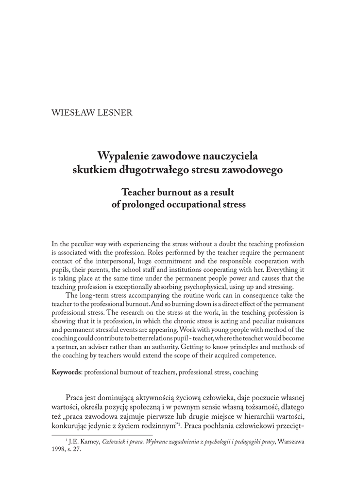 Wiesław Lesner Wypalenie zawodowe nauczyciela skutkiem długotrwałego stresu zawodowego Teacher burnout as a result of prolonged occupational stress In the peculiar way with experiencing the stress without a doubt the teaching profession is associated with the profession. Roles performed by the teacher require the permanent contact of the interpersonal, huge commitment and the responsible cooperation with pupils, their parents, the school staff and institutions cooperating with her. Everything it is taking place at the same time under the permanent people power and causes that the teaching profession is exceptionally absorbing psychophysical, using up and stressing. The long-term stress accompanying the routine work can in consequence take the teacher to the professional burnout. And so burning down is a direct effect of the permanent professional stress. The research on the stress at the work, in the teaching profession is showing that it is profession, in which the chronic stress is acting and peculiar nuisances and permanent stressful events are appearing. Work with young people with method of the coaching could contribute to better relations pupil - teacher, where the teacher would become a partner, an adviser rather than an authority. Getting to know principles and methods of the coaching by teachers would extend the scope of their acquired competence. Keywords: professional burnout of teachers, professional stress, coaching Praca jest dominującą aktywnością życiową człowieka, daje poczucie własnej wartości, określa pozycję społeczną i w pewnym sensie własną tożsamość, dlatego też „praca zawodowa zajmuje pierwsze lub drugie miejsce w hierarchii wartości, konkurując jedynie z życiem rodzinnym”. Praca pochłania człowiekowi przeciętJ.E. Karney, Człowiek i praca. Wybrane zagadnienia z psychologii i pedagogiki pracy, Warszawa 1998, s. 27. 282 Wiesław Lesner nie 1/3 życia w okresie produkcyjnym, czyli okres około 40 lat. Wyliczono, że jest to mniej więcej 100 tysięcy godzin naszej egzystencji. Praca „traktowana jest jako przejaw społecznej dojrzałości; osoba dojrzała to taka, która podejmuje aktywność zawodową i w jej efekcie potwierdza i rozwija swoje zasoby, umiejętności, możliwości, a oprócz tego otrzymuje wynagrodzenie na dobre życie”. Wybór pracy zawodowej jest wolnym wyborem człowieka i jest rozłożony w czasie (etapy edukacji). Takim, a nie innym wyborem człowiek pokazuje także swoje oczekiwania wobec życia, wobec samego siebie, definiuje, kim jest i kim chciałby być, oraz jakie miałby pełnić role w grupie społecznej. Sumując wszystkie te aspekty – praca jest formą świadomego życia. Człowiek poprzez świadome nabywanie i rozwój dyspozycji psychicznych i kompetencji przygotowuje się do realizacji pracy. Przychodzi moment podjęcia pierwszej pracy zawodowej. System wartości, oczekiwań, poglądów, wiedza nabyta, wiedza potoczna, zostają poddane trudnej próbie. Inna od oczekiwań rzeczywistość wywołuje stres. Już w latach 30. ubiegłego wieku lekarz Hans Selye prowadził badania z zakresu fizjologii. Stresem nazwał stan organizmu, na jaki składają się wszystkie niespecyficzne zmiany wywołane czynnikami szkodliwymi dla organizmu. Polski psycholog J. Strelau mianem stresu określił stan, na który składają się silne negatywne emocje oraz towarzyszące mu zmiany fizjologiczne i biochemiczne, przekraczające normalny stan pobudzenia, których przyczyną jest brak równowagi między wymaganiami a możliwościami ich spełnienia. Przy czym wymagania i możliwości mogą być zarówno subiektywne, jak i obiektywne. Stres jest „uniwersalną” odpowiedzią na trudności, czyli powstaje wtedy, kiedy człowiek nie może dać sobie rady w sytuacji, w której się znajduje i nie jest w stanie jej kontrolować. Wymagania środowiska także wywołują stres i choć jest on zjawiskiem naturalnym i jest nieuniknioną częścią życia, wymaga umiejętności przystosowania się do zmian. Jednakże, gdy stres ma charakter długotrwały, wywołuje wiele negatywnych konsekwencji. Takim długotrwałym stresem może być stres zawodowy, który jest wynikiem narastających konsekwencji wymagań stawianych pracownikowi w miejscu pracy. Określa się, że już ponad 75% czynnych zawodowo osób ocenia swoją pracę jako stresującą. Co roku na świecie rozpoznaje się od 60 do 150 milionów nowych przypadków chorób związanych z pracą zawodową. Jednym ze skutków długotrwałego stresu zawodowego jest wypalenie zawodowe. Jest to stan, który krystalizuje się powoli, przez dłuższy okres przeżywania L. Golińska, Pracoholizm, uzależnienie czy pasja, Warszawa 2009, s. 10. W. Furmanek, Zarys humanistycznej teorii pracy, Toruń 2008, s. 209–210. G. Bartkowiak, Człowiek w pracy. Od stresu do sukcesu w organizacji, Warszawa 2009, s. 10–15. N. Ogińska-Bulik, Stres zawodowy w zawodach usług społecznych. Źródła – Konsekwencje – Zapobieganie, Warszawa 2006, s. 9. Wypalenie zawodowe nauczyciela skutkiem długotrwałego stresu zawodowego 283 stałego stresu i angażowania całej potencji życiowej, i który w końcowym rezultacie wywiera zły wpływ na motywację, poglądy i zachowanie. To stan frustracji i zobojętnienia pojawiający się u osób, które w pracy intensywnie zajmują się innymi, poświęcają temu tak dużo energii psychicznej i fizycznej, że nie mają już siły i motywacji do kontynuowania swojej pracy z dotychczasową intensywnością. Zawodem związanym w sposób szczególny z doświadczaniem stresu jest niewątpliwie zawód nauczyciela. Pełnione przez pedagoga role wymagają stałego kontaktu interpersonalnego, ogromnego zaangażowania i odpowiedzialnej współpracy z uczniami, ich rodzicami, pracownikami szkoły i instytucjami z nią współpracującymi. Wszystko to odbywa się jednocześnie pod stałą presją społeczną i sprawia, że zawód nauczyciela jest niezwykle absorbu