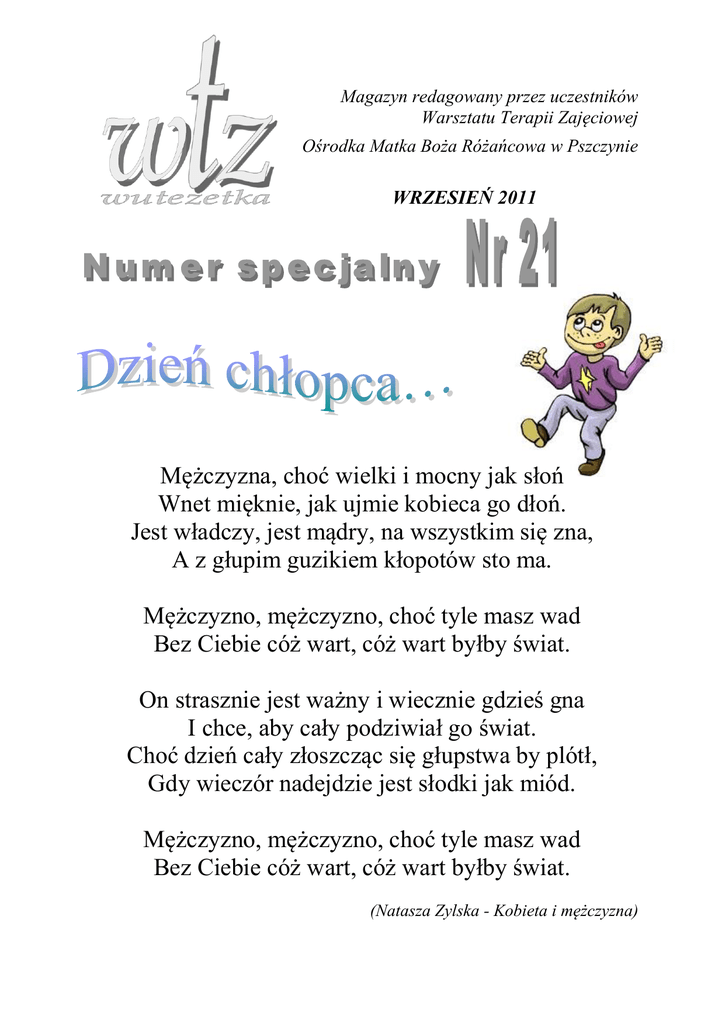 Magazyn redagowany przez uczestników Warsztatu Terapii Zajęciowej Ośrodka Matka Boża Różańcowa w Pszczynie WRZESIEŃ 2011 Mężczyzna, choć wielki i mocny jak słoń Wnet mięknie, jak ujmie kobieca go dłoń. Jest władczy, jest mądry, na wszystkim się zna, A z głupim guzikiem kłopotów sto ma. Mężczyzno, mężczyzno, choć tyle masz wad Bez Ciebie cóż wart, cóż wart byłby świat. On strasznie jest ważny i wiecznie gdzieś gna I chce, aby cały podziwiał go świat. Choć dzień cały złoszcząc się głupstwa by plótł, Gdy wieczór nadejdzie jest słodki jak miód. Mężczyzno, mężczyzno, choć tyle masz wad Bez Ciebie cóż wart, cóż wart byłby świat. (Natasza Zylska - Kobieta i mężczyzna) Michał – to człowiek dobry, skuteczny, pogodny, inteligentny, służy chętnie pomocą. Często podejmuje się działań, których nie może wykonać; sprawia wrażenie człowieka wyniosłego i zarozumiałego, ale jest to tylko forma obrony przez wścibskimi. Stanisław – ma swoje zdanie na różne sprawy, jest niezależny i nie ufa ślepo autorytetom. Sam decyduje o sobie, woli rządzić niż słuchać innych. Sprawy duchowe są dla niego ważniejsze niż materialna konieczność. Szymon – to człowiek prostolinijny, sprawiedliwy i lubiący prawdę. Jest aktywny społecznie, wrażliwy na sytuację innych ludzi. Jest osobą tajemniczą; ma stałe przekonania. To mężczyzna pogodny, potrafi traktować niektóre sytuacje z humorem. Maciej – to człowiek nerwowy, pobudliwy, szybko reagujący. Posiada tajemniczą osobowość. Życie wewnętrzne ma bogate i uporządkowane; chętnie niesie pomoc innym. Paweł – jest odważny i samodzielny, prawdomówny i uczciwy. W pracy sumiennie wykonuje powierzone zadania. Bywa kapryśny. Przemek – nie zraża się trudnościami w realizacji swoich planów. W przyjaźni jest oddany i gotowy do pomocy. Jest życzliwy dla otoczenia. Roman – ceni sobie wolność i niezależność. W jego naturze leży kierowanie innymi bardziej niż słuchanie poleceń. Zdarza mu się zarzucać innym swoje zdanie. Tomasz – osoba o tym imieniu jest człowiekiem inteligentnym, szlachetnym, kulturalnym i niezwykle subtelnym. Krzysztof – jest zmienny, raz jest spokojny raz nieznośny. Lubi podróże. Jest mężczyzną o dużej inteligencji, błyskotliwym i często potrafi wybuchnąć, gdy słuchacz nie nadąża. W życiu zawodowym popada raz w lenistwo, to znów w pracoholizm. Zbigniew – spokojny, zrównoważony, opanowany, ceni pieniądze. Jest człowiekiem czynu, ale potrzebna jest mu stała mobilizacja. Jest osobą szczerą, pogodną i uśmiechniętą. Arkadiusz – inteligentny, uzdolniony artystycznie, mało konkretny, niesłowny. Jest bardzo towarzyski. Adrian – miły, inteligentny, ambitny, towarzyski, życzliwy, koleżeński. Nigdy się nie spieszy. Zdaje się na skrupulatność i wielką sumienność. Daniel – inteligentny, subtelny, dystyngowany, czasem gadatliwy, prostolinijny, uśmiechnięty, towarzyski. Jan – idealista, lekko wrażliwy, miły, koleżeński, czarujący. Posiada wiele talentów. Czasami bywa egoistyczny. Łukasz – impulsywny, zrównoważony, trochę interesowny, zamknięty w sobie. W życiu nie podejmuje ryzyka. Jest bardzo rzetelny i ogromnie dokładny w tym, co robi. Zawsze można na nim polegać. Piotr – pracowity, organizator, trochę interesowny, dyplomata. Bardzo łatwo wyprowadzić go z równowagi. W działaniu wykazuje się dużą samodzielnością. Mariusz – mężczyzna aktywny i ruchliwy. Lubi się do wszystkiego mieszać. Chętnie i często bierze na siebie wiele odpowiedzialności. Mirosław – niezależny i dumny. Jest osobą obiektywną i sprawiedliwą, umiejącą przyznać się do błędu. W życiu mają dużo szczęścia. Czesław – lubi spokój i zgodę, jest wyrozumiały i bez reszty poświęca się rodzinie i bliskim. Andrzej – posiada naturę szczerą, niezwykle wnikliwą. Umie nie tylko inicjować przedsięwzięcia, ale również sprawnie je przeprowadzać. Jest uzdolnionym kierownikiem; chętnie radzi innym. Tekst przygotowała Dagmara 1) 2) 3) 4) 5) 6) 7) 8) 9) 10) 11) 12) 13) 14) Jest warsztatowym DJ – em. W 2011 r. w Zalotach był przebrany za hipopotama. Imię naszego kierowcy busa. Niedawno odszedł z warsztatów, redaktor naczelny naszej gazetki. Jest teraz w pracowni papieroplastyki, a wcześniej był w pracowni technicznej. 6. Jeden z opiekunów, trener na zawodach sportowych w Suszcu. 7. Należy do pracowni ogrodniczej, bardzo lubi zadawać innym zadania do liczenia. 8. Imię brata Piotra Kościelnego, uczęszcza na zajęcia w Ośrodku. 9. Jest w redakcji gazetki, na co dzień jest w pracowni u pani Kasi. 10.W 2011 r. w Zalotach był przebrany za Żuczka. 11.Na Bielskim Festiwalu Twórczości Teatralnej i Muzycznej Osób Niepełnosprawnych „Zadymka Jesienna 2010” wraz z Kubą, Moniką, Pawłem, Anią i Łukaszem zajął 1miejsce w kategorii: piosenka grupowa. 12.Imię księdza – założyciela naszego Ośrodka. 13.Prowadził zawody w Pszczynie i w Suszcu, także imię dyrektora Ośrodka. 14.Napisał artykuł o finale zawodów w Suszcu. 1. 2. 3. 4. 5. Krzyżówkę przygotowała Magda Klimek Torcik Składniki: Biszkopt: 8 jajek 1,5 szklanki mąki 2 łyżki kakao 2 łyżki octu 2 łyżeczki proszku do pieczenia Masa I: Dżem brzoskwiniowy Galaretka pomarańczowa Masa II: Opakowanie Śnieżki w proszku Galaretka wiśniowa Przepis przygotowała Ola Herok Jaki rodzaj sportu mężczyźni najchętniej uprawiają na plaży? Wciąganie brzucha na widok każdej młodej dziewczyny w bikini. Wykonanie: Upiec biszkopt i przekroić na 3 części. Nasączyć. Podgrzać dżem i wsypać suchą galaretkę, podgrzewać aż galaretka się rozpuści, przestudzić lekko i wyłożyć na ciasto. Na to położyć następny kawałek ciasta i śnieżkę ubitą wg przepisu z galaretką rozpuszczoną w ½ szklanki wody. Na to położyć kolejne ciasto i ozdobić według swojej fantazji. C