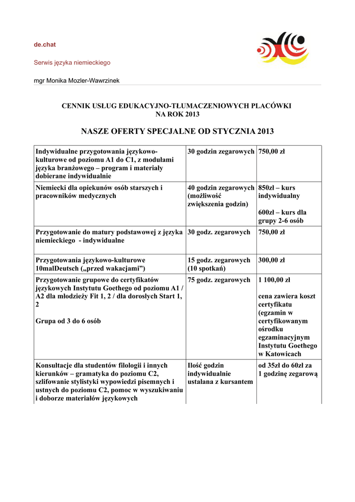 de.chat Serwis języka niemieckiego mgr Monika Mozler-Wawrzinek CENNIK USŁUG EDUKACYJNO-TŁUMACZENIOWYCH PLACÓWKI NA ROK 2013 NASZE OFERTY SPECJALNE OD STYCZNIA 2013 Indywidualne przygotowania językowokulturowe od poziomu A1 do C1, z modułami języka branżowego – program i materiały dobierane indywidualnie 30 godzin zegarowych 750,00 zł Niemiecki dla opiekunów osób starszych i pracowników medycznych 40 godzin zegarowych 850zł – kurs (możliwość indywidualny zwiększenia godzin) 600zł – kurs dla grupy 2-6 osób Przygotowanie do matury podstawowej z języka 30 godz. zegarowych niemieckiego - indywidualne 750,00 zł Przygotowania językowo-kulturowe 10malDeutsch („przed wakacjami”) 300,00 zł 15 godz. zegarowych (10 spotkań) Przygotowanie grupowe do certyfikatów 75 godz. zegarowych językowych Instytutu Goethego od poziomu A1 / A2 dla młodzieży Fit 1, 2 / dla dorosłych Start 1, 2 Grupa od 3 do 6 osób 1 100,00 zł cena zawiera koszt certyfikatu (egzamin w certyfikowanym ośrodku egzaminacyjnym Instytutu Goethego w Katowicach Konsultacje dla studentów filologii i innych Ilość godzin od 35zł do 60zł za kierunków – gramatyka do poziomu C2, indywidualnie 1 godzinę zegarową szlifowanie stylistyki wypowiedzi pisemnych i ustalana z kursantem ustnych do poziomu C2, pomoc w wyszukiwaniu i doborze materiałów językowych de.chat Serwis języka niemieckiego mgr Monika Mozler-Wawrzinek KURSY OD WRZEŚNIA 2013 Kursy grupowe języka niemieckiego ogólnego „Praktyczna komunikacja w jęz. niemieckim” poziom A1 / A2 Grupa od 3 do 6 osób 60 godz. zegarowych (30 tygodni) 1050,00 zł Kursy grupowe języka niemieckiego ogólnego „Praktyczna komunikacja w jęz. niemieckim” poziom B1 / B2 Grupa od 3 do 6 osób 60 godz. zegarowych (30 tygodni) 1 200,00 zł Kursy grupowe języka niemieckiego ogólnego „Praktyczna komunikacja w jęz. niemieckim” poziom C1 Grupa od 3 do 6 osób 60 godz. zegarowych (30 tygodni) 1 200,00 zł Kursy indywidualne języka niemieckiego „Praktyczna komunikacja na co dzień i w zawodzie” poziom A1 / A2 – pod kątem zawodu kursanta Ilość godzin dobierana przez kursanta od 15zł do 30zł za godzinę zegarową (cena uzależniona jest od ilość wykupionych godzin – im więcej tym ekonomiczniej) Kursy indywidualne i grupowe języka 75 godzin niemieckiego w zawodzie „Praktyczna zegarowych komunikacja w jęz. niemieckim” poziom A1 / A2 – pod kątem wybranego profilu zawodowego zakończone certyfikatem Instytutu Goethego 1 200,00 zł Przygotowanie grupowe do certyfikatów językowych Instytutu Goethego od poziomu B1 / B2 Grupa od 3 do 6 osób 1 200,00 zł 75 godz. zegarowych bez kosztu certyfikatu Przygotowanie grupowe do egzaminu DSH 75 godz. zegarowych (egzamin zdawany przez studentów zagranicznych na uczelniach niemieckich) Grupa od 3 do 6 osób Przygotowanie indywidualne do certyfikatów językowych Instytutu Goethego od poziomu B1 / cena zawiera koszt certyfikatu (egzamin w certyfikowanym ośrodku egzaminacyjnym Instytutu Goethego w Katowicach 1 300,00 zł 65 godz. zegarowych* 1h = 25zł de.chat Serwis języka niemieckiego mgr Monika Mozler-Wawrzinek B2 Przygotowanie indywidualne do egzaminu DSH 65 godz. zegarowych* 1h = 30zł Przygotowanie do matury rozszerzonej z języka niemieckiego 60 godz. zegarowych 900,00 zł (1h = 15zł) TŁUMACZENIA I KOREKTY Korekta gramatyczno-stylistyczna tekstów w języku niemieckim 1 strona = 1800 znaków ze spacjami 10,00 zł Powyżej 20 stron: 8,00 zł Tłumaczenia zwykłe z jęz. polskiego na niemiecki (artykuły, teksty użytkowe, teksty fachowe z różnych dziedzin nie wymagające zaprzysiężenia) 1 strona = 1800 znaków ze spacjami 40,00 zł Tłumaczenia zwykłe z jęz.niemieckiego na polski (artykuły, teksty użytkowe, teksty fachowe z różnych dziedzin nie wymagające zaprzysiężenia) 1 strona = 1800 znaków ze spacjami 35,00 zł CENY KURSÓW ZAWIERAJĄ KOSZT MATERIAŁÓW I PODRĘCZNIKÓW MIELIŚMY DO TEJ PORY TYLKO UCZCIWYCH KLIENTÓW, DLATEGO OBDARZAMY KAŻDEGO ZAUFANIEM I ZWYCZAJOWO NIE POBIERAMY ZALICZEK – WIERZYMY, ŻE TEGO ZAUFANIA I W KOLEJNYM ROKU NIKT NIE ZAWIEDZIE Z KURSANTEM PODPISUJEMY RZETELNĄ UMOWĘ O WZAJEMNEJ WSPÓŁPRACY PŁATNOŚCI ZA KURSY DŁUGOTERMINOWE I O WIĘKSZEJ ILOŚCI GODZIN MOŻNA ROZŁOŻYĆ NA DWIE RATY