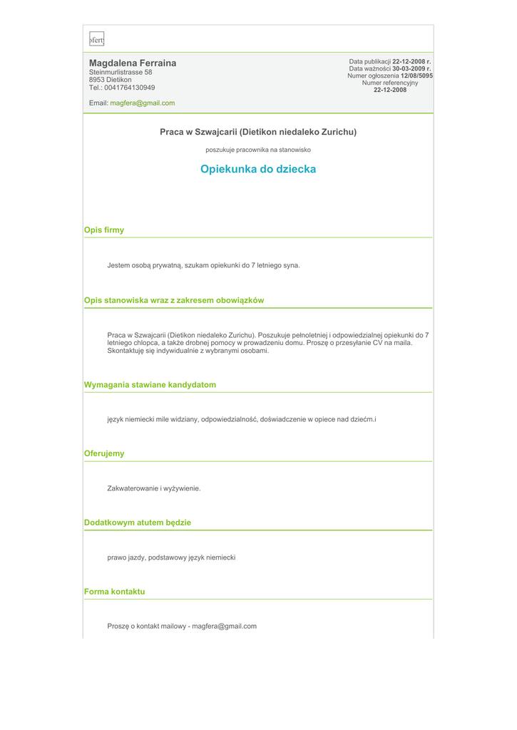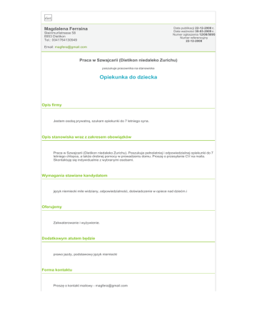 praca, oferty pracy Data publikacji 22-12-2008 r. Data ważności 30-03-2009 r. Numer ogłoszenia 12/08/5095 Numer referencyjny 22-12-2008 Magdalena Ferraina Steinmurlistrasse 58 8953 Dietikon Tel.: 0041764130949 Email: [email protected] Praca w Szwajcarii (Dietikon niedaleko Zurichu) poszukuje pracownika na stanowisko Opiekunka do dziecka Opis firmy Jestem osobą prywatną, szukam opiekunki do 7 letniego syna. Opis stanowiska wraz z zakresem obowiązków Praca w Szwajcarii (Dietikon niedaleko Zurichu). Poszukuje pełnoletniej i odpowiedzialnej opiekunki do 7 letniego chlopca, a także drobnej pomocy w prowadzeniu domu. Proszę o przesyłanie CV na maila. Skontaktuję się indywidualnie z wybranymi osobami. Wymagania stawiane kandydatom język niemiecki mile widziany, odpowiedzialność, doświadczenie w opiece nad dziećm.i Oferujemy Zakwaterowanie i wyżywienie. Dodatkowym atutem będzie prawo jazdy, podstawowy język niemiecki Forma kontaktu Proszę o kontakt mailowy - [email protected] Informacje dodatkowe Minimalne wykształcenie: średnie Branża: Opieka nad dziećmi i domem Forma zatrudnienia: zlecenie Wymiar pracy: pełny etat Wynagrodzenie (netto): do uzgodnienia Lokalizacja: zagranica Województwo: Miejsce pracy miasto(a) lub kraj(e): Szwajcaria Prawo jazdy: Znajomość języka obcego: tak Ogłoszenie pochodzi z portalu www.i-praca.pl - Internetowy Portal Pracy ilość wyświetleń: 3801