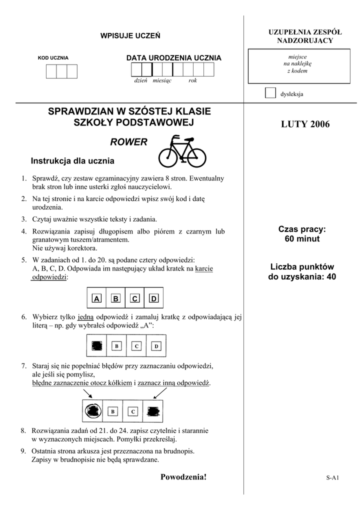 UZUPEŁNIA ZESPÓŁ NADZORUJĄCY WPISUJE UCZEŃ DATA URODZENIA UCZNIA KOD UCZNIA dzień miesiąc miejsce na naklejkę z kodem rok dysleksja SPRAWDZIAN W SZÓSTEJ KLASIE SZKOŁY PODSTAWOWEJ LUTY 2006 ROWER Instrukcja dla ucznia 1. Sprawdź, czy zestaw egzaminacyjny zawiera 8 stron. Ewentualny brak stron lub inne usterki zgłoś nauczycielowi. 2. Na tej stronie i na karcie odpowiedzi wpisz swój kod i datę urodzenia. 3. Czytaj uważnie wszystkie teksty i zadania. 4. Rozwiązania zapisuj długopisem albo piórem z czarnym lub granatowym tuszem/atramentem. Nie używaj korektora. 5. W zadaniach od 1. do 20. są podane cztery odpowiedzi: A, B, C, D. Odpowiada im następujący układ kratek na karcie odpowiedzi: A B C Czas pracy: 60 minut Liczba punktów do uzyskania: 40 D 6. Wybierz tylko jedną odpowiedź i zamaluj kratkę z odpowiadającą jej literą – np. gdy wybrałeś odpowiedź „A”: 7. Staraj się nie popełniać błędów przy zaznaczaniu odpowiedzi, ale jeśli się pomylisz, błędne zaznaczenie otocz kółkiem i zaznacz inną odpowiedź. 8. Rozwiązania zadań od 21. do 24. zapisz czytelnie i starannie w wyznaczonych miejscach. Pomyłki przekreślaj. 9. Ostatnia strona arkusza jest przeznaczona na brudnopis. Zapisy w brudnopisie nie będą sprawdzane. Powodzenia! S-A1