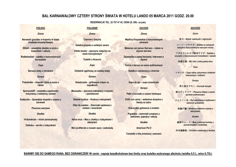 BAL KARNAWAŁOWY CZTERY STRONY ŚWIATA W HOTELU LANDO 05 MARCA 2011 GODZ. 20.00 REZERWACJE TEL. 22 757 47 42, CENA ZŁ 299,- za parę PÓŁNOC POŁUDNIE ZACHÓD WSCHÓD Zimne Zimne Zimne Zimne Norweski gravlaks w koperku w sosie miodowo-musztardowym Caprese z bazylią Wędliny hiszpańskie z marynowanymi oliwkami 寿司 – Wybór makizushi i nigirizushi Dillsill – szwedzkie śledzie w occie z koperkiem i cebulą Sałatka szopska z solonym serem Vitello tonato – pieczona cielęcina na sosie tuńczykowym Melones con jamon Serrano – melon w szynce serrano Rodbetsallad – sałatka z marynowanych buraczków Tzatziki z focaccio Quesadilla z pastą fasolową i bekonem z dipami Zupa Zupa Terina z dorsza na sosie szafranowym Barszcz biały z chrzanem Chłodnik ogórkowy ze świeżą miętą Sałatka z ciecierzycy z chorrizo Gorące Gorące Zupa Fiskeboller – klopsiki rybne w sosie z raków Kebebczeta – grillowane mięso na szpadkach Sopa de ajo – zupa czosnkowa Sjomansbiff – szwedzka zapiekanka marynarzy z wołowiną i piwem Moussaka – pieczone bakłażany z mięsem i pomidorami Kottbullar – Szwedzkie klopsiki z sosem z borówek Sebzeli kuskus – Kuskus z warzywami Pieczone warzywa Otlar ile patates – Ziemniaki opiekane z ziołami i czosnkiem Słodkie Słodkie Vinbarskram – kisiel porzeczkowy Helva mus – Mus z chałwy z rodzynkami i daktylami Ostkaka – sernik z rodzynkami Mini profiterole z musem ouzo i czekoladą Gorące シーフードサラダ – Sałatka ze świeżych warzyw z marynowanymi owocami morza アボカドとわさび海老サラダ – Sałatka z avocado z marynowanymi krewetkami i wasabi 味噌豆腐 – Ser tofu z ostrą pastą miso Zupa レモン汁 – Zupa rybna cytrynowa z mlekiem kokosowym i imbirem Gorące 照り焼きチキン – Kurczak teriyaki Pałki z kurczaka z sosem barbeque 焼きティラピア – Pieczona tilapia z sosem porowo-szafranowym Chilli con carne – wołowina duszona z fasolą na ostro ジャスミン米 – Ryż jaśminowy z szafranem i zielonym groszkiem Kukurydza gotowana z masłem 油揚げ麺 – Smażony makaron sojowy z warzywami Papateka – ziemniaki smażone z bekonem, papryką i cebulą Słodkie American Pie 9 Słodkie 緑茶のムース – Mus z zielonej herbaty z pomarańczami i czekoladą 的幸運餅乾 – Chińskie ciasteczka z wróżbą Tartoletki z bitą śmietaną i owocami BAWIMY SIĘ DO SAMEGO RANA, BEZ OGRANICZEŃ! W cenie - napoje bezalkoholowe bez limitu oraz butelka wybranego alkoholu (wódka 0,5 L, wino 0,75L)
