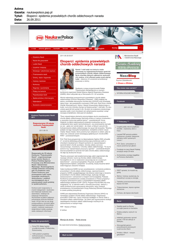 Astma Gazeta: naukawpolsce.pap.pl Tytu³: Eksperci: epidemia przewlek³ych chorób oddechowych narasta Data: 26.09.2011 o nas strona główna kontakt forum PAP Newsletter RSS English Szukaj: Dwa leki doustne pozwol Dziedziny Nauki Nauka dla gospodarki Ludzie Nauki 2011-09-26 00:07 Eksperci: epidemia przewlekłych chorób oddechowych narasta Uczelnie i instytuty Nawet 1 mld ludzi na świecie może chorować na najpowszechniejsze spośród przewlekłych chorób układu oddechowego. Są to choroby których całkowicie wyleczyć nie można, a ich ofiarami pada coraz więcej ludzi - mówiono 23 września na konferencji prasowej w stolicy. Edukacja i szkolnictwo wyższe Finansowanie nauki Granty, staże i stypendia Imprezy naukowe Polacy na świecie Popularyzacja nauki Społeczeństwo informacyjne Kalendarium Szukanie zaawansowane Konkurs Popularyzator Nauki 2011 Rozpoczynamy VII edycję konkursu Popularyzator Nauki 2011-09-19 Rozpoczęła się VII edycja Konkursu "Popularyzator Nauki", organizowanego przez serwis Nauka w Polsce Polskiej Agencji Prasowej oraz Ministerstwo Nauki i Szkolnictwa Wyższego. Rozstrzygnięcie nastąpi podczas uroczystej gali na przełomie roku. Celem konkursu jest promowanie ludzi nauki, zespołów naukowych, dziennikarzy i redakcji, wyróżniających się w popularyzacji nauki polskiej w społeczeństwie. Konkurs jest rozgrywany w d wóch kategoriach: naukowiec lub instytucja naukowa oraz dziennikarz, redakcja lub instytucja nienaukowa. Wyróżniane są także najlepsze prezentacje podczas festiwali nauki. W tym roku po raz drugi postanowiliśmy wyróżnić także najaktywniejszych rzeczników uczelni i instytucji naukowych, dzięki którym media uzyskują wiele ciekawych informacji. Nauka dla gospodarki Firma PZL Mielec będzie w s półpracowała z Politechniką Rzeszowską 1400 polskich projektów dofinansowano z funduszy norweskich i EOG Szymon Zdziebłowski > Chaos u Sfinksa Konkursy Nagrody i wyróżnienia Spotkanie z prasą zorganizowało Polskie Towarzystwo Alergologiczne w ramach konferencji organizacji Global Alliance Against Respiratory Diseases (GARD), która odbywało się w Warszawie 23 i 24 września. Wśród najbardziej powszechnych przewlekłych chorób układu oddechowego (Chronic Respiratory Diseases - CRD) znajdują się astma, przewlekła obturacyjna choroba płuc (POChP) oraz przewlekły nieżyt nosa. Jak powiedział w rozmowie z PAP prof. Piotr Kuna z Kliniki Chorób Wewnętrznych, Astmy i Alergii Uniwersytetu Medycznego w Łodzi, na te trzy choroby choruje na świecie ponad 1 mld ludzi. Co roku umiera spośród nich ponad 4 mln. Do dziś nie znaleziono skutecznego sposobu walki z tymi chorobami ani zahamowania wysokiej i wciąż rosnącej śmiertelności, która jest ich skutkiem. "Dwa najważniejsze elementy przyczyniające się do powstawania chorób układu oddechowego stanowią zmiany w naszym środowisku i w sposobie życia oraz palenie tytoniu" - powiedział prof. Kuna. Wyjaśnił, że takimi niekorzystnymi zmianami środowiska są m.in. zwiększenie ilości spalin samochodowych, czy przenoszenie się ludzi ze wsi - gdzie żyli wśród zieleni - do miast, w których warunki dla funkcjonowania układu oddechowego nie są już tak korzystne. "Musimy podejść do tego niezwykle kompleksowo, kompletnie zmienić nasze miasta. Nasze miasta i domy powinny być zatopione w zieleni, tylko to może nas uratować przed narastającą epidemią tych chorób (CRD PAP)" - powiedział ekspert. Prof. Piotr Kuna przypomniał, że Zgromadzenie Ogólne ONZ uchwaliło 21 września deklarację polityczną dotyczącą światowej walki z chorobami niezakaźnymi. Ekspert wymienił, że najważniejszymi spośród takich chorób są kolejno: choroby układu sercowonaczyniowego, nowotwory i choroby układu oddechowego. "To są na świecie trzy najważniejsze przyczyny zgonów" - powiedział ekspert. Zaznaczył jednak że spośród nich tylko chorób układu oddechowego nie daje się skutecznie leczyć. "Musimy pracować nad świadomością tego, jakim zagrożeniem dla naszego zdrowia i życia są choroby układu oddechowego. Szczególnie że one w większości zaczynają się we wczesnym dzieciństwie" - zaznaczył specjalista. Przyznał, że jeśli CRD diagnozowane będzie u pacjentów wcześniej, koszty leczenia takich osób mogą być znacznie mniejsze. Celem konferencji GARD ma być przedstawienie i omówienie problemu przewlekłych chorób układu oddechowego, zaprezentowanie programu GARD uwzględniającego rolę lekarza rodzinnego w leczeniu przewlekłych chorób układu oddechowego, dyskusję nad jego dostosowaniem i wdrożeniem w krajach Unii Europejskiej. Podczas Konferencji przedstawione zostały prowadzone w Polsce programy i inicjatywy pośw ięcone walce z przewlekłymi chorobami układu oddechowego (badanie ECAP i GATS, Program POLASTMA oraz inne osiągnięcia, np. w zakresie walki z chorobą tytoniową). Jednym z celów konferencji jest opracowanie dokumentu, który zostanie przedstawiony na posiedzeniach Grupy Roboczej Zdrowia Publicznego w czasie polskiej prezydencji. Czy znasz nasz serwis? WYGRAJ KOLEJNE NAGRODY! Facebook 2011-01-25 *** Polecamy *** Cząstki pobiły rekord prędkości światła – naukowcy zbici z tropu Laureat FNP pomoże polskim hodowcom uzyskać ulepszone odmiany roślin uprawnych (uzup.) Prof. Żylicz: priorytetem w nauce powinna być jakość Fundacja na rzecz Nauki Polskiej św iętuje swoje 20-lecie Archeolodzy szukają megalitów na Pomorzu Zachodnim Ciekawostki DEET sprawia, że muszki się gubią Słońce i kokosy wystarczą, by zaopatrzyć wyspę w energię Tabletka przeciwzmarszczkowa lepsza niż krem Trójwymiarowe, lepsze ogniwa słoneczne GARD jest odpowiedzią Światowej Organizacji Zdrowia (WHO) na narastający problem chorób układu oddechowego. Organizacja powstała w 2006 roku. Łączy instytucje działające w sferze walki z chorobami układu oddechowego. Jej celem jest wypracowanie strategii zapobiegania 